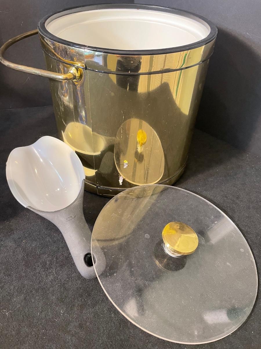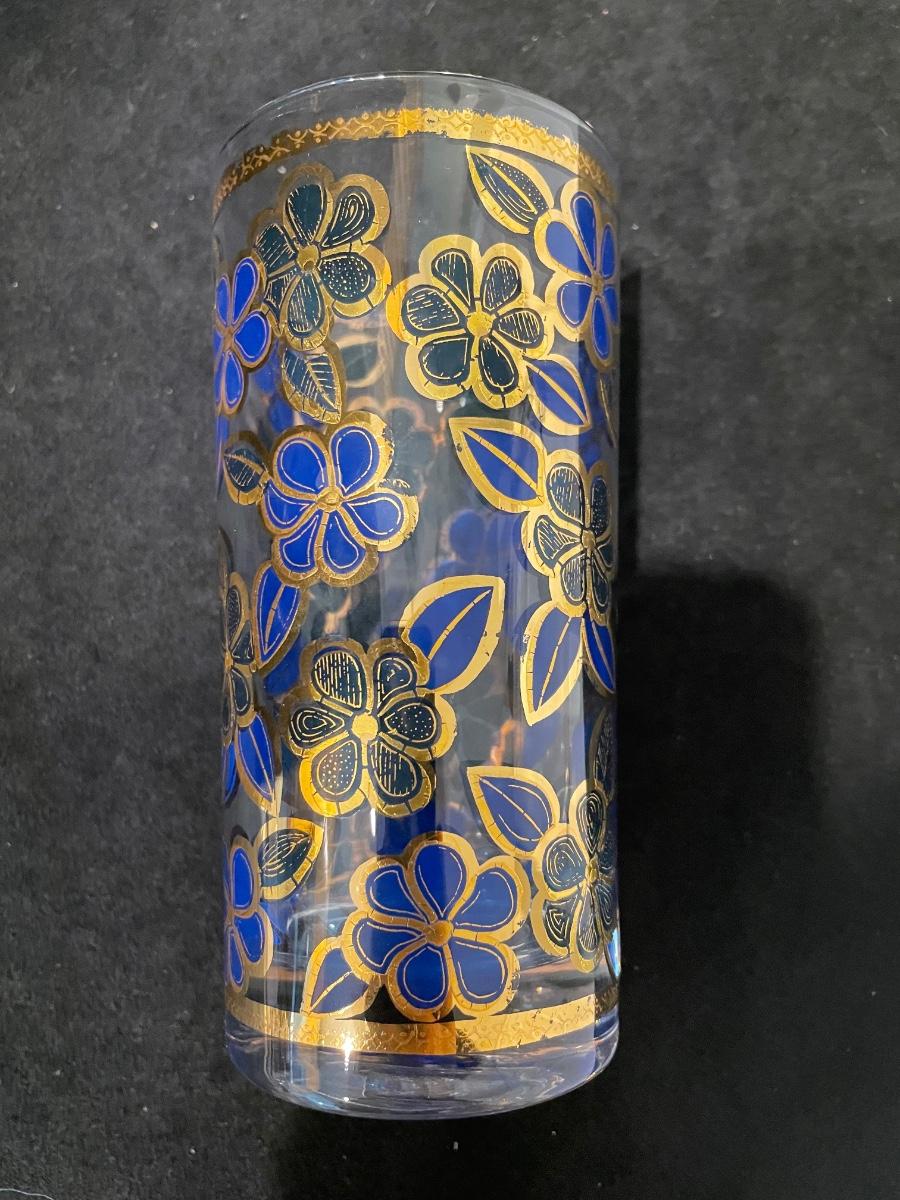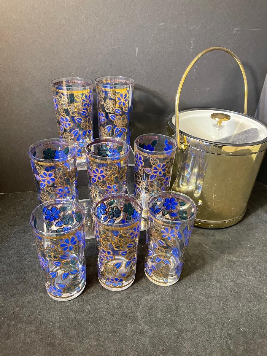 Includes set of 6 Blue and Gold Highball glasses with a gold Ice bucket.