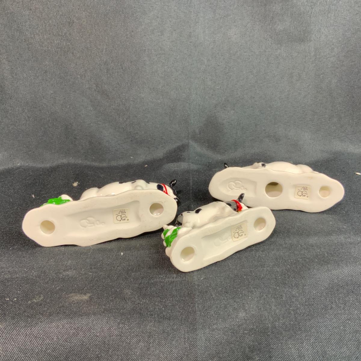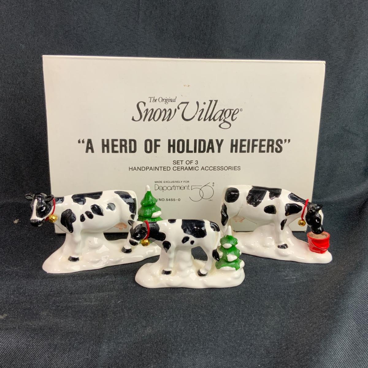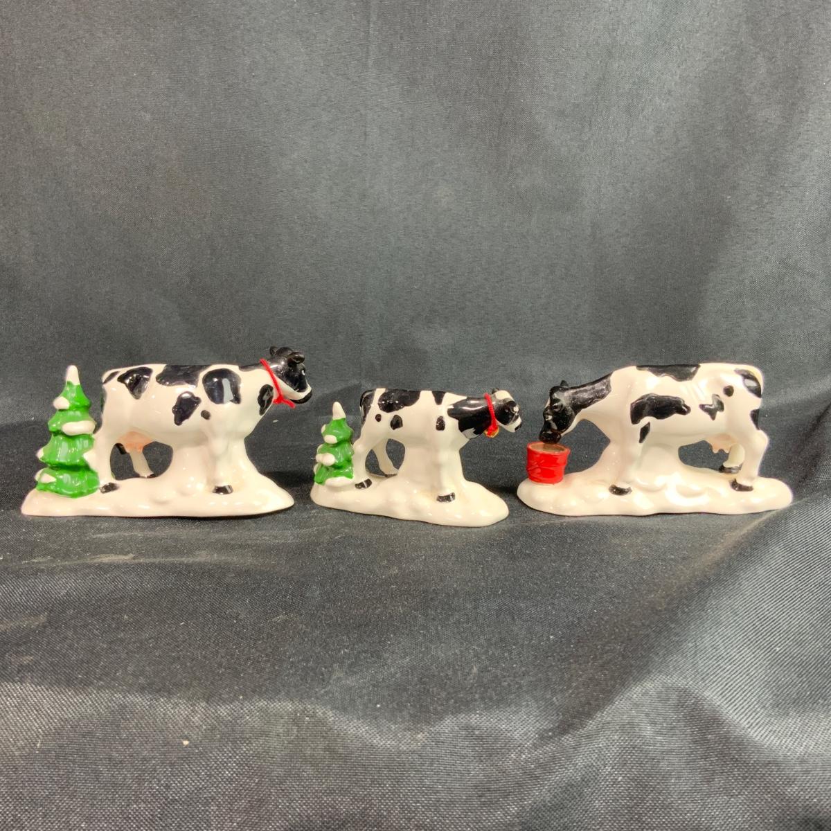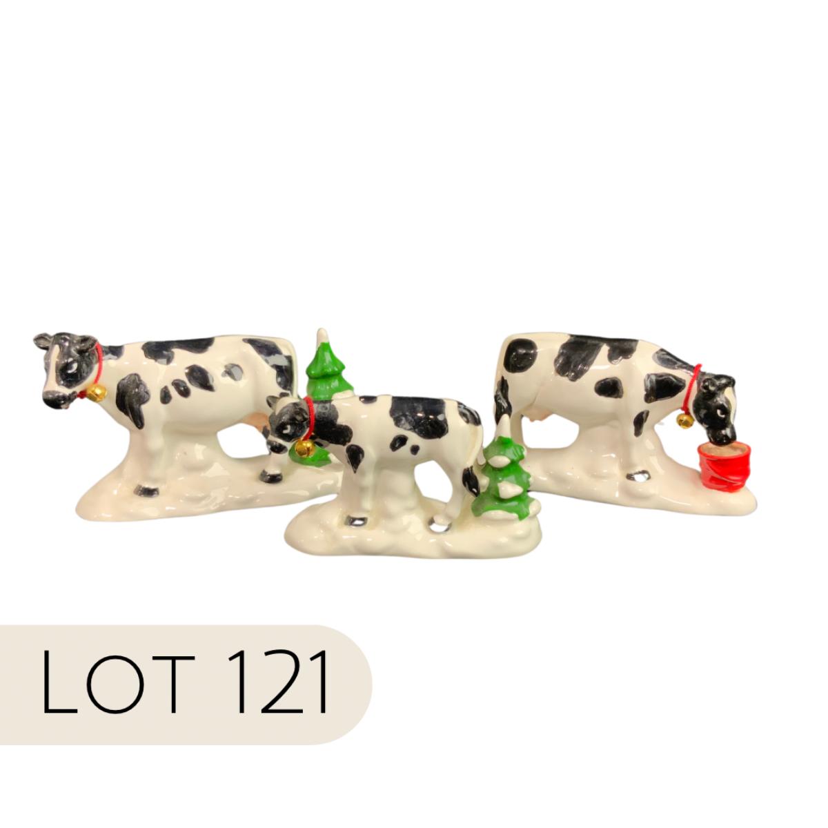 A Herd of Holidays Heifers is what the kids used to call the cows on Christmas. I bet you thought that was going to be a fat joke. Shame on you. Honestly though this trio of bovine is really cute. They’re in good used condition. The knot on the one cow bell came undone mid-photo shoot, but it’s on my to do list for you, dear bidder! Please see photos for details and condition. ::: Shipping is available on this lot. If you require shipping you must let us know at the close of the auction. We will coordinate with you after the item has been won. Shipping fees will include insurance up to or exceeding the value of all items being mailed. If you have any questions regarding this lot please contact the auctioneer either via this website, by direct email or by phone. PICK UP TIMES and other important information can be found in the TERMS and DESCRIPTION of the auction. Please take a look for pertinent information. Thanks! Any condition statement is given as a courtesy to a client, is an opinion, and should not be treated as a statement of fact. Reference to condition written, oral or within a condition report shall not be regarded as a full account of condition and may not include all defects, alterations, or restorations. Absence of a condition report does not imply a lot is flawless or lacking imperfections or damage. Katherine’s Auction & Appraisal Service shall have no responsibility for any error or omission. Returns shall not be accepted on the basis of condition.