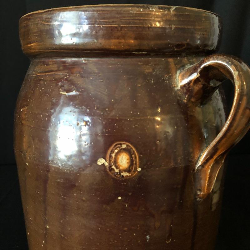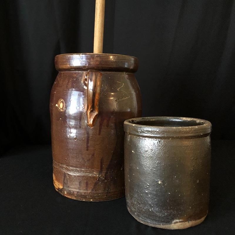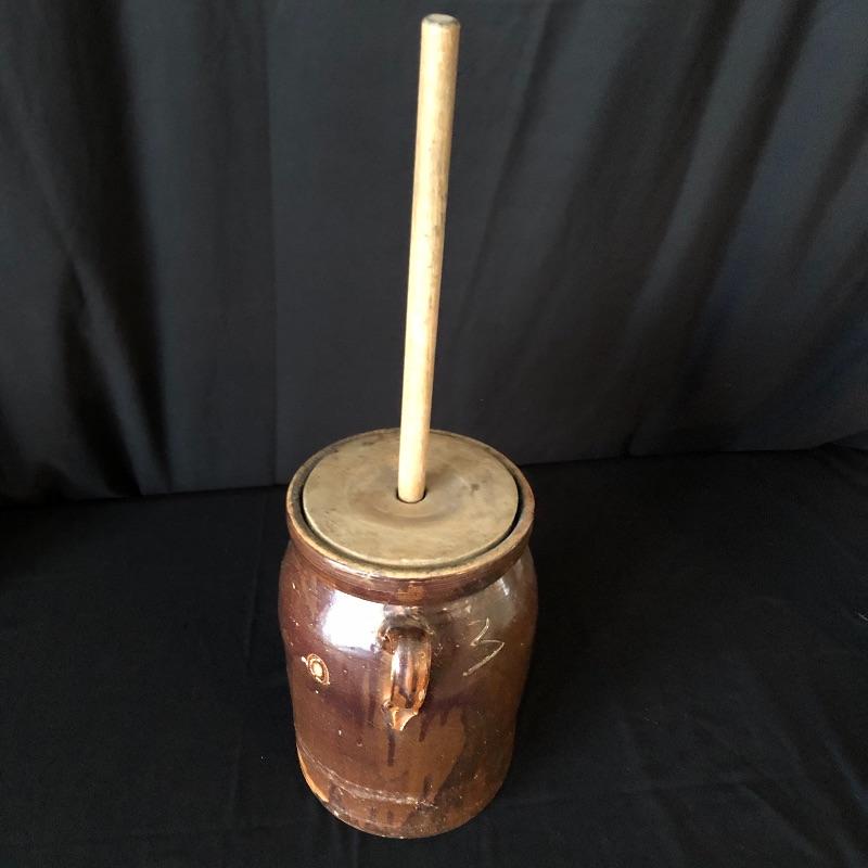 This antique butter churn has some weight to it and is glazed inside and out. The complimentary crock, also glazed inside and out is perfect for the beautiful end product. Both show the blemishes of a life well lived, please see photos. Butter churn measures 11 x 8 x 28 fully assembled. Local pick up