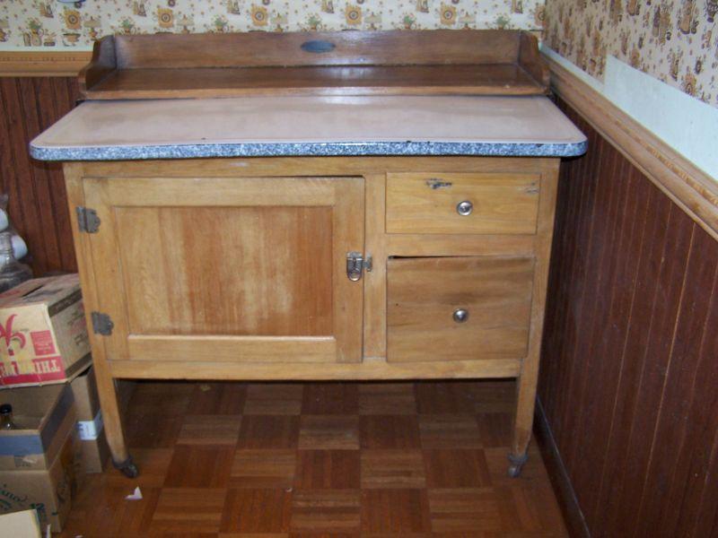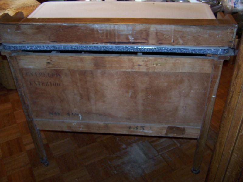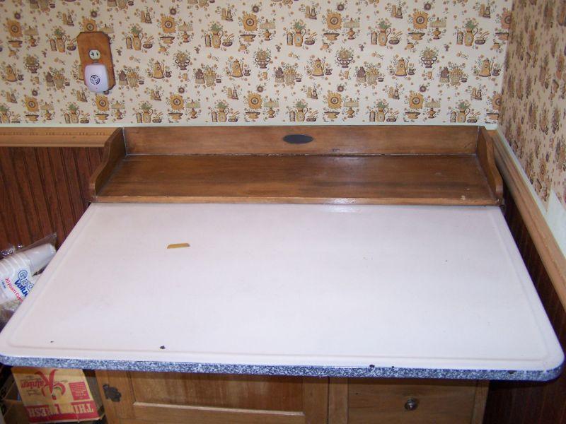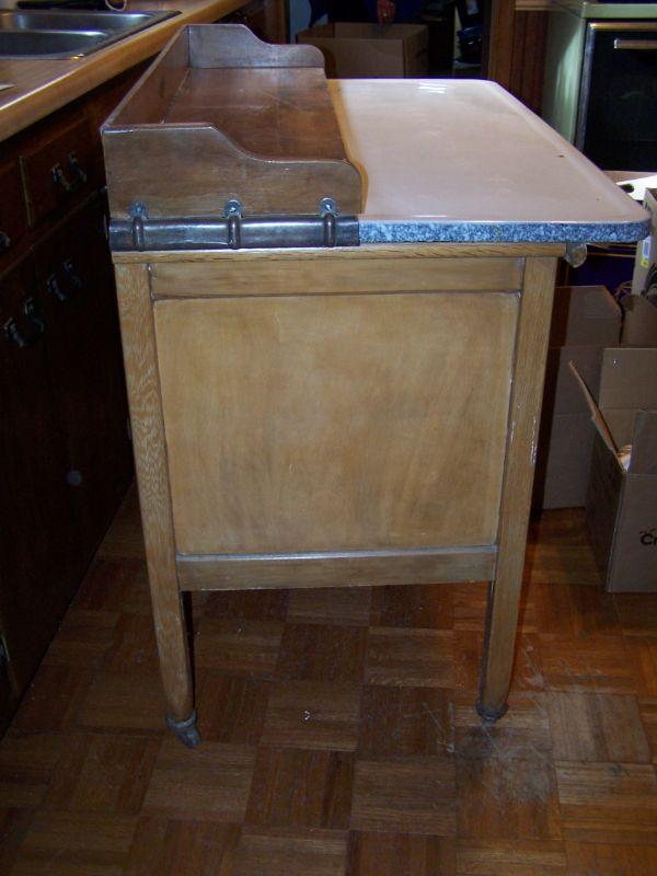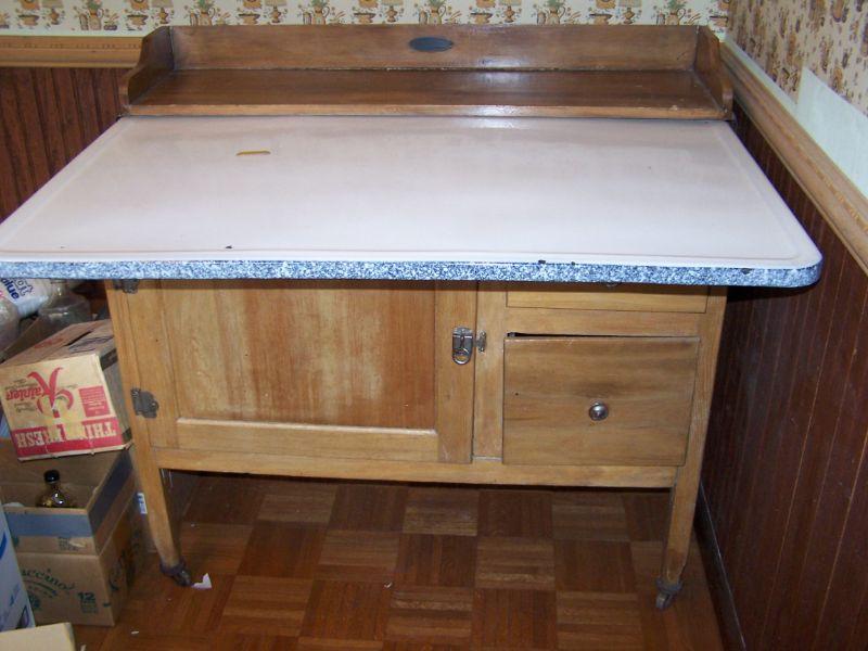 SLIDE OUT ADJUSTABLE ENAMELED TOPPED HOOSIER TYPE CABINET. SELLERS & SONS CO.