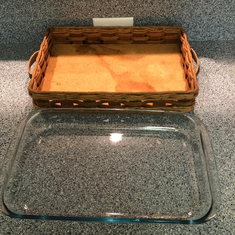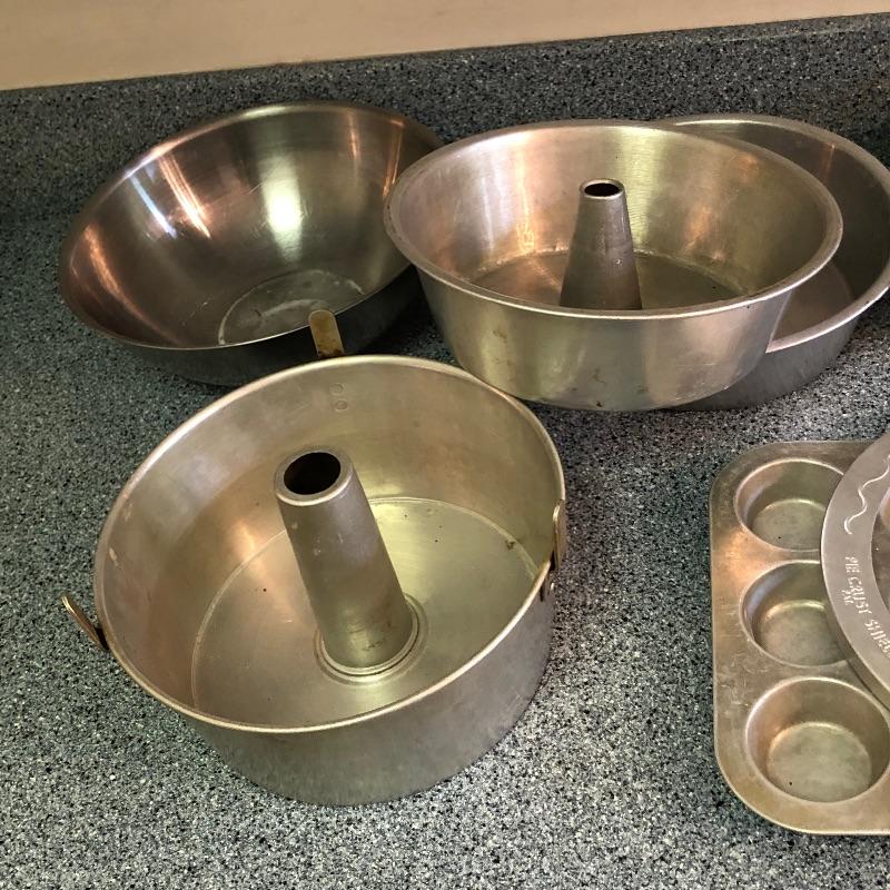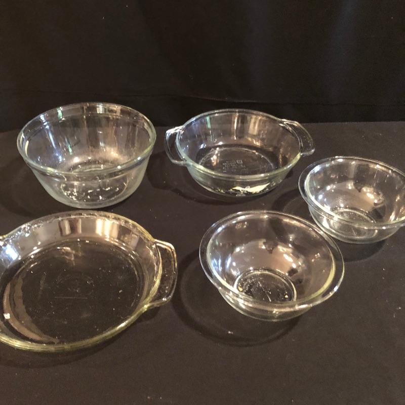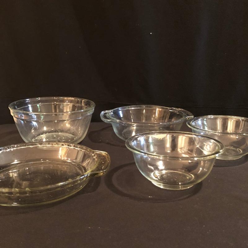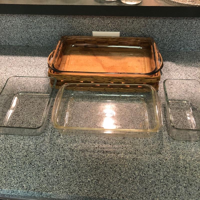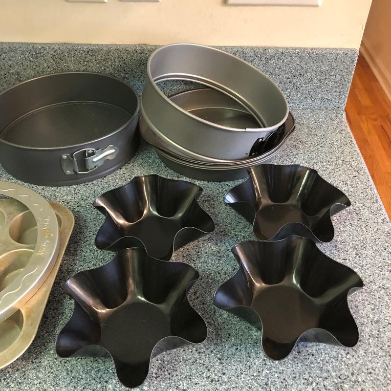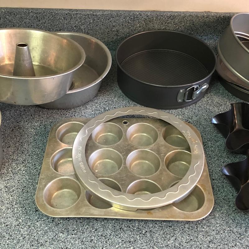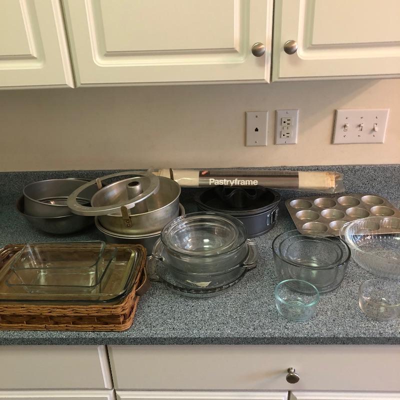 Lots of items to check out here for the cooks kitchen! Bakers will love the pastry frame, 3 Bundt pans, cake tins, pastry molds, pie crust shield and more as well as a stack of Pyrex, Anchor and more glass bowls. Also included is an assortment of glass casserole dishes, one of which has a basket tray with handles. See images for more information.