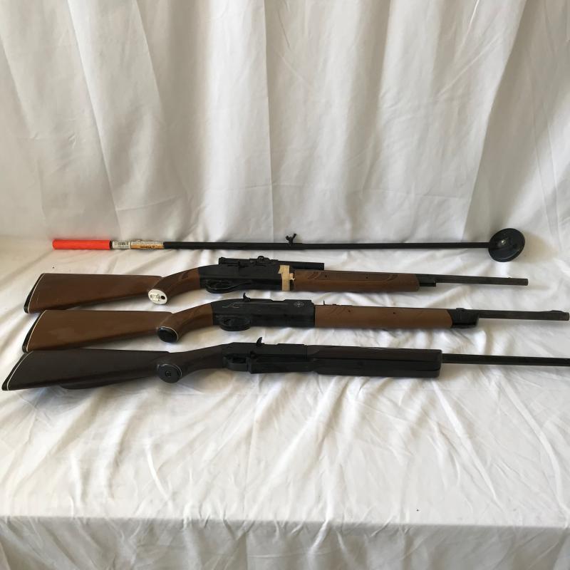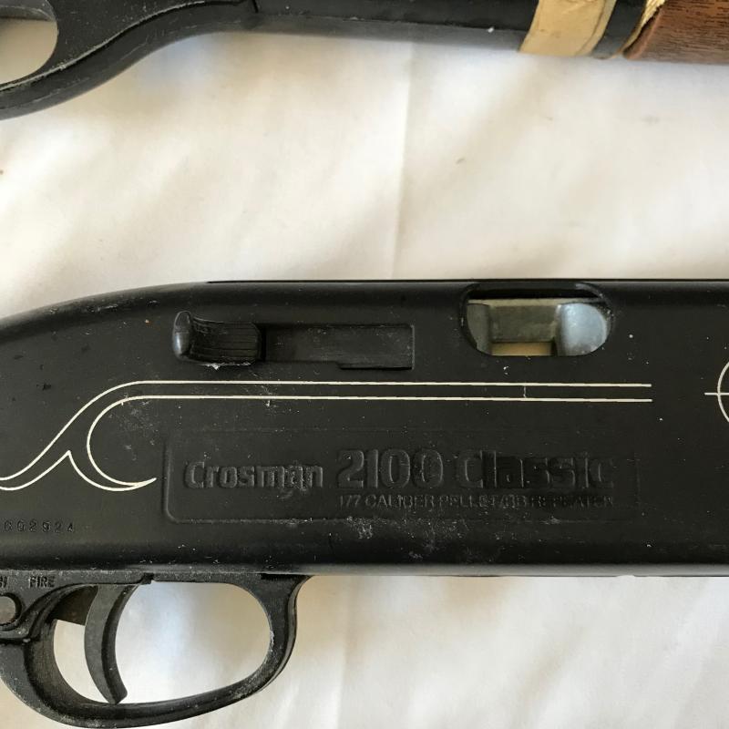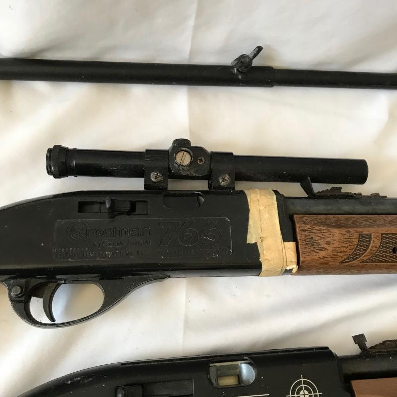 Collection of three BB or Pellet guns. One is a Crosman 2100 Classic .177 Caliber BB / Pellet Repeater. One is a Crosman 766 with .177 Cal Pellet / BB Repeater with a mounted scope. (Has some tape on it but seems fine). Third one is a Daisy Powerline 880 with .177 Cal(4.5mm). Lot also includes magnetic pick up tool. No shipping. Local pick up only.