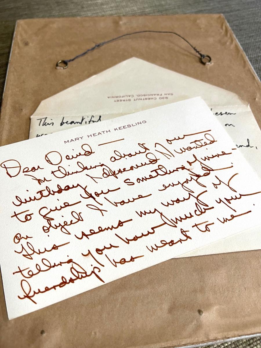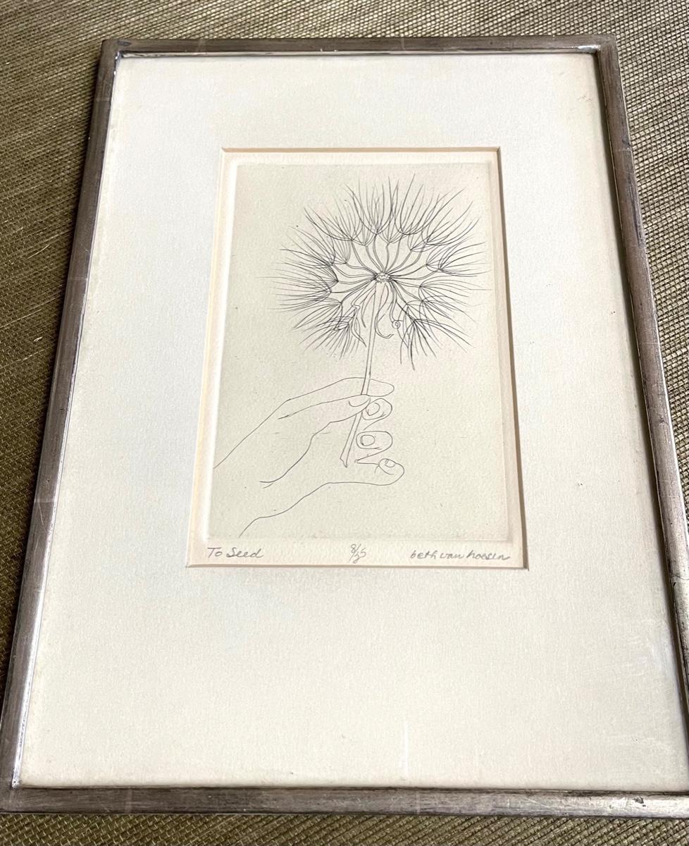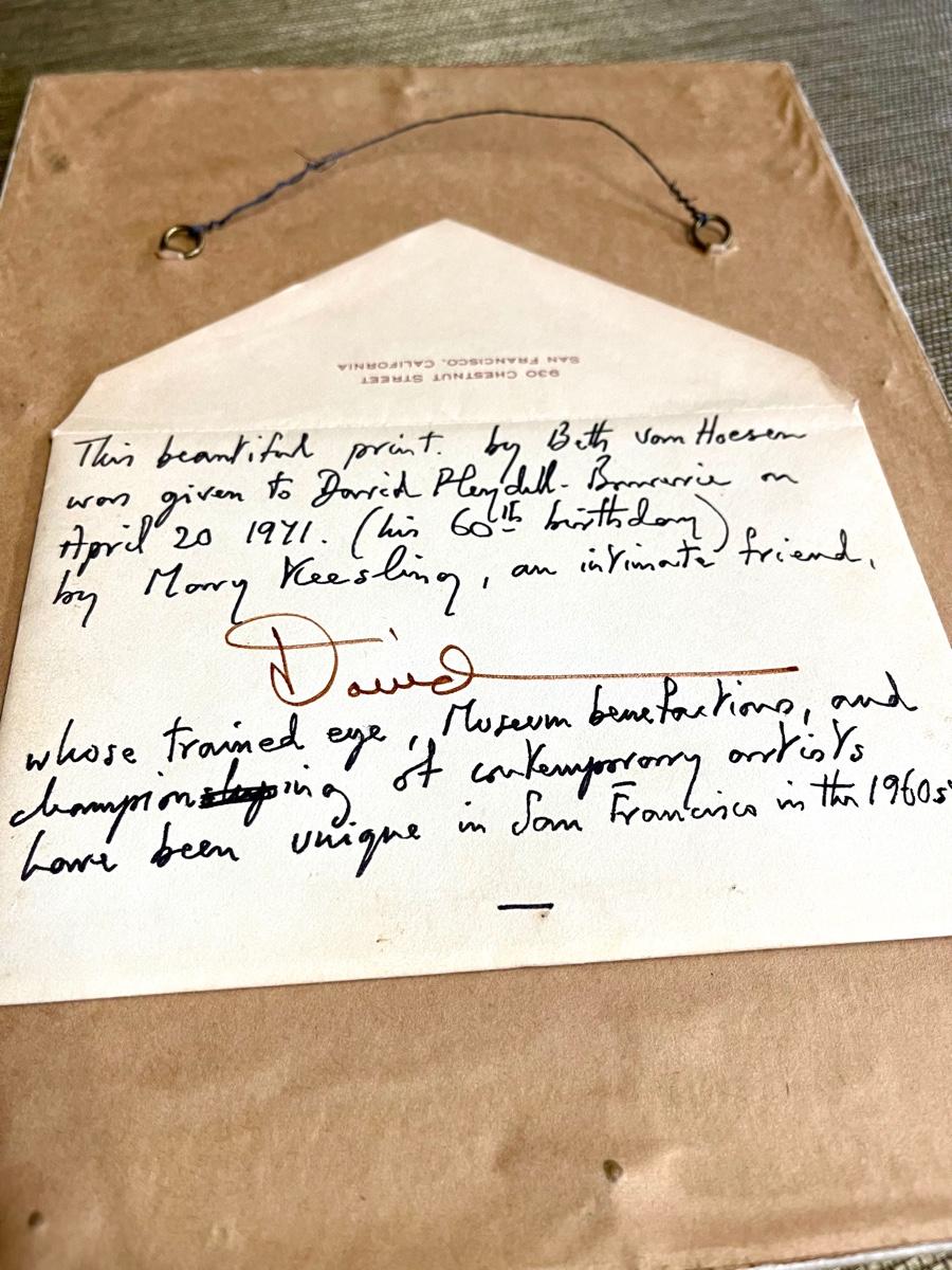 LOT 121 - Beth Van Hoesen Signed Etching (AMERICAN, 1926-2010). Signed in Pencil / Numbered. Includes letter attached to the back of etching by Mary Heath Keesling. This item is part of the David-Pleydell-Bouverie Estate at Bouverie Ranch in Glen Ellen. This item can be viewed at our Green + Cate Showroom in Sebastopol from July 15th - July 18th between the hours of 9am-5pm. For the benefit of the Bouverie Preserve of Audubon Canyon Ranch.