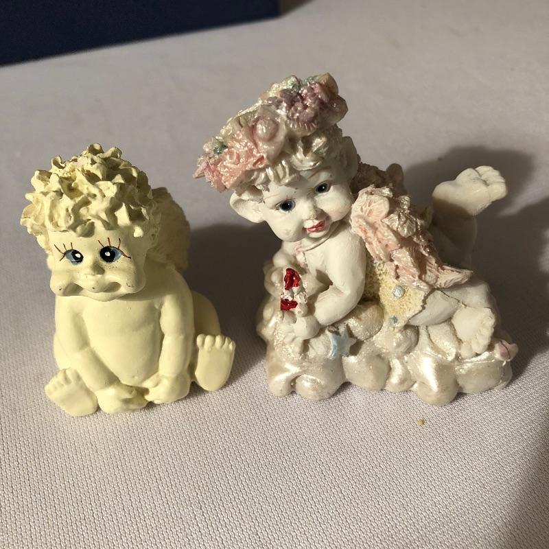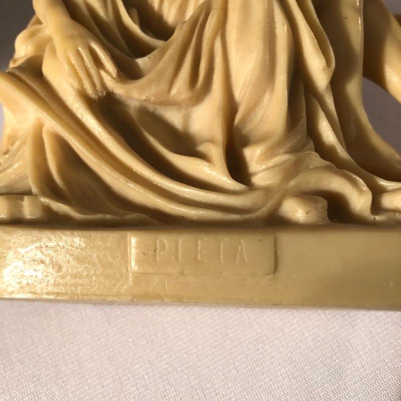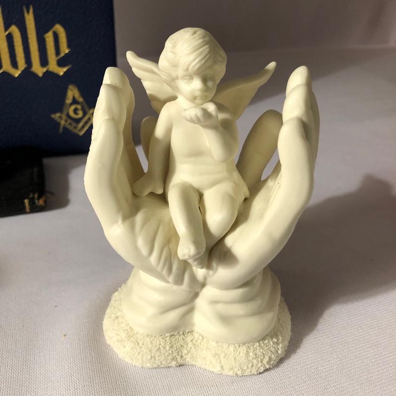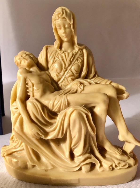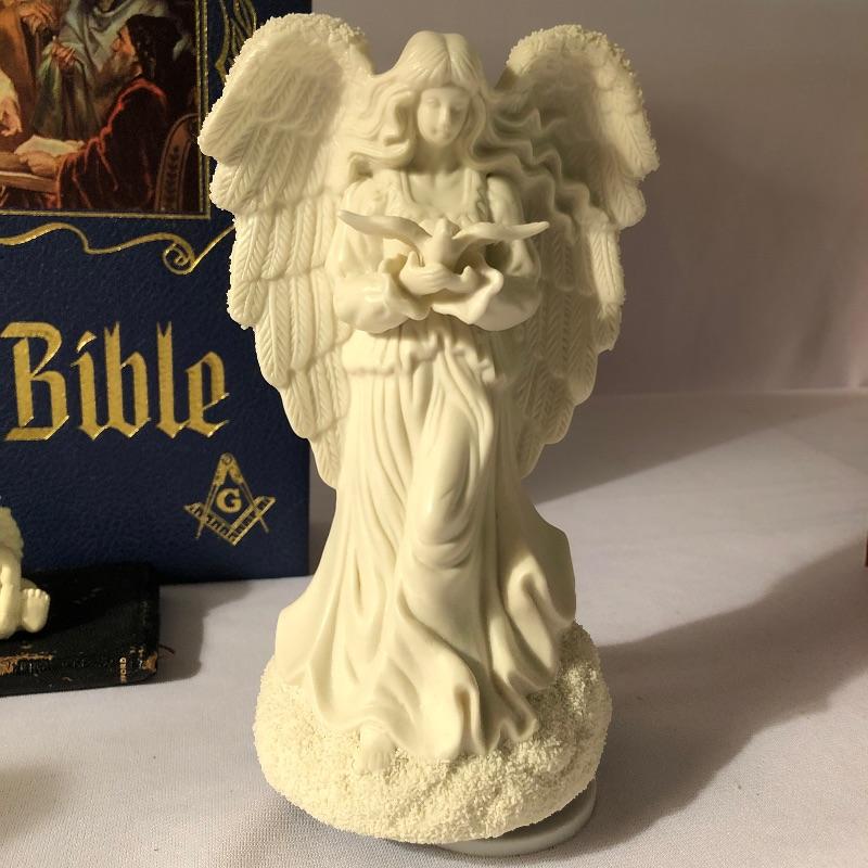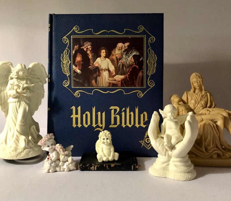 Inspiring and uplifting assortment of religious items here that includes a very large Holy Bible that’s over 700 pages, a small Oxford New Testament and five figurines. The tallest figurine of an angel holding a dove winds up to play music. The statue of two women is a heavier piece that appears to be made from stone and is labeled Pieta.