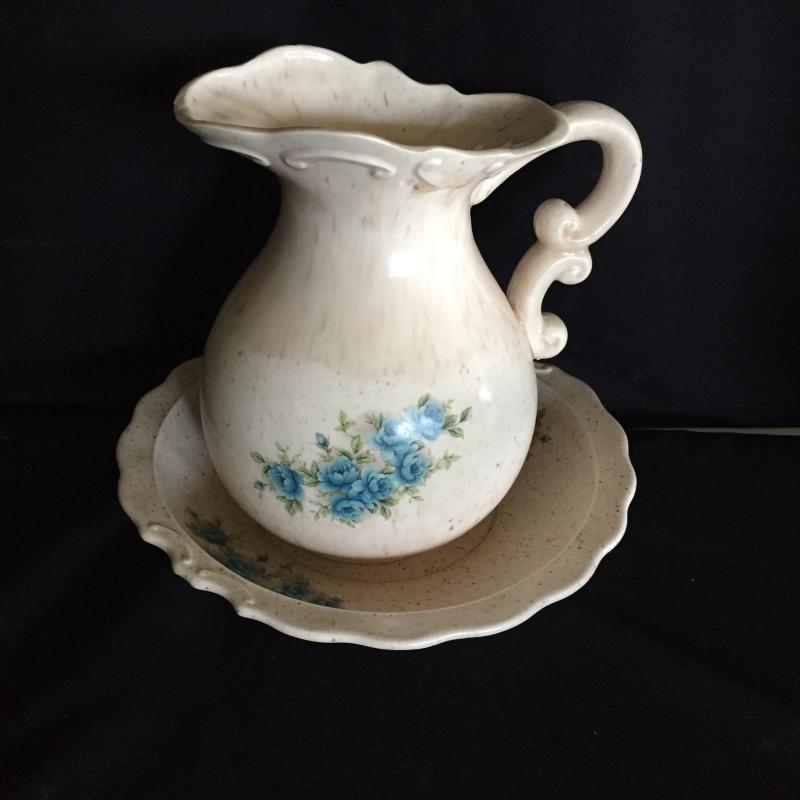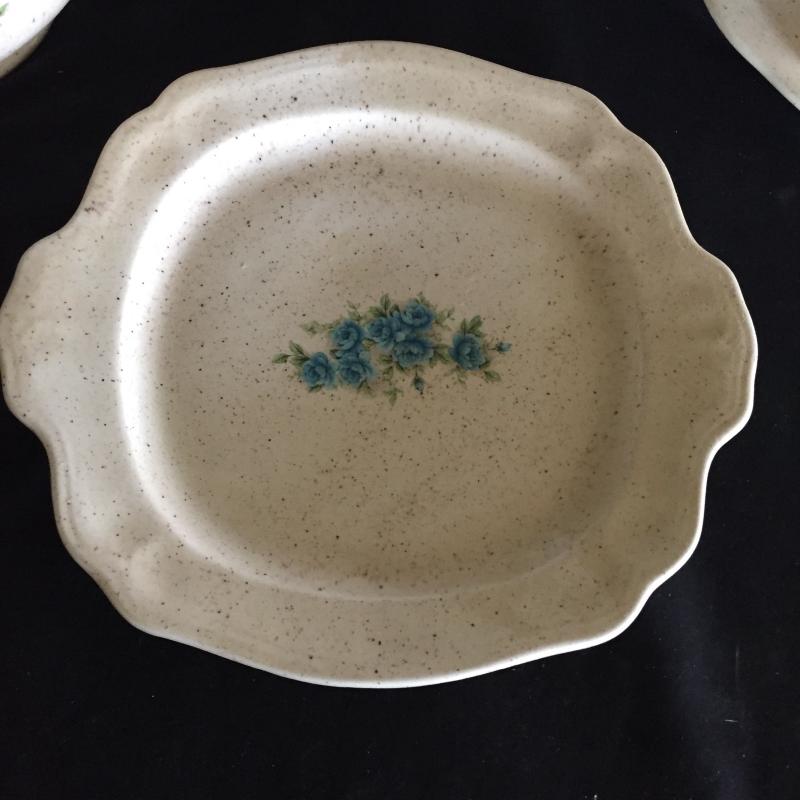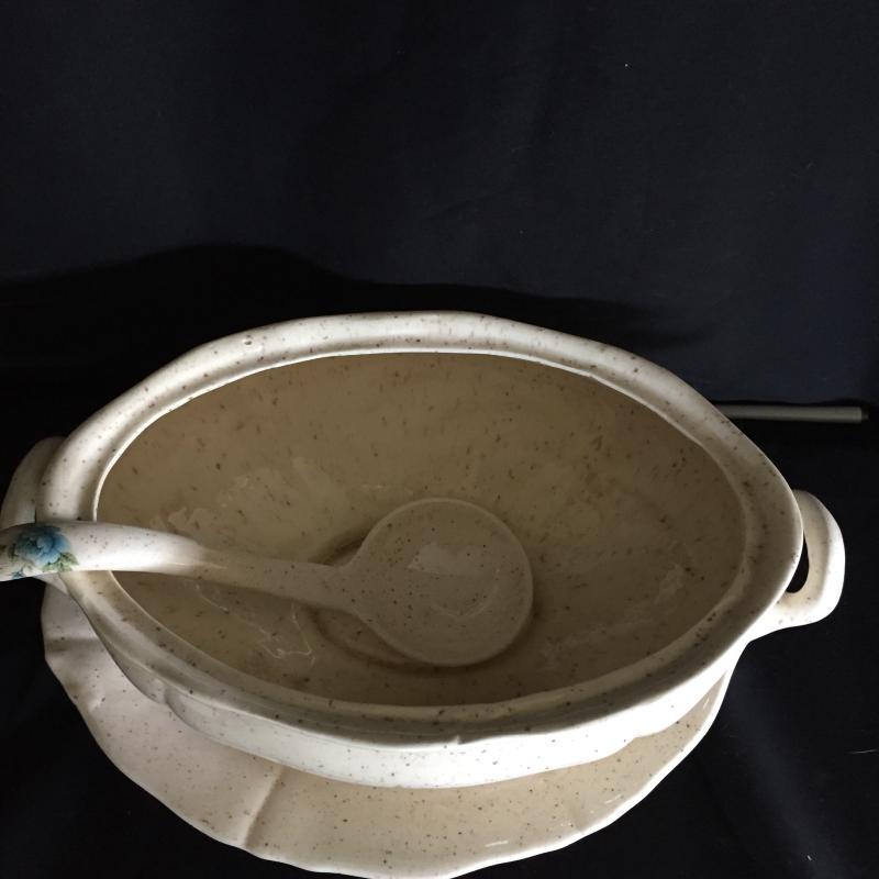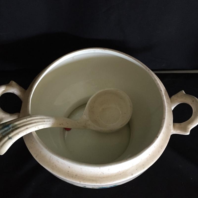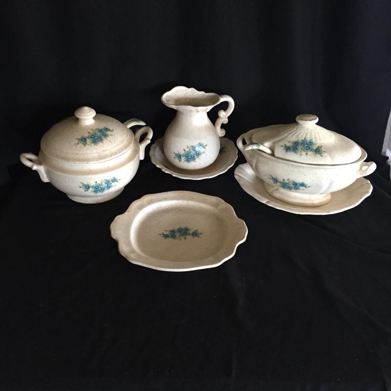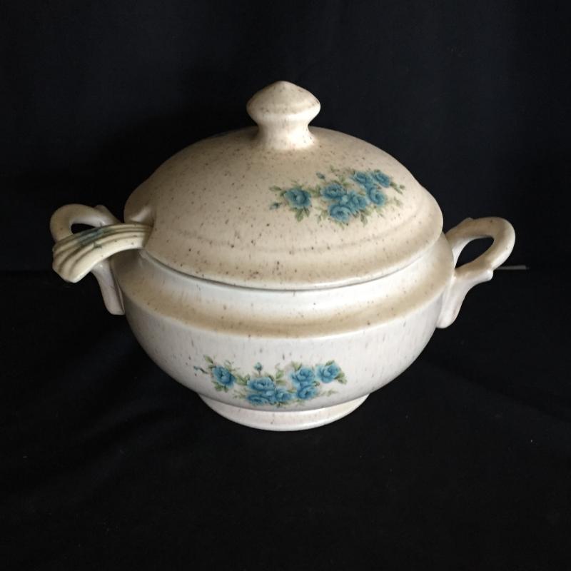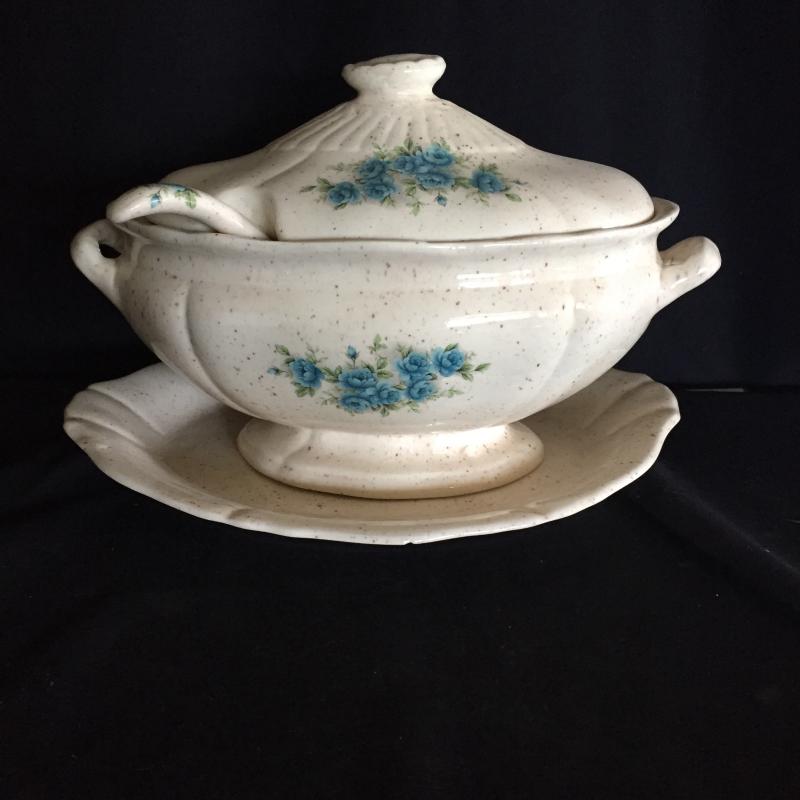 Charming Blue Rose Serving Collection. Two Turines With ladles,Two Platters and Pitcher. Oval Platter Measures 13” x 10”.