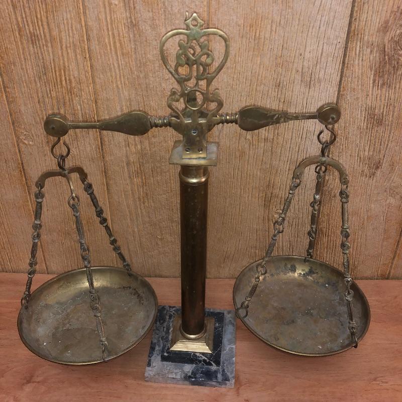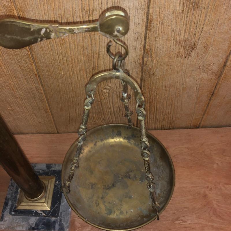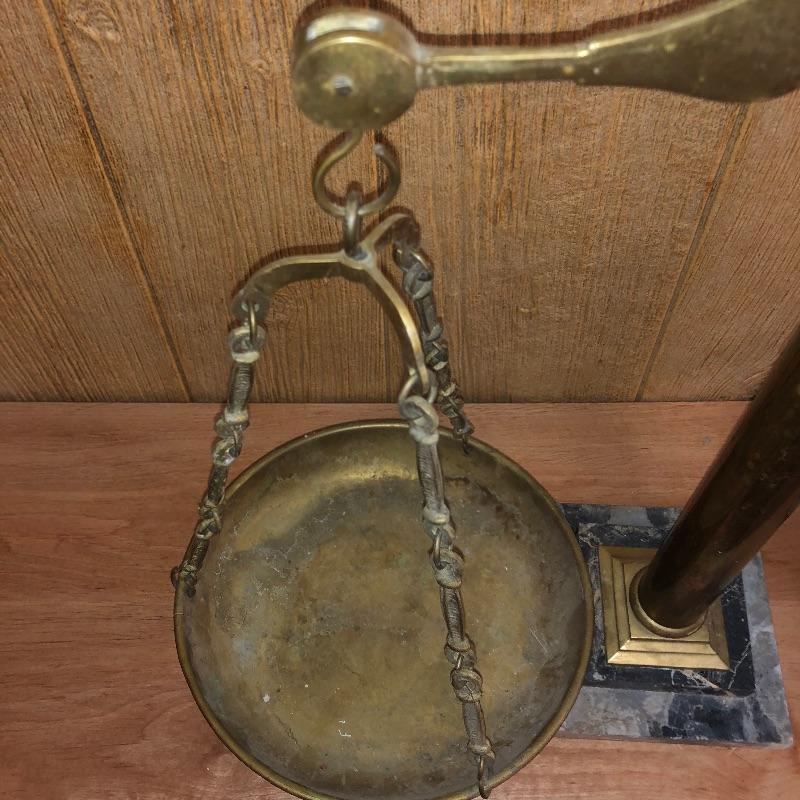 This lot is a brass scale with a marbled base. This beautifully designed piece would make incredible decor. Scale measures 24”W x 23”H. Local pickup only.