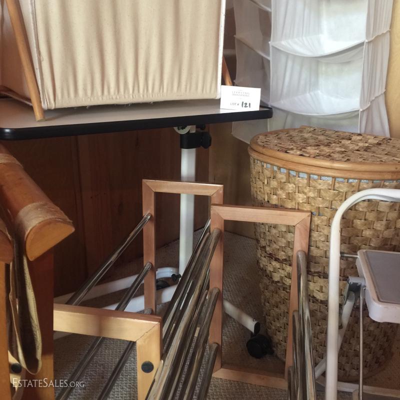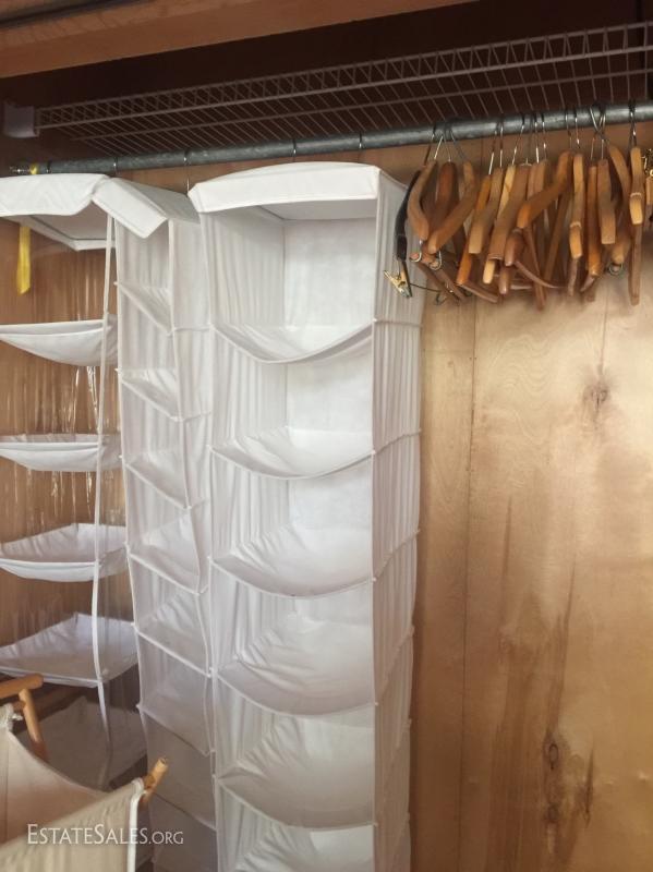 Storage pieces include Luggage rack, two clothing hampers, 2 shoe racks and 3 hanging closet fabric shelves. small table, folding step stool and wood hangers. See photos for details