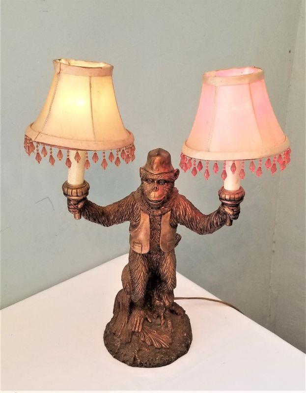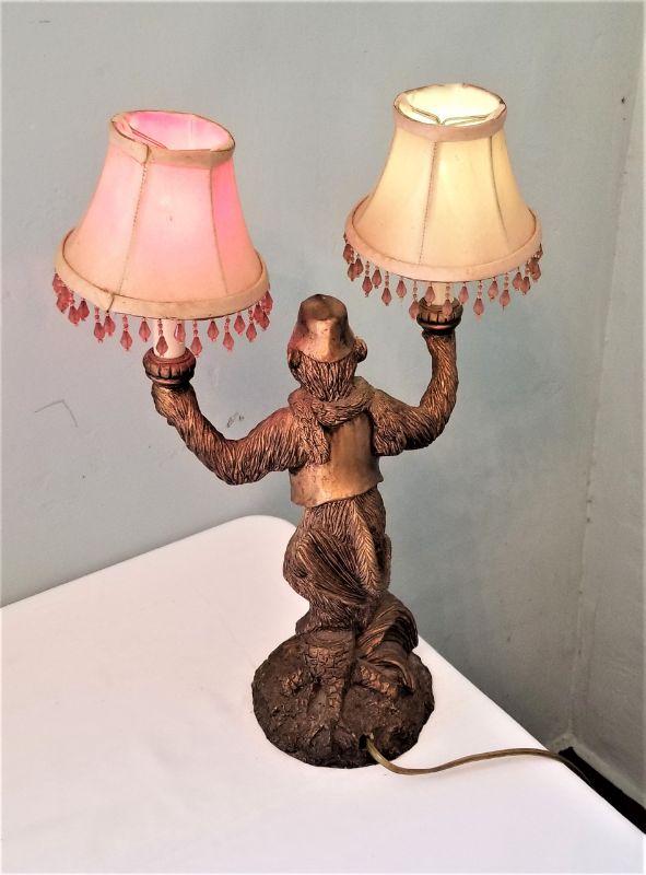 Two arm table lamp in the form of a monkey - the lamp currently has colored bulbs in it, hence the colored "glow" on the shades. Good working condition. 19" tall - monkey is 14" tall. Switch on cord.