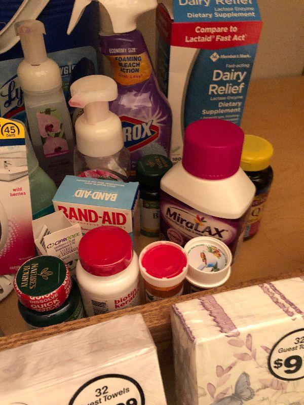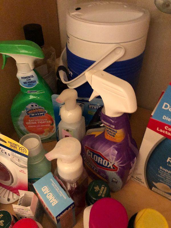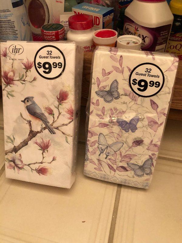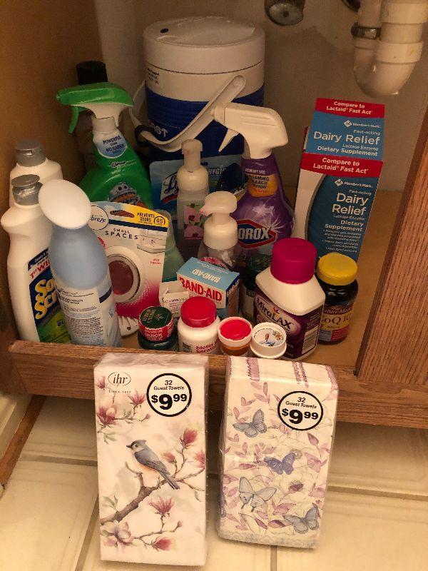 Contents of Powder Room Cabinet includes Claning Supplies and Decorative Paper Hand Towels.