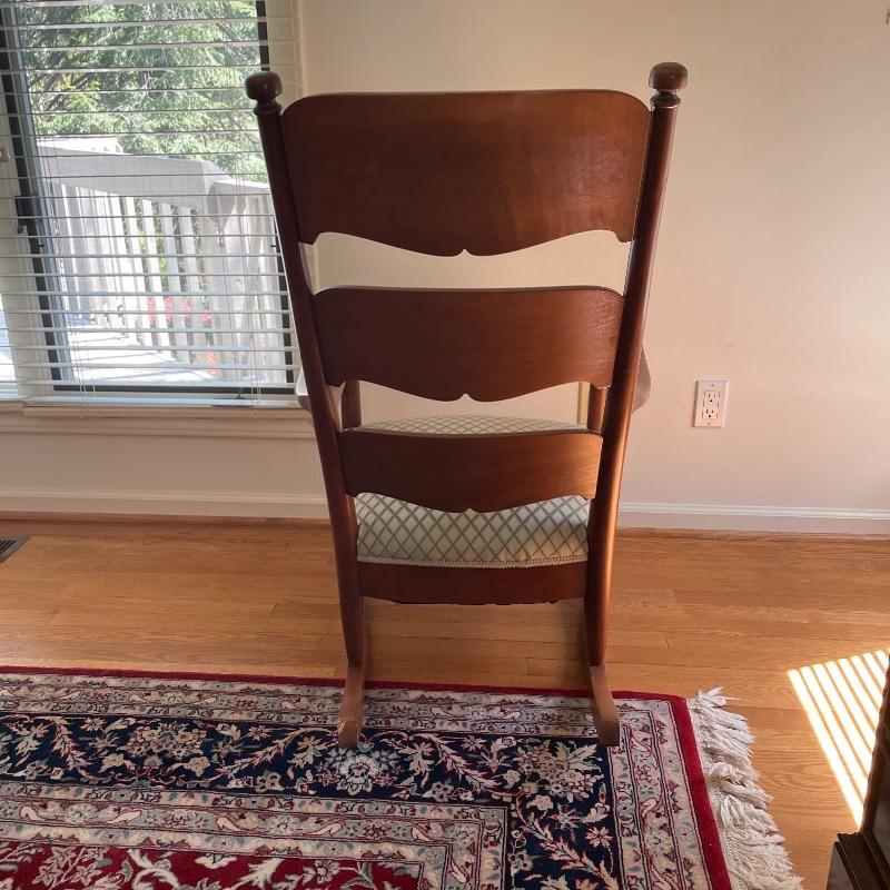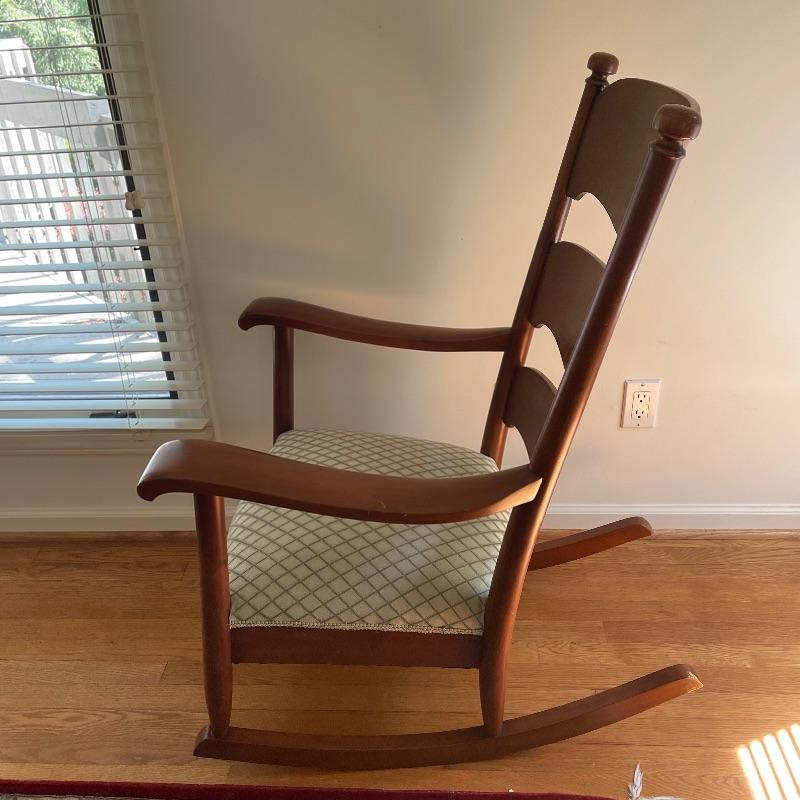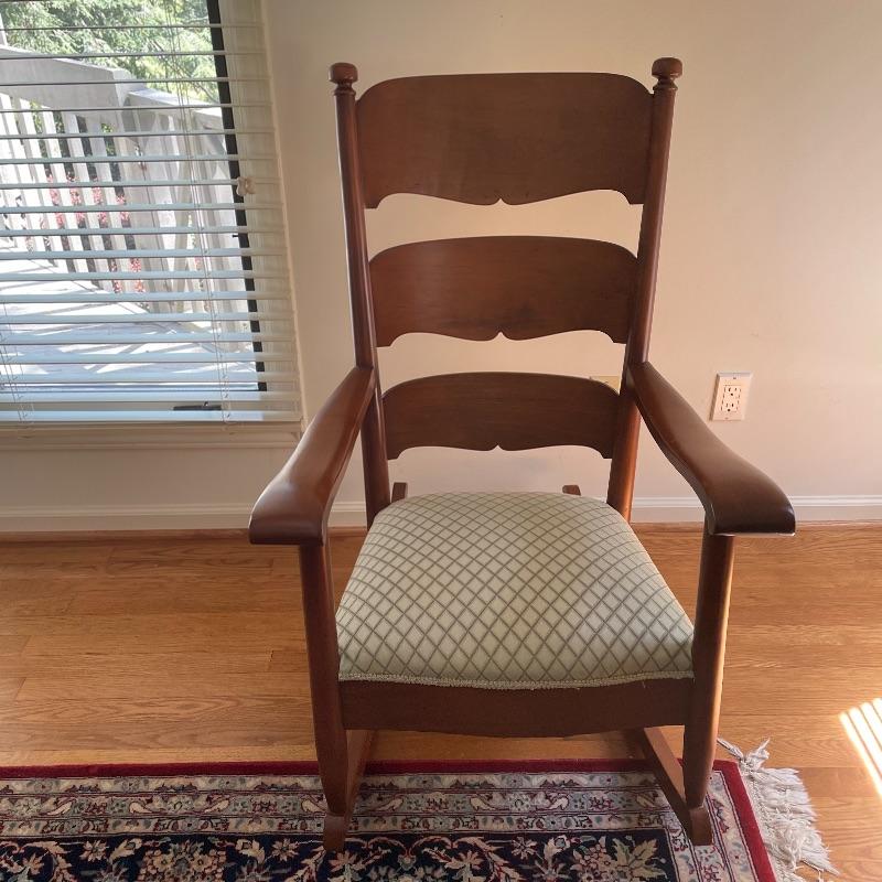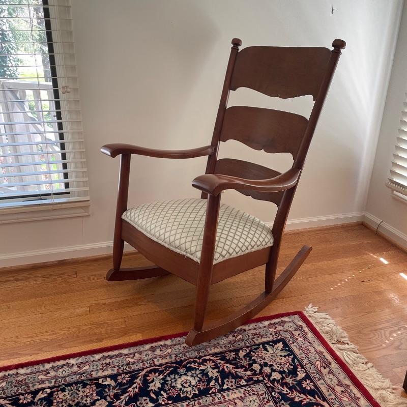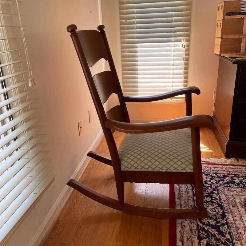 This rocking chair offers the perfect balance of comfort and stability. The cushion is firm, yet oversized. The wood is a deep beautiful brown and in very nice shape with a small nick in one of the feet. Rocker measures approximately 25.5” x 33” x 45.5”. Local pick up only.