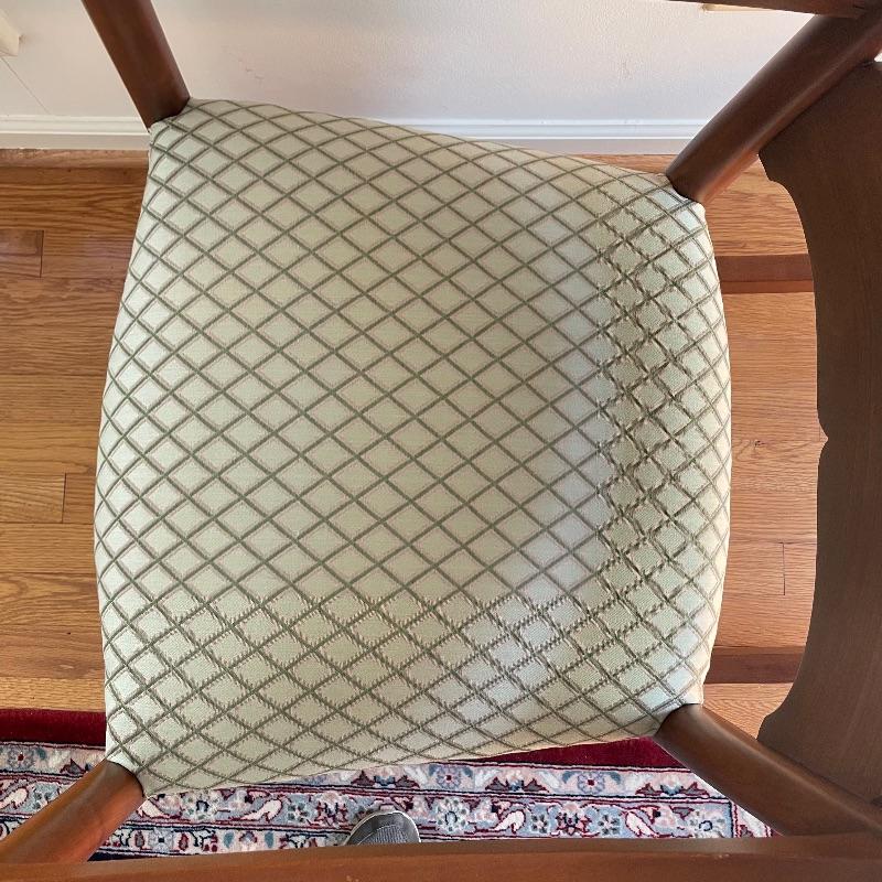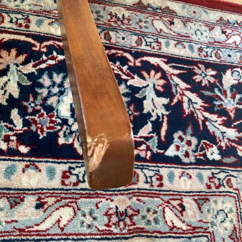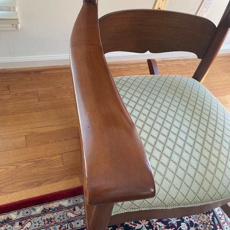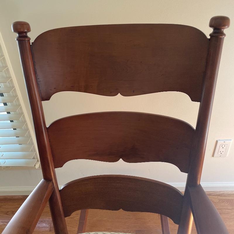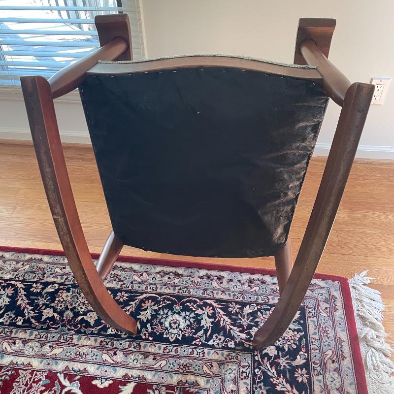 This rocking chair offers the perfect balance of comfort and stability. The cushion is firm, yet oversized. The wood is a deep beautiful brown and in very nice shape with a small nick in one of the feet. Rocker measures approximately 25.5” x 33” x 45.5”. Local pick up only.
