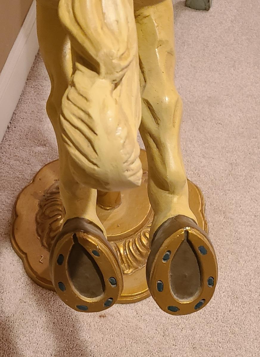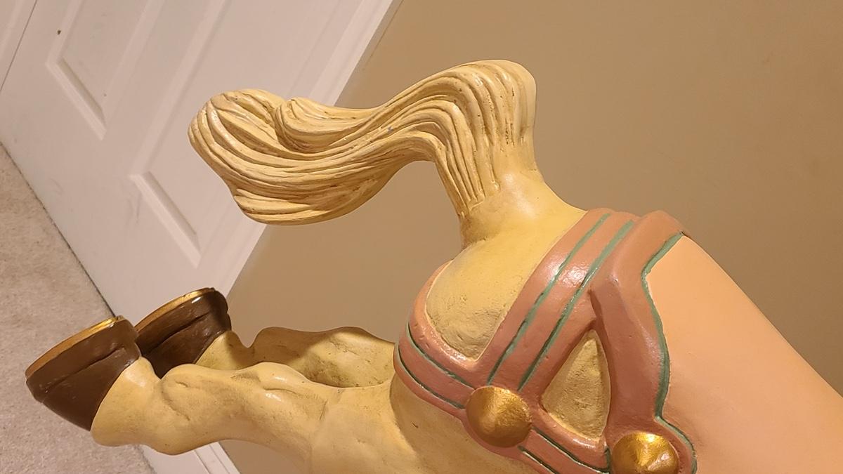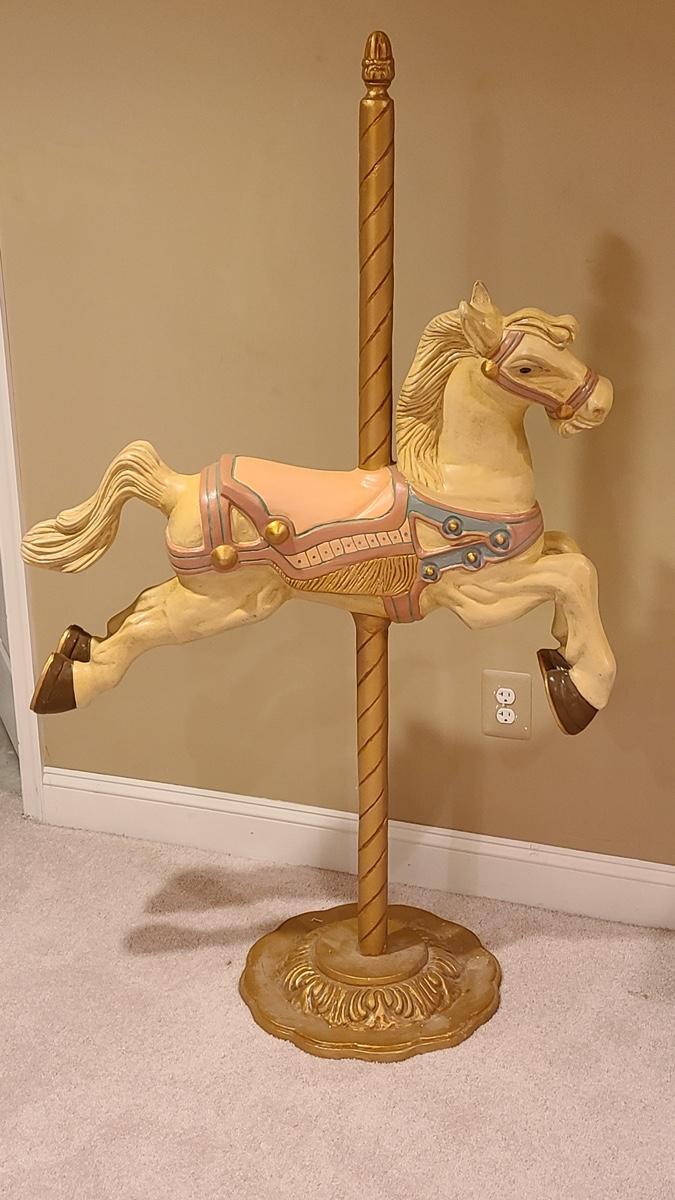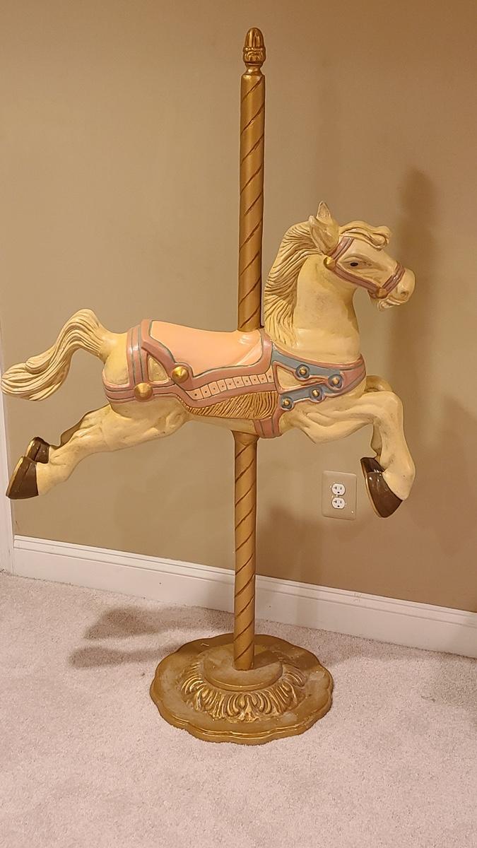 This unique carousel horse is solid and sturdy, made of metal. It measures 39x61. You will need to be able to bring up from a basement. Please see all pictures for content of the lot, condition of the lot, and measurements if taken. Pictures are the best representation of the items listed and items are untested unless indicated in description. Thank you for looking and have fun bidding!