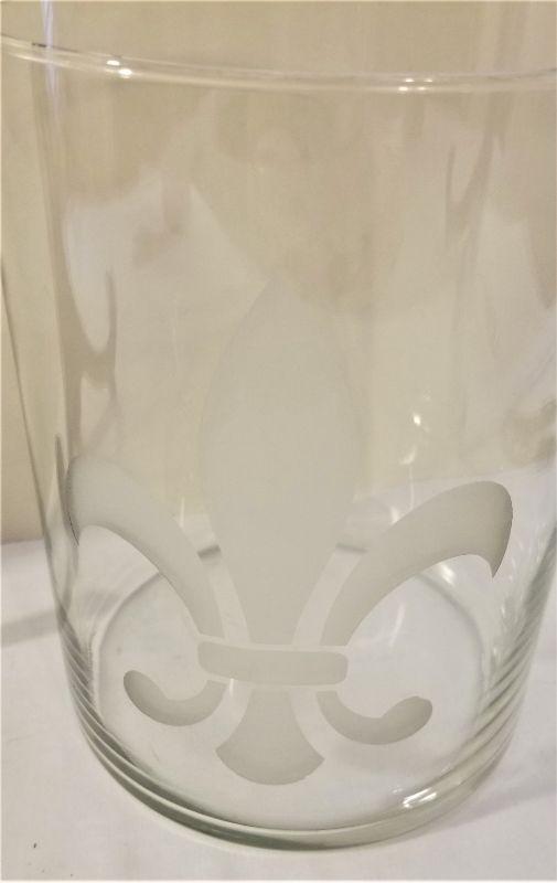 Two piece lot here - pink depression glass plate and clear glass cylinder acid-etched Fleur di Lis Vase. Platter, which is a delicate pink color (hard to see in photo), is 11.5" across. Vase is 8" tall. Both in good condition.