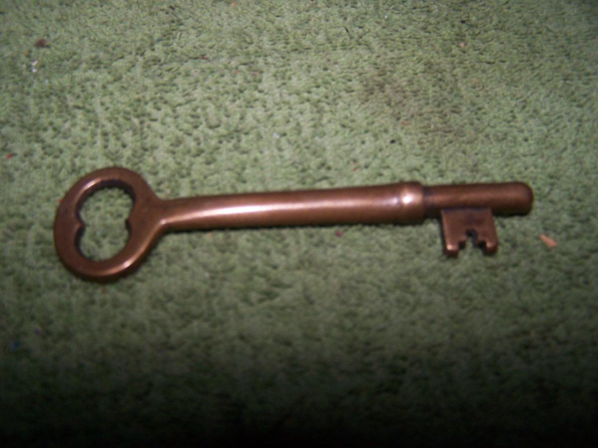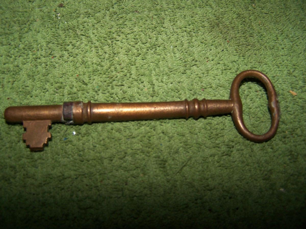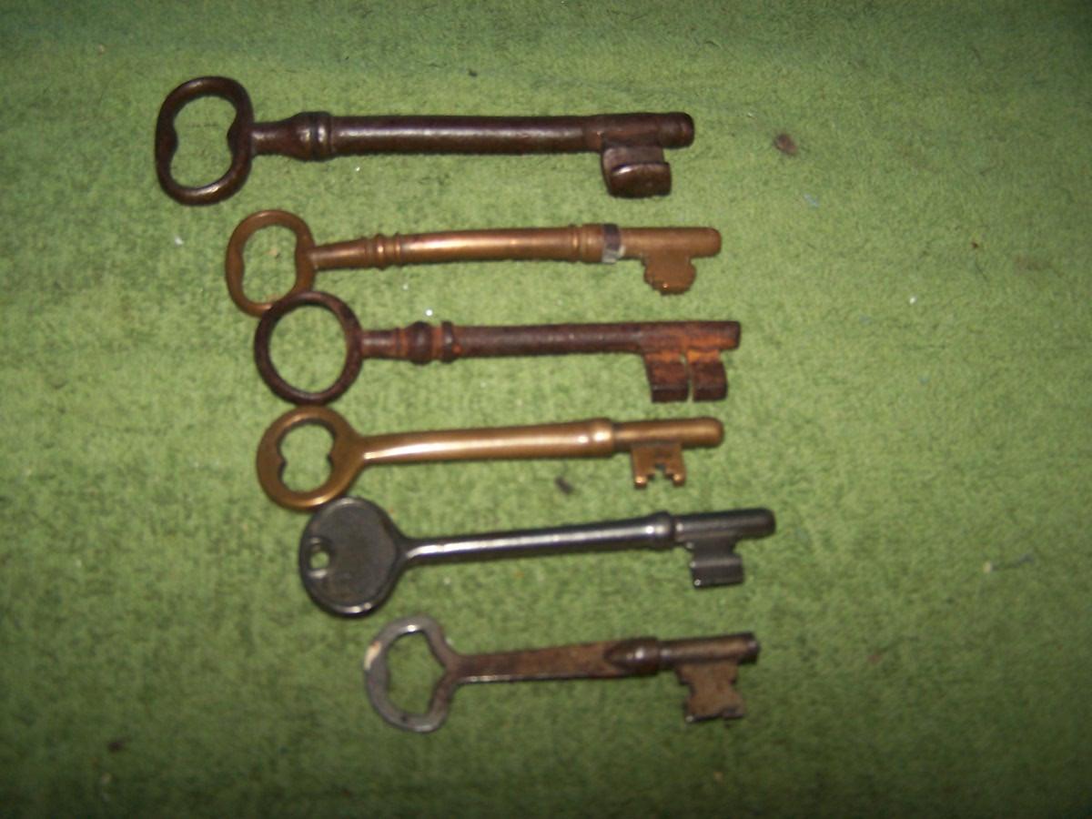 THESE ARE GREAT OLD KEYS!!! LARGE JAIL KEY IS 5 1/4''.. KEYS ARE 2 BRASS AND REST ARE STEEL. WEAR AND SOME RUST