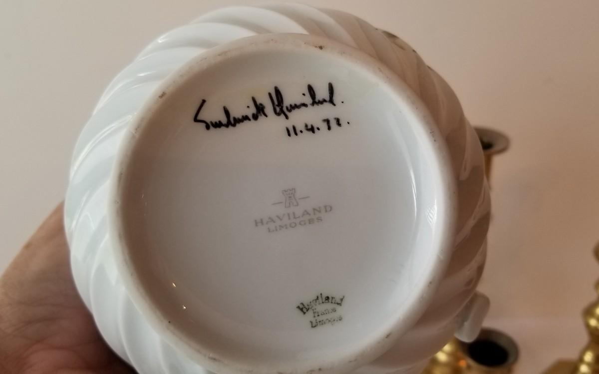 You get all you see here. Very pretty Limoges Havilland pitcher, 7.5" tall and 4 assorted brass candlesticks.