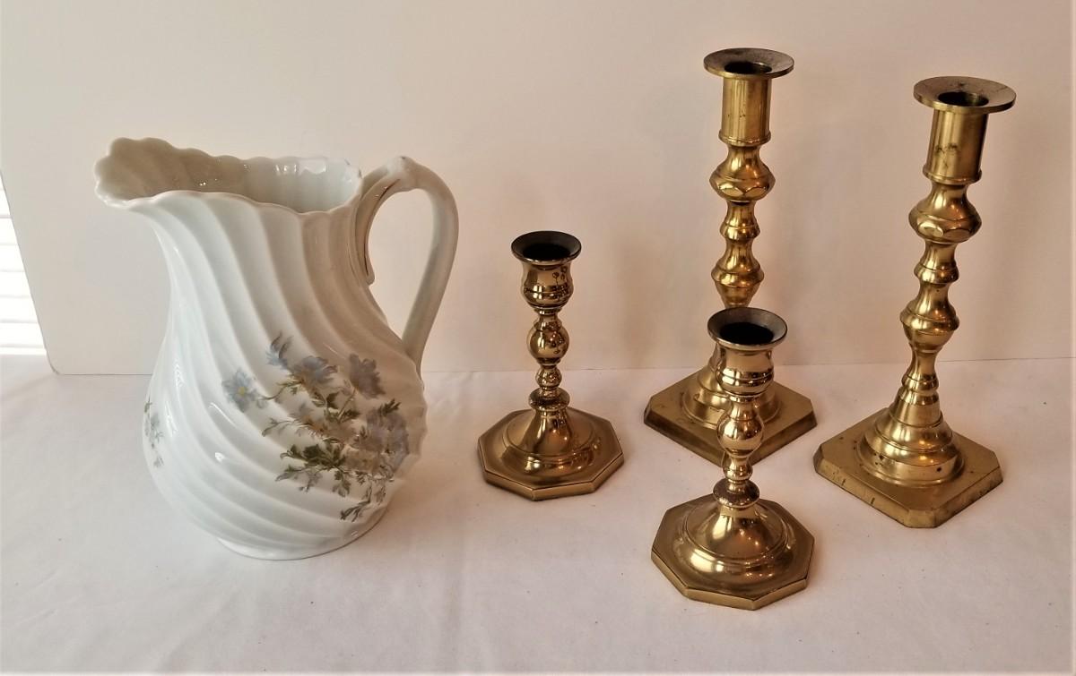 Lot #121 Haviland Limoges Pitcher and 4 Brass Candlesticks