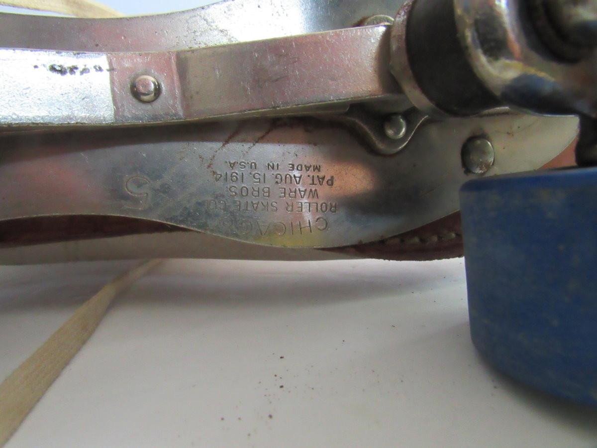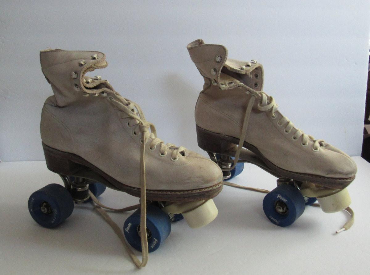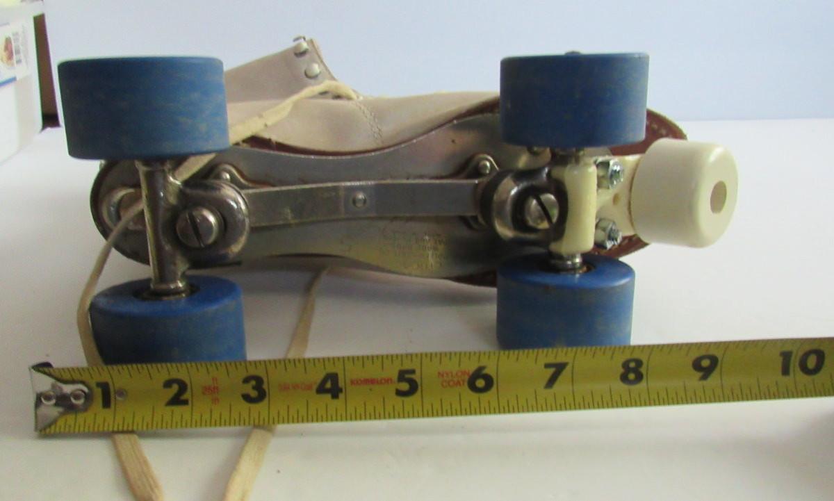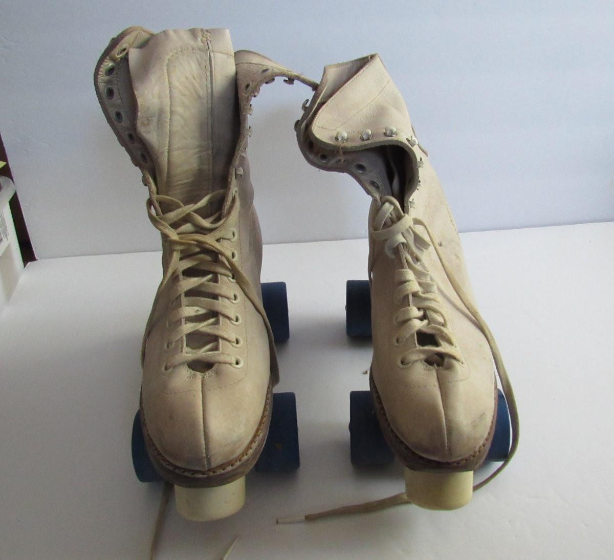 Appears to be in good shape. I don't see any damage, just use wear. Pretty sure they are leather. The size info wore off, they are 10" long from heel to toe.