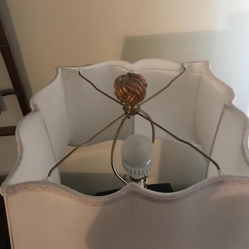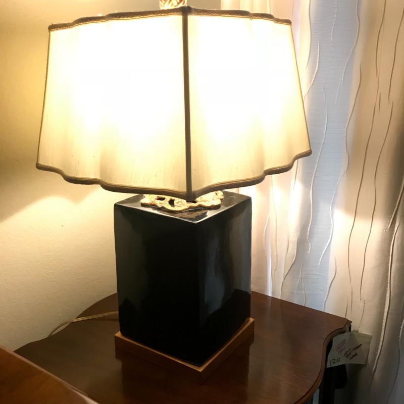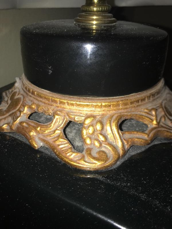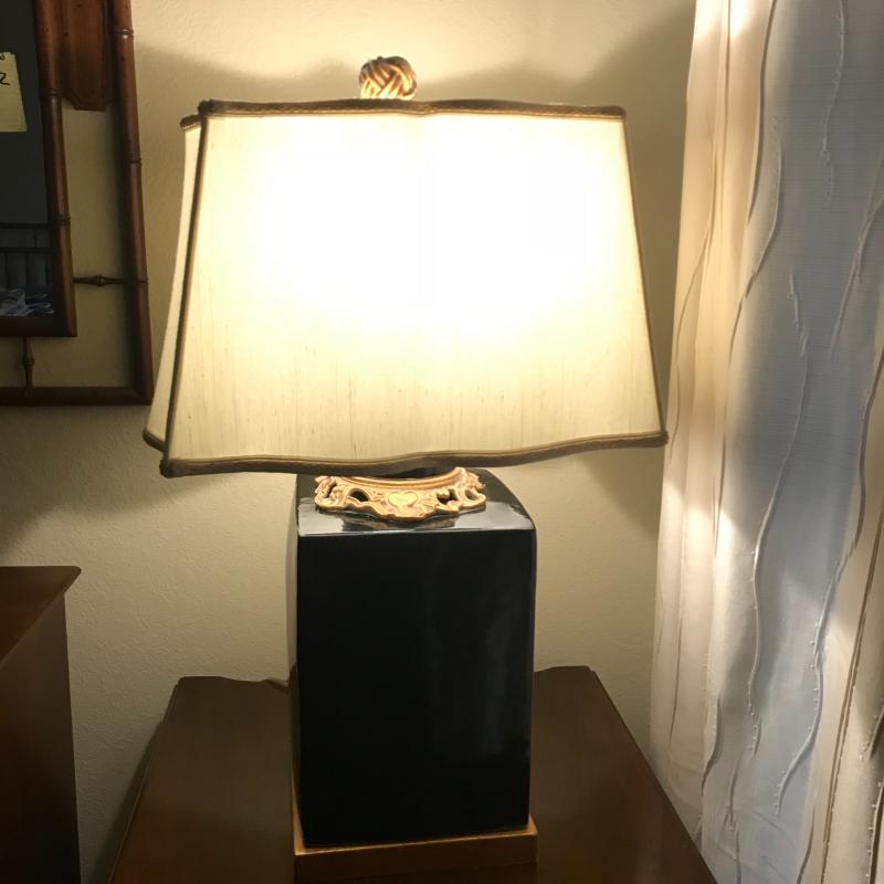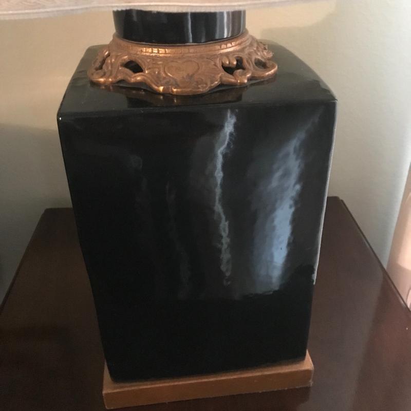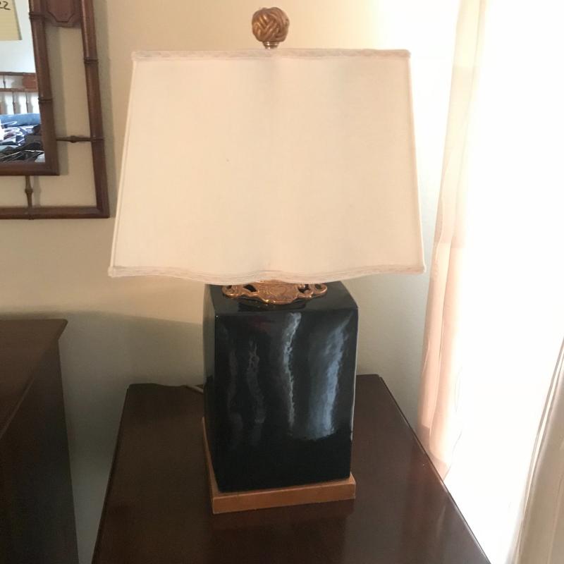 Lamp is quite substantial and had gold wood base and accent at top and fineal. This is a heavy lamp and measures 9.5” x9.5” at base and stands 31” tall to top of fineal. Local pick up only.