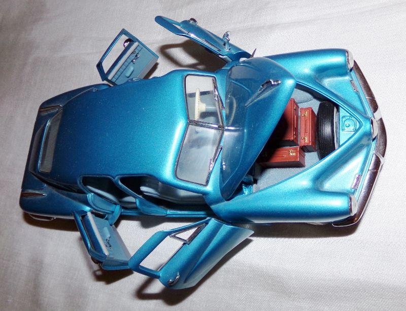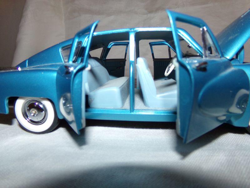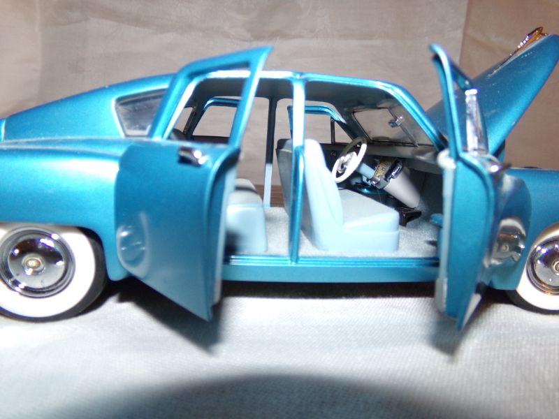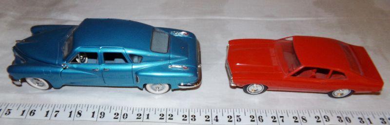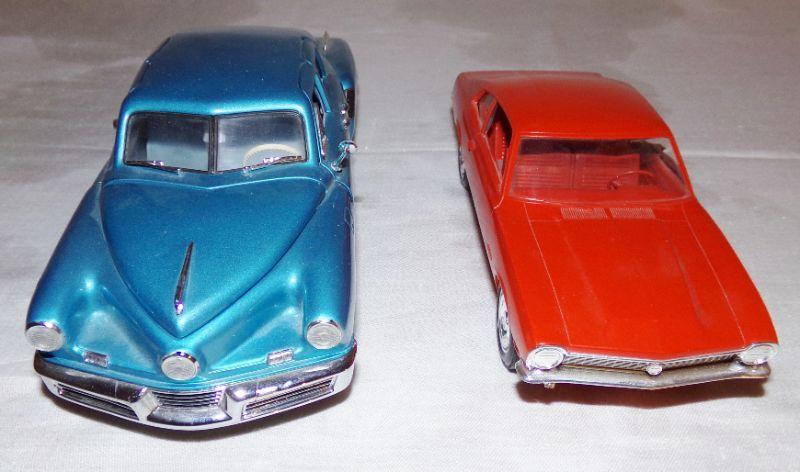 1948 TUCKER FRANKLIN MINT. THE RED CAR IS A MERCURY MAVERICK PLASTIC MODEL BY JO-HAN MODELS