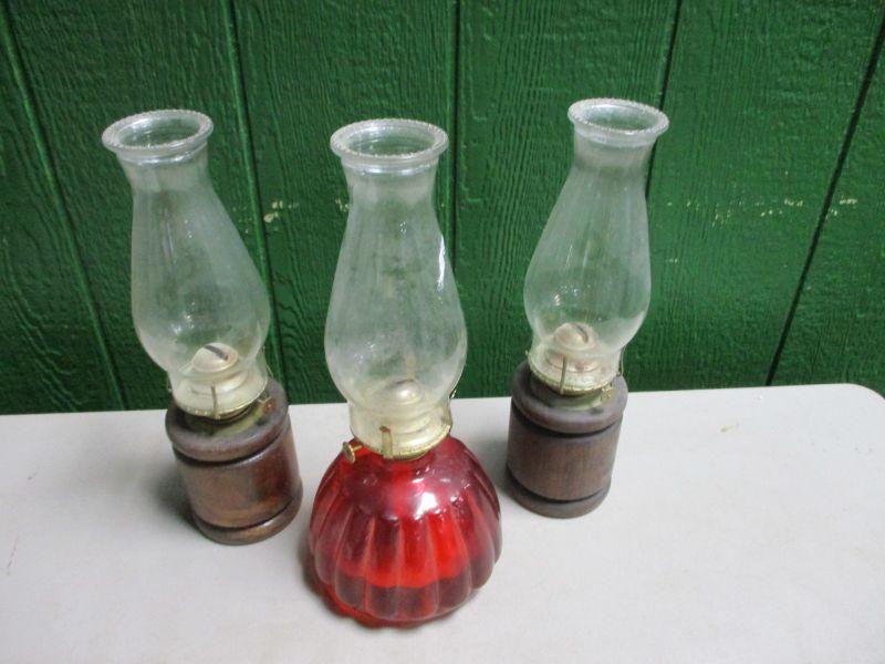 Two have wooden bases and the other has a glass base