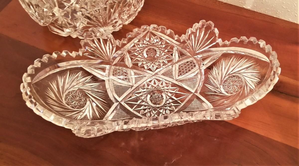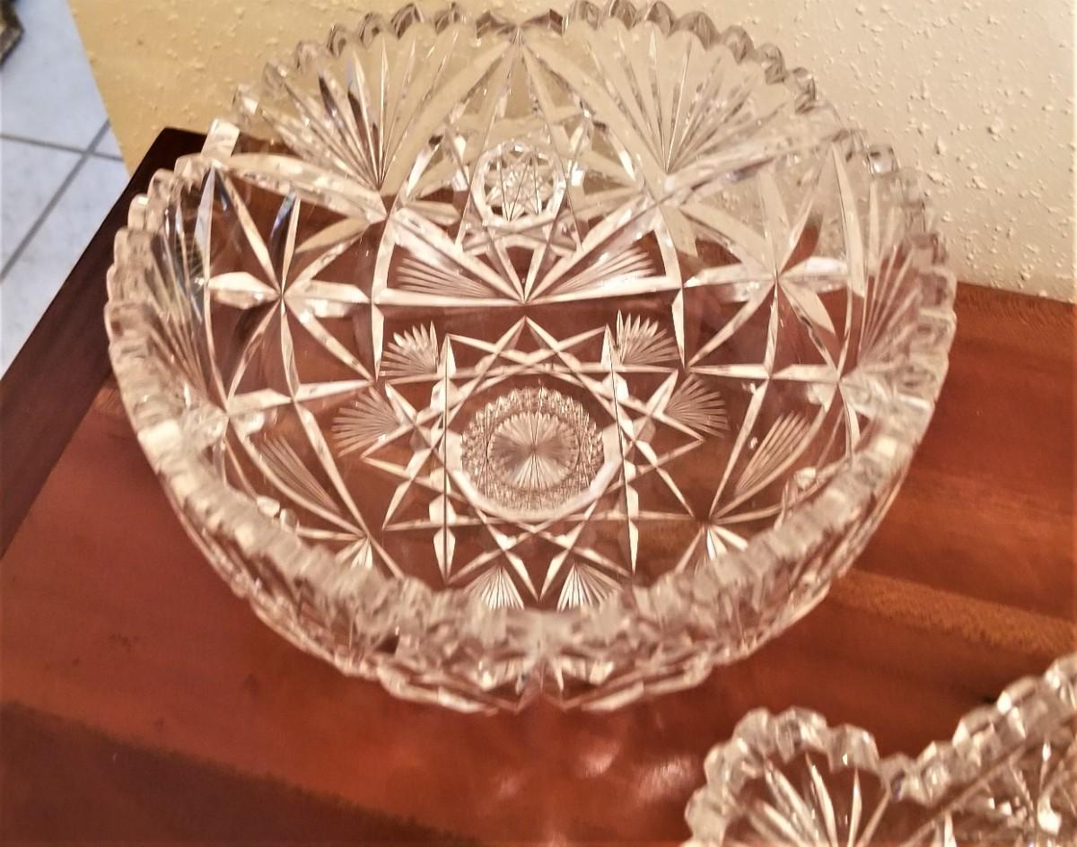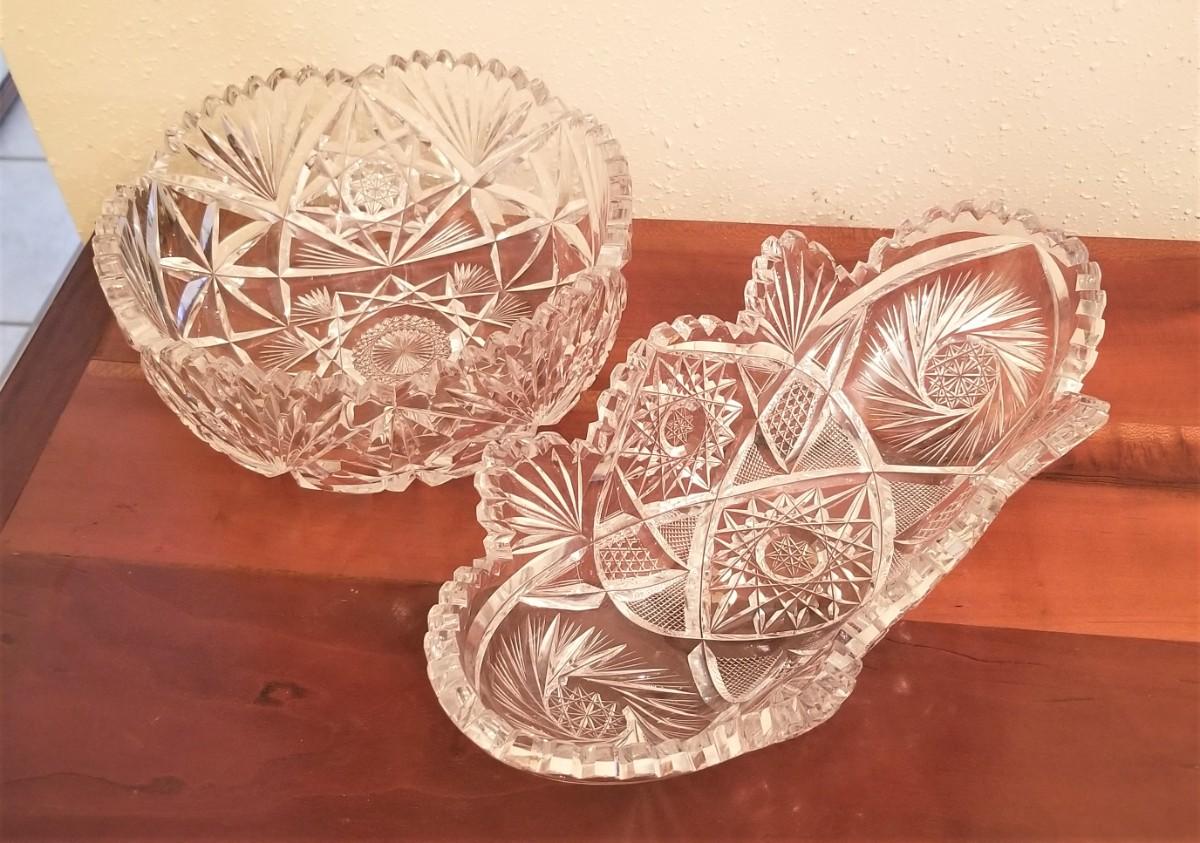 Nice lot of two antique cut crystal bowls - oblong bowl is 11.25" x 5.5" - the round bowl is 8" x 8" and 3.5" tall. Both in good condition.