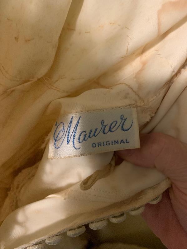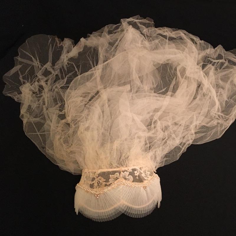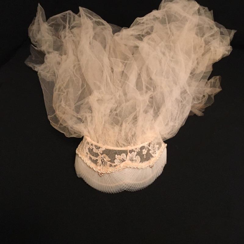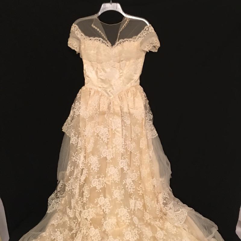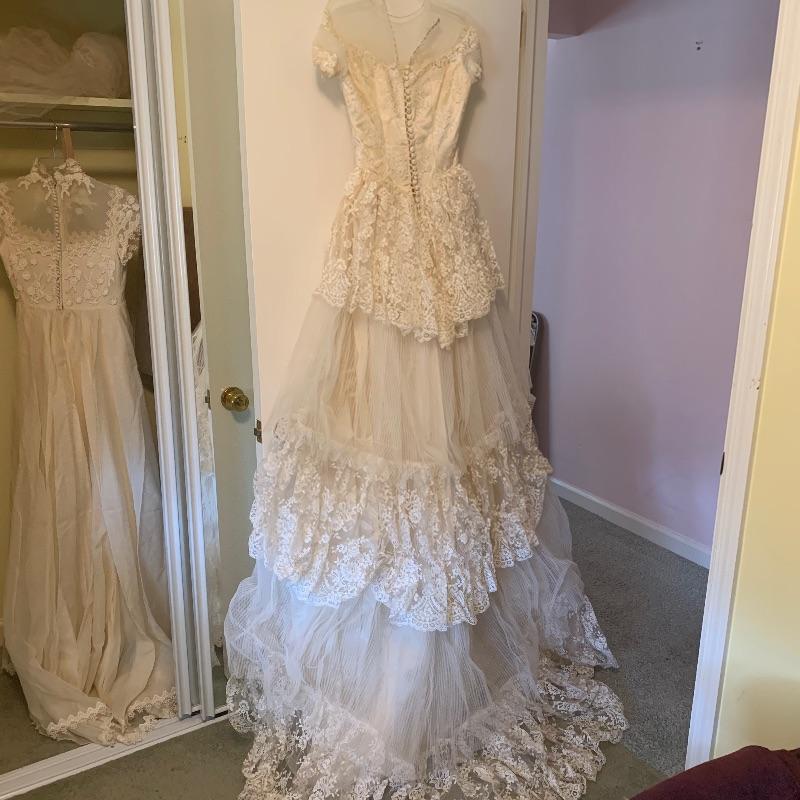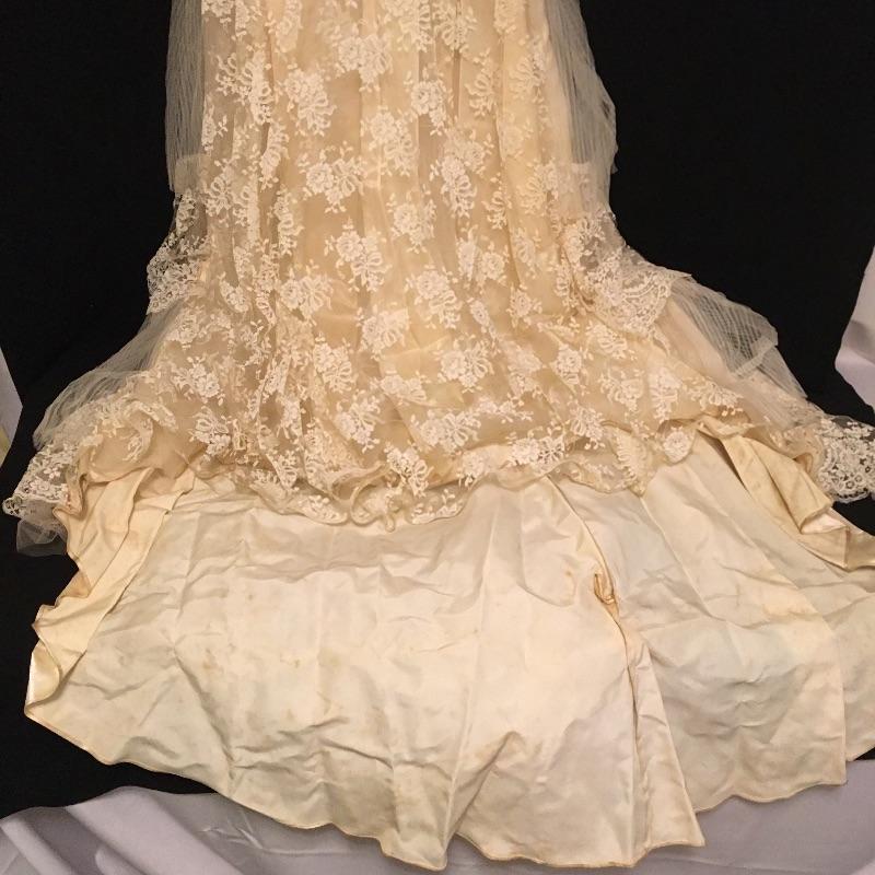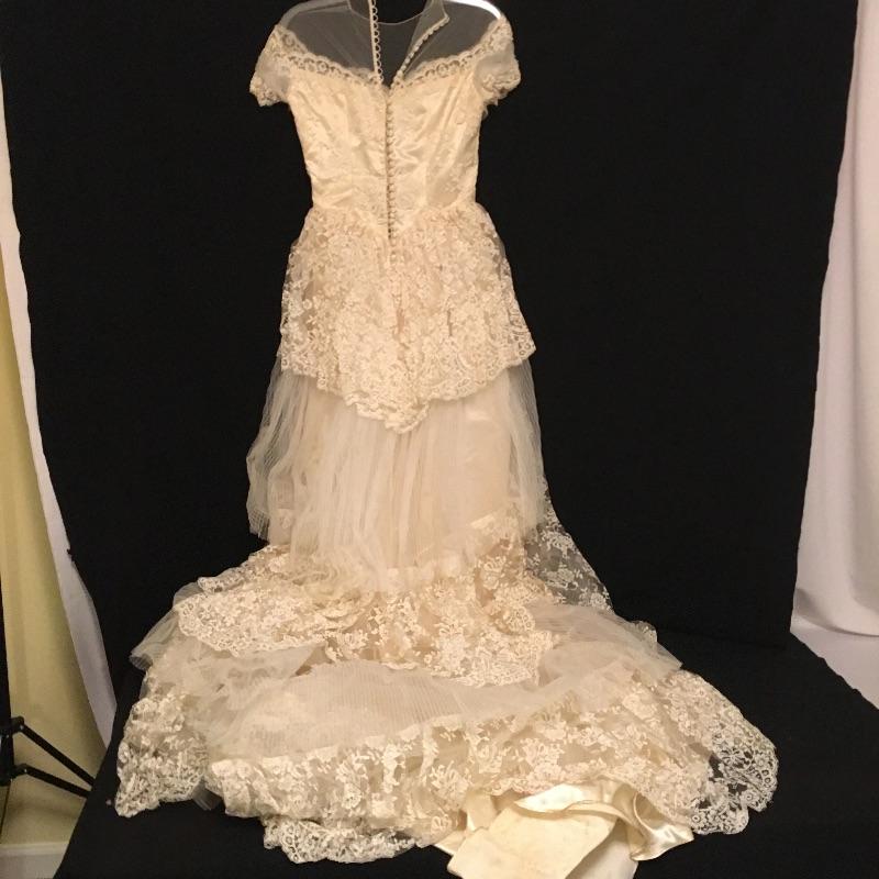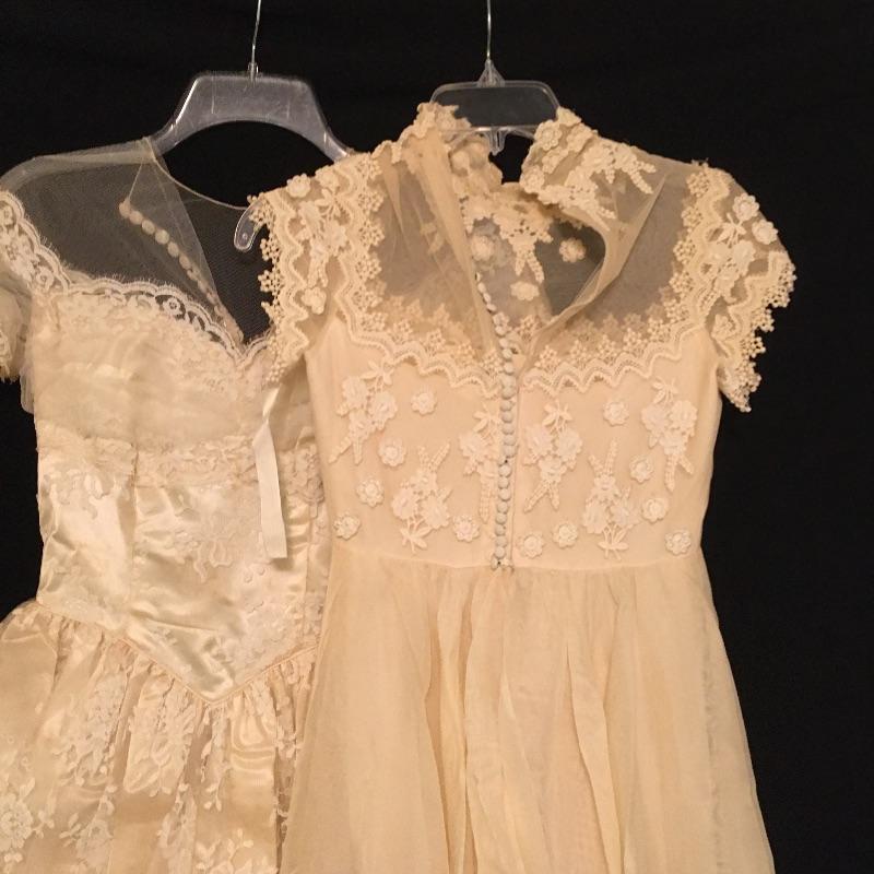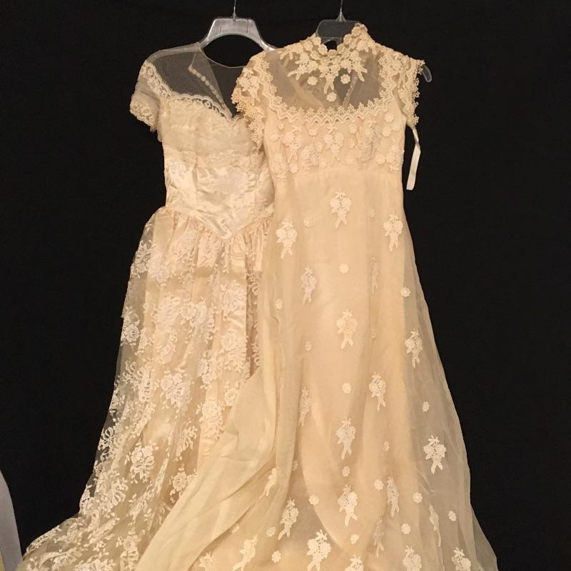 Pair of wedding dresses with veil and shoes. Beautiful pair of dresses have some marks on train but in good shape otherwise. Smaller zipped dress is by Teeny by Priscilla and button one is by Maurer and is the older one.