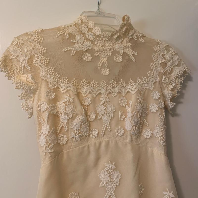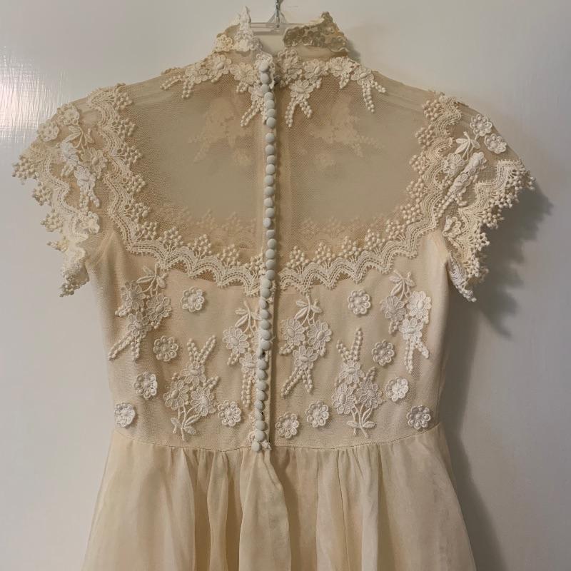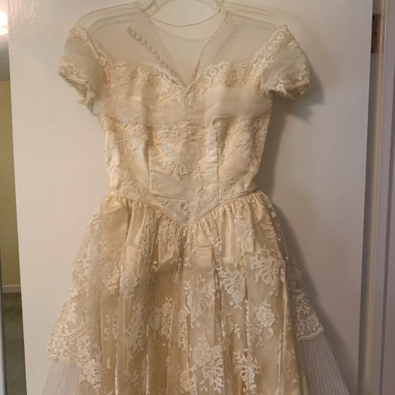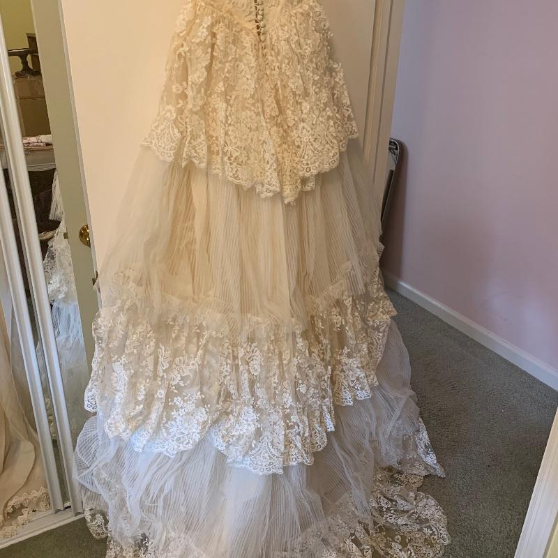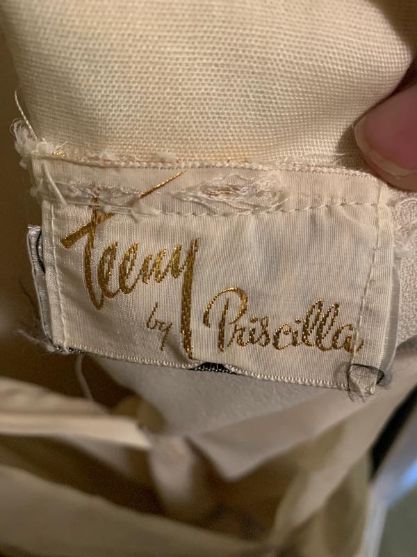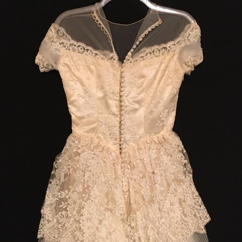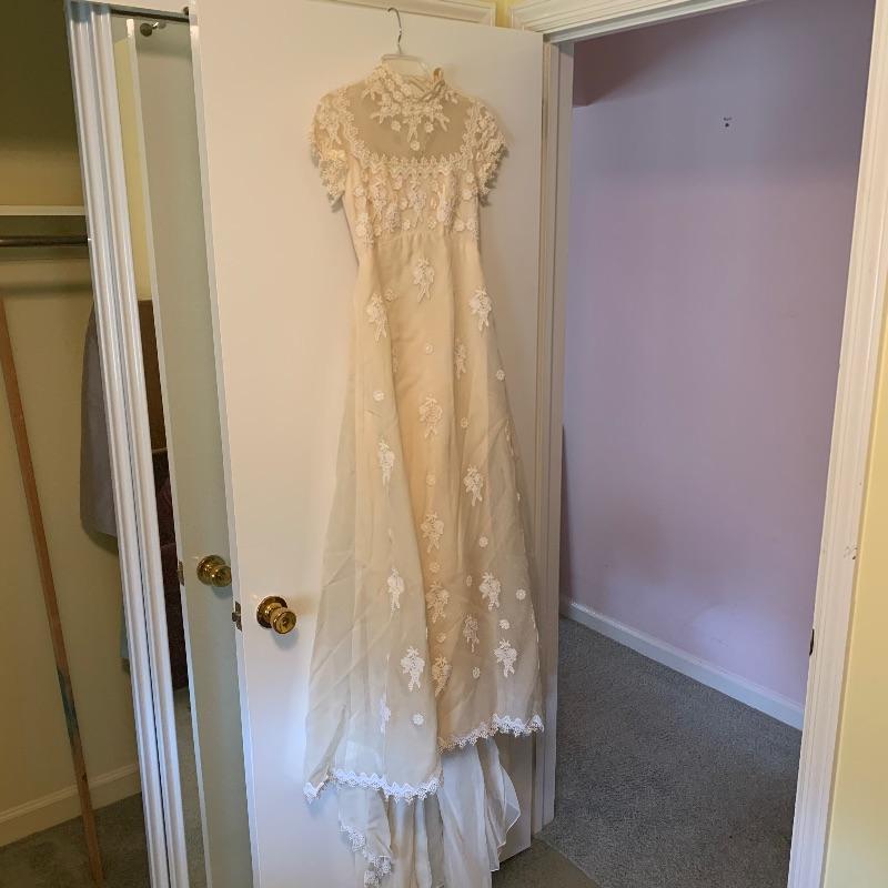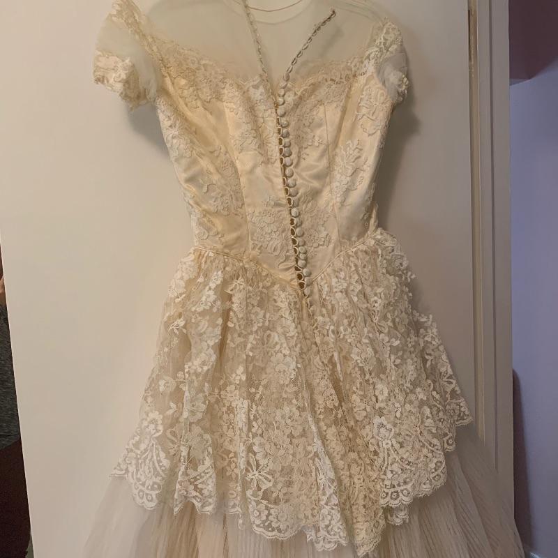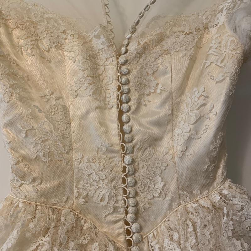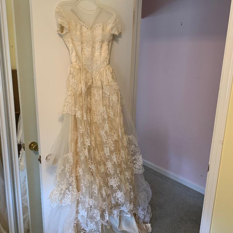 Pair of wedding dresses with veil and shoes. Beautiful pair of dresses have some marks on train but in good shape otherwise. Smaller zipped dress is by Teeny by Priscilla and button one is by Maurer and is the older one.