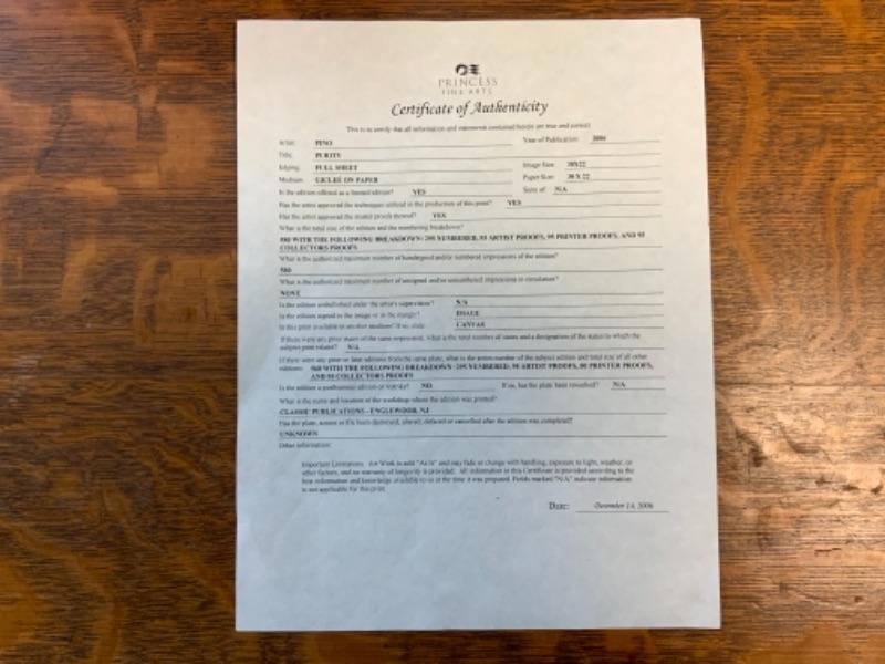 Lot 121. Pino print (29.5” x21.5”); frame (37” x 45”), certificate of authenticity--WAS $350““NOW $262.50