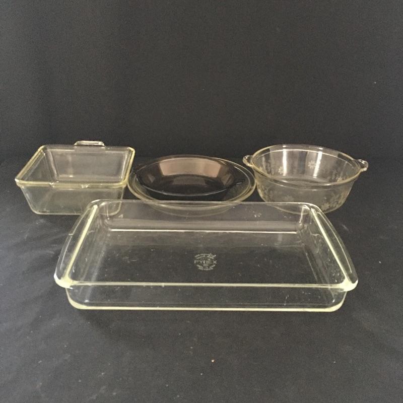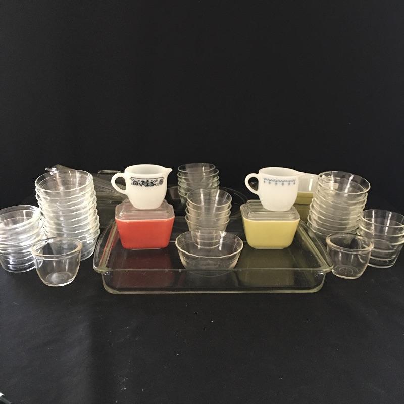 Plethora of Pyrex! Lot includes a large selection of small clear bowls, casserole dishes, pie plates, etched bowl three vintage colored pieces and more. Largest dish measures 9” x 15” x 2”.