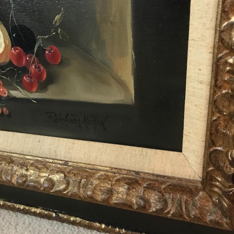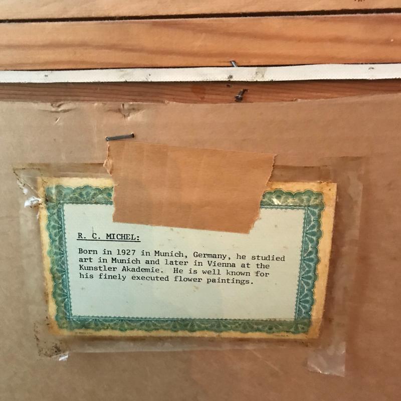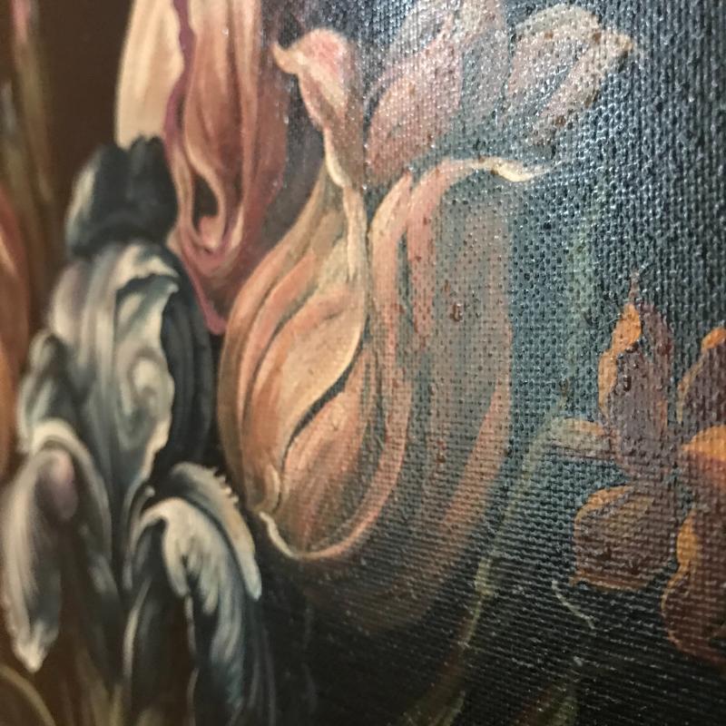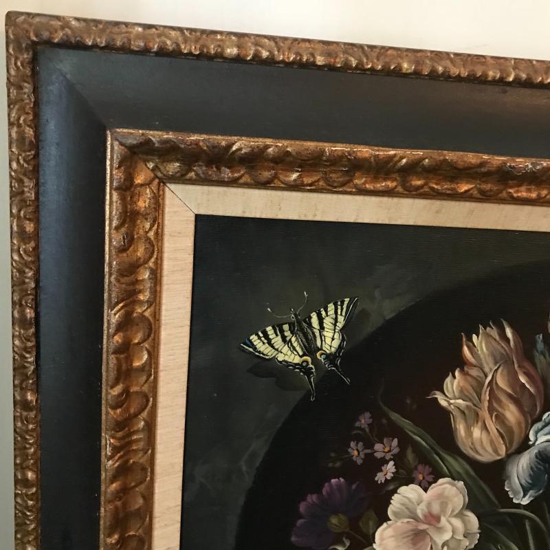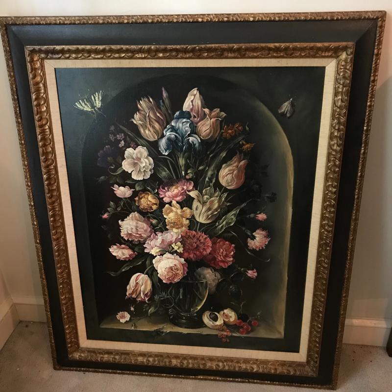 Gorgeous depiction of flowers appears to be an oil painting on canvas, see photos. Black and gold painted frame in excellent condition, it has nails, staples and cardboard support on the back. Shipping available, please receive a quote from UPS prior to bidding, as art can be expensive to ship.