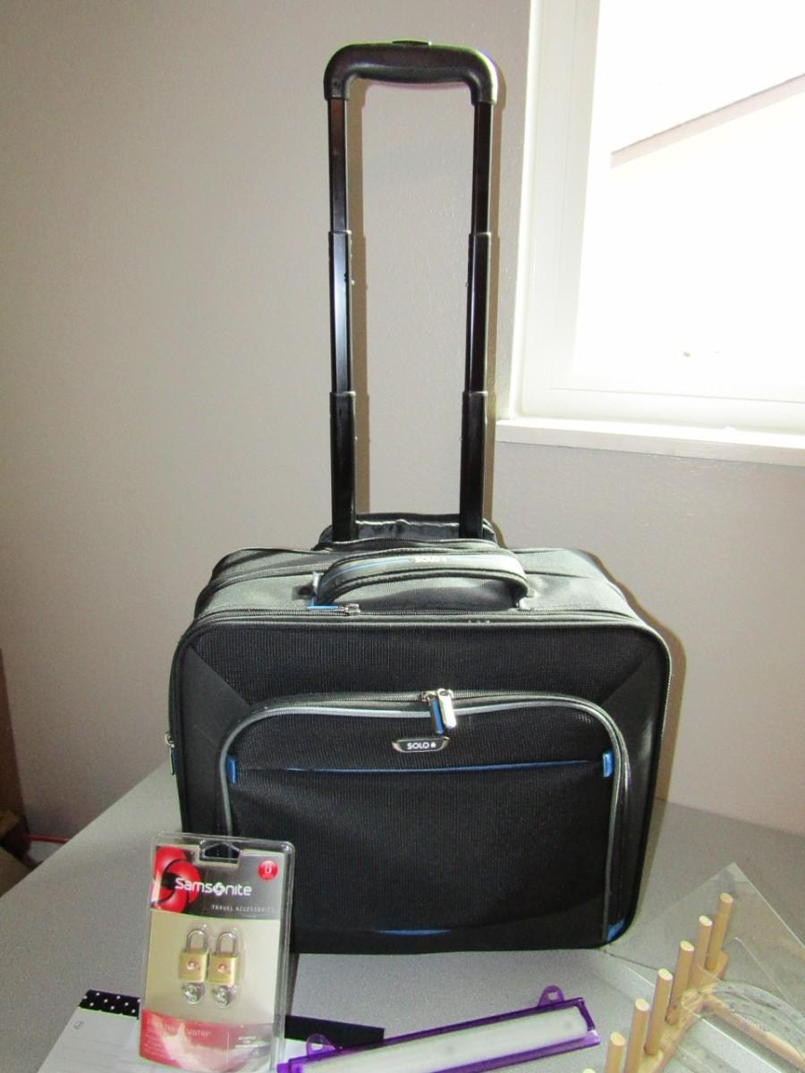 SOLO CLASSIC ROLLING CASE, SAMSONITE LOCKS, WOODEN DIVIDER, AND SCHOOL SUPPLIES