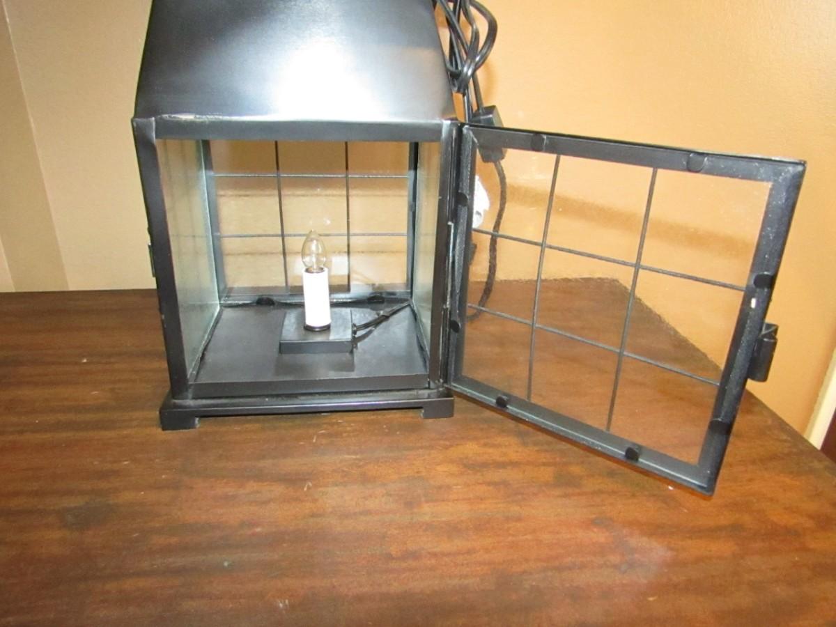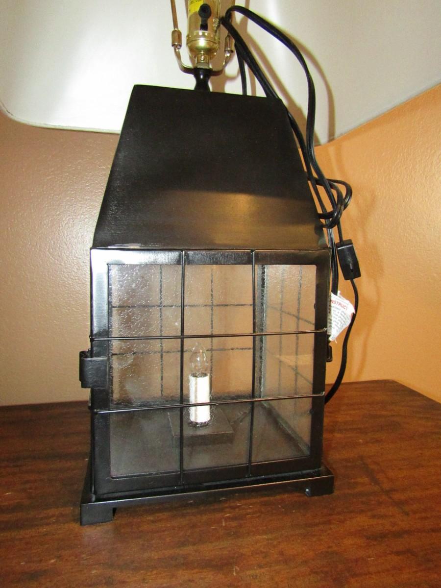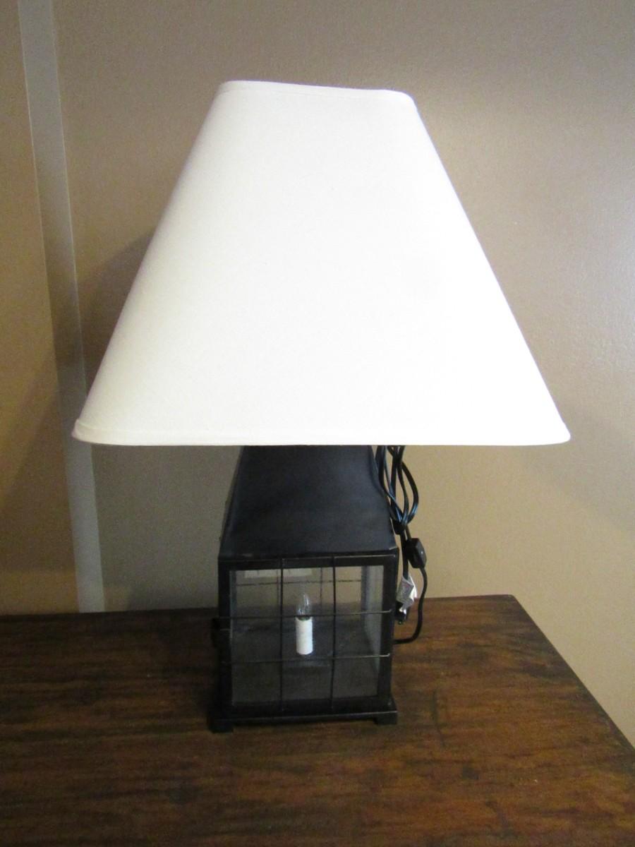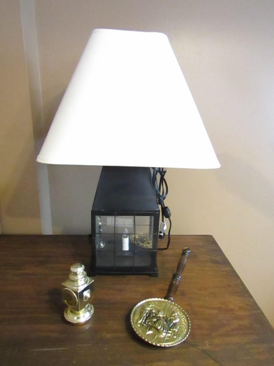 DOUBLE LIGHT TABLE LAMP WITH A SMALL BULB LOCATED INSIDE A GLASS-PANELED BOX AND A REGULAR BULB FITS ON THE TOP