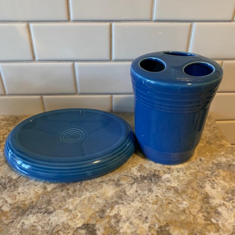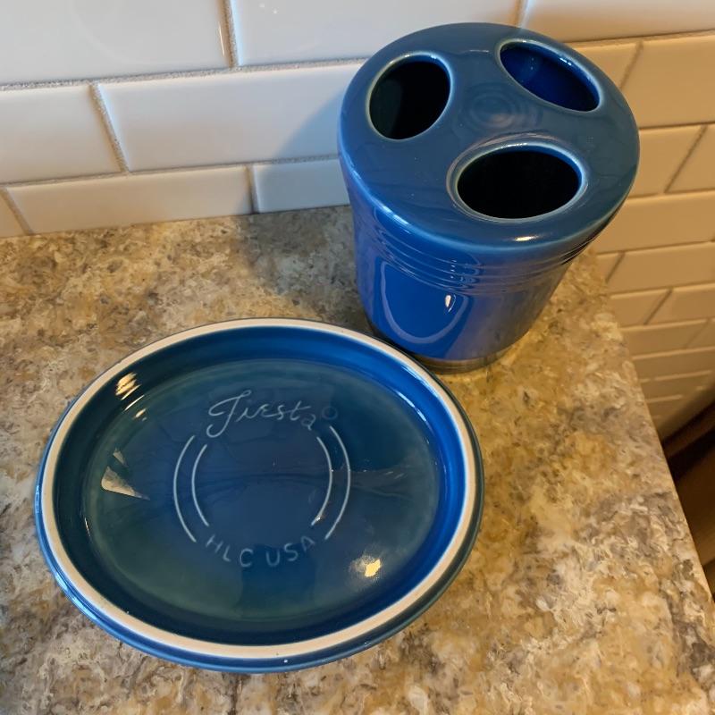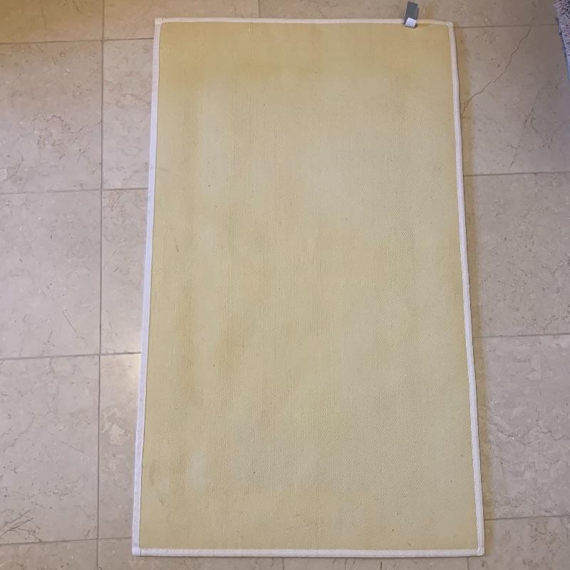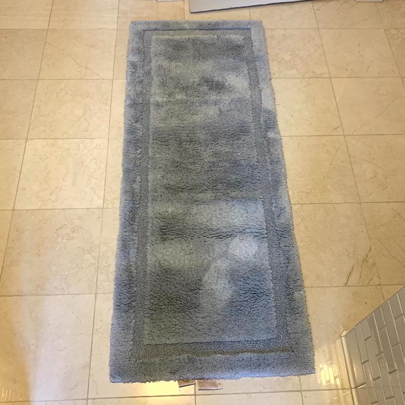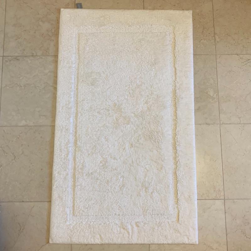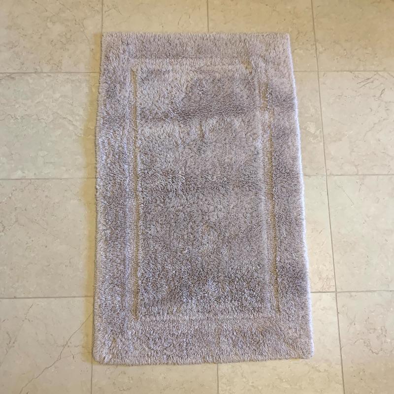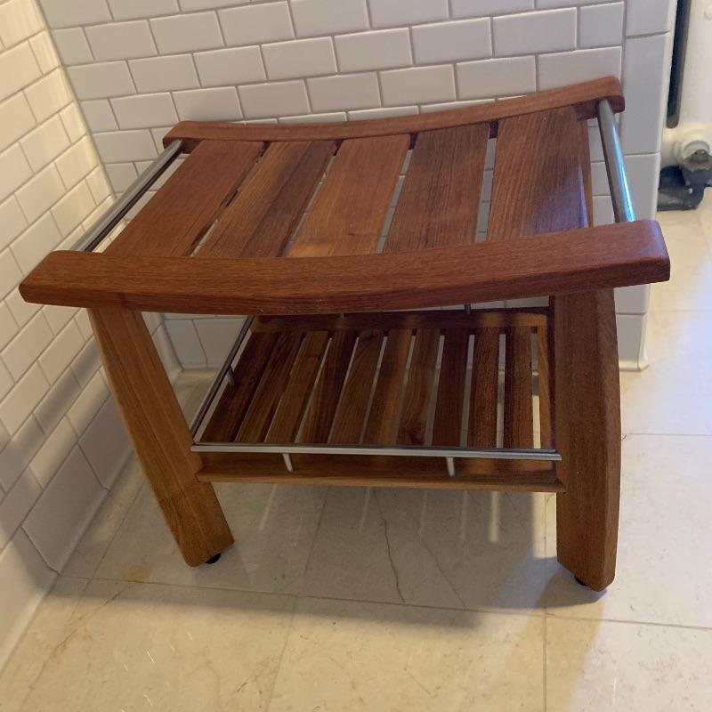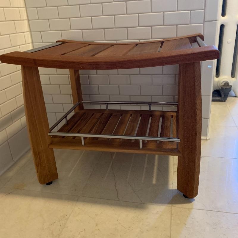 This lot includes a teak wood bath bench (24” x 17” x 18”) with a shelf. There is a slight curvature in the seat. Also included is a ceramic soap dish and toothbrush holder set (Fiesta brand) and four bathroom floor mats. The floor mats are in good condition and vary in length. Items are located on the top floor of the house. Local pickup only.
