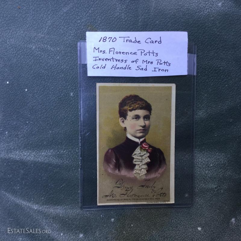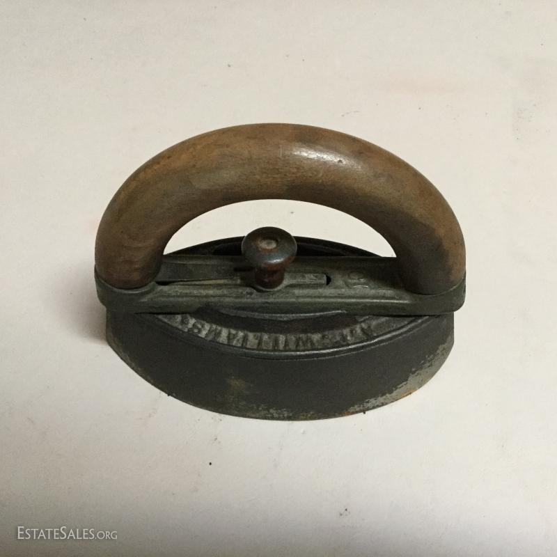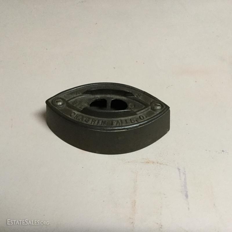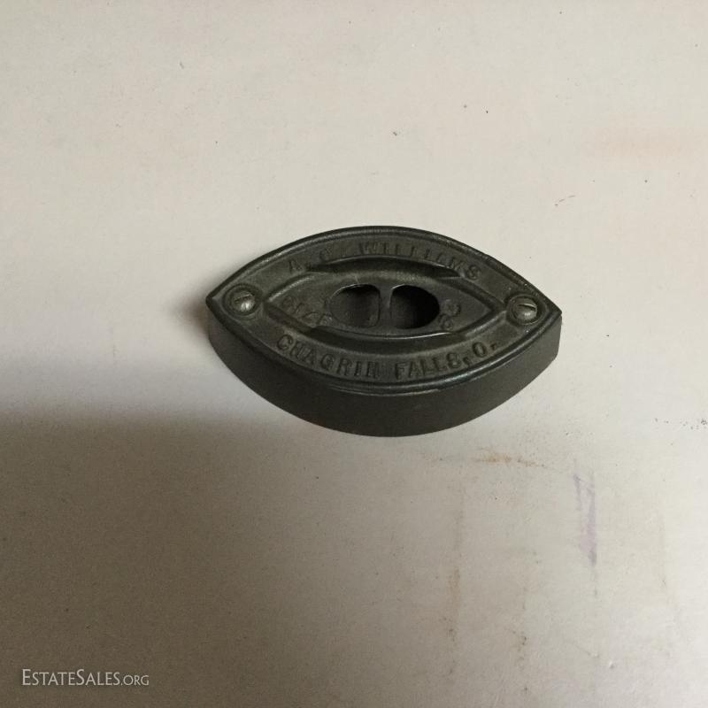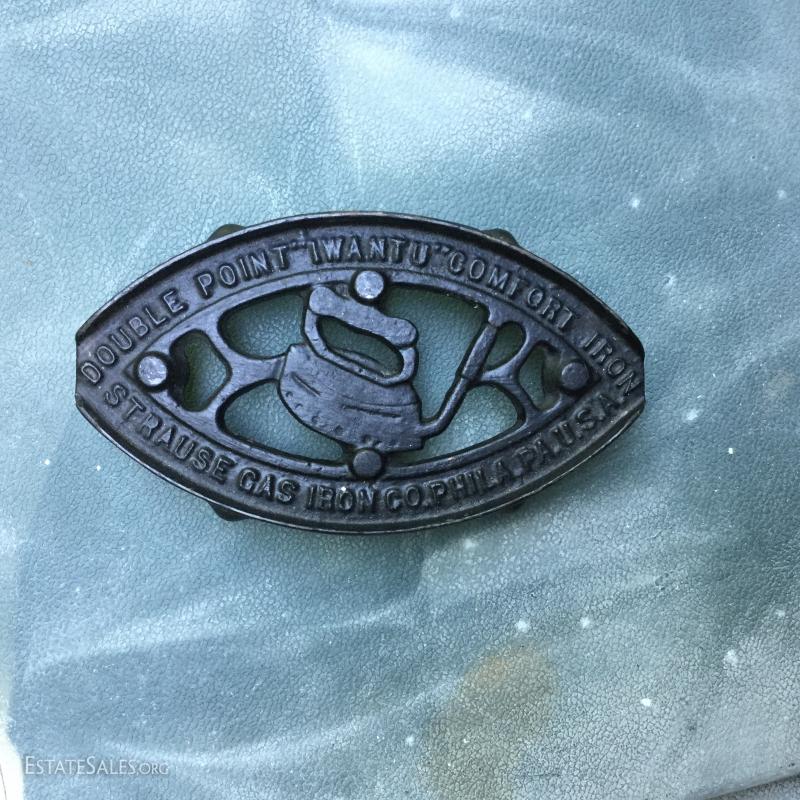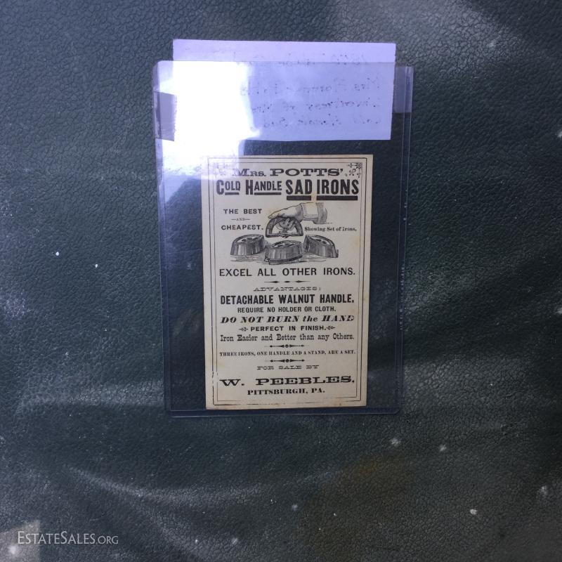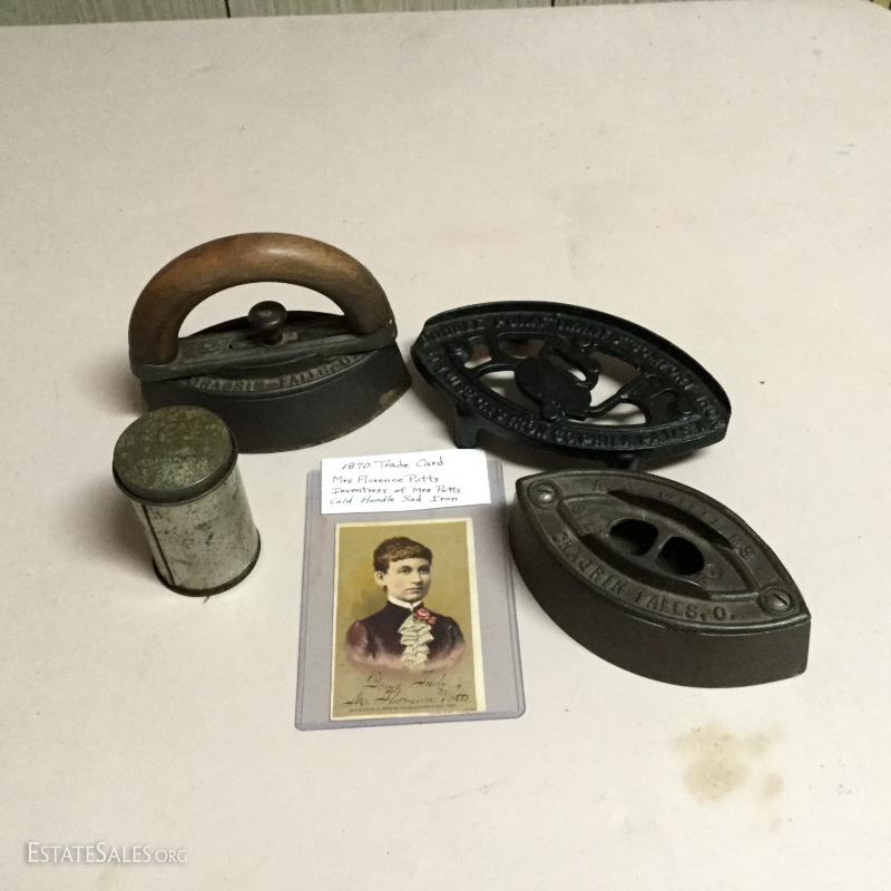 Two antique cold handle sad irons (AC Williams, Chagrin Falls, Ohio) with iron rest. One handle, two irons. The handle fits on both irons. Iron rest made by Strauss Cast Iron Co, Philadelphia, PA. Also includes 1870 Trading Card of Mrs. Florence Pitts (inventor of iron).