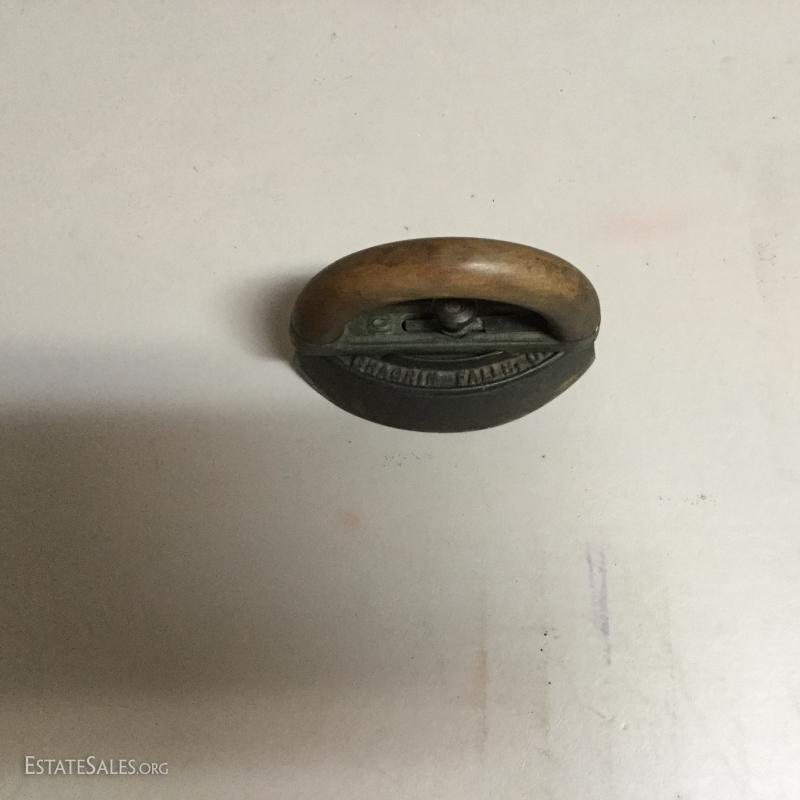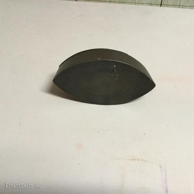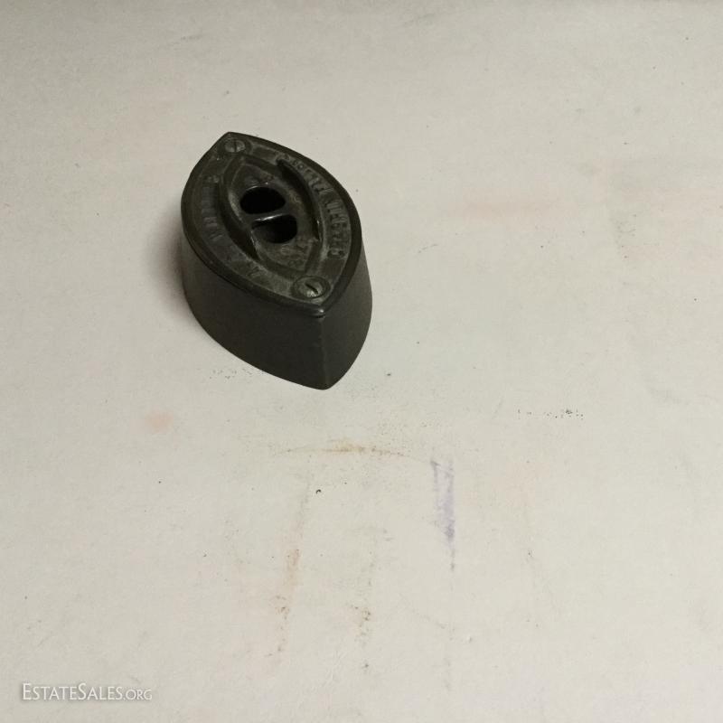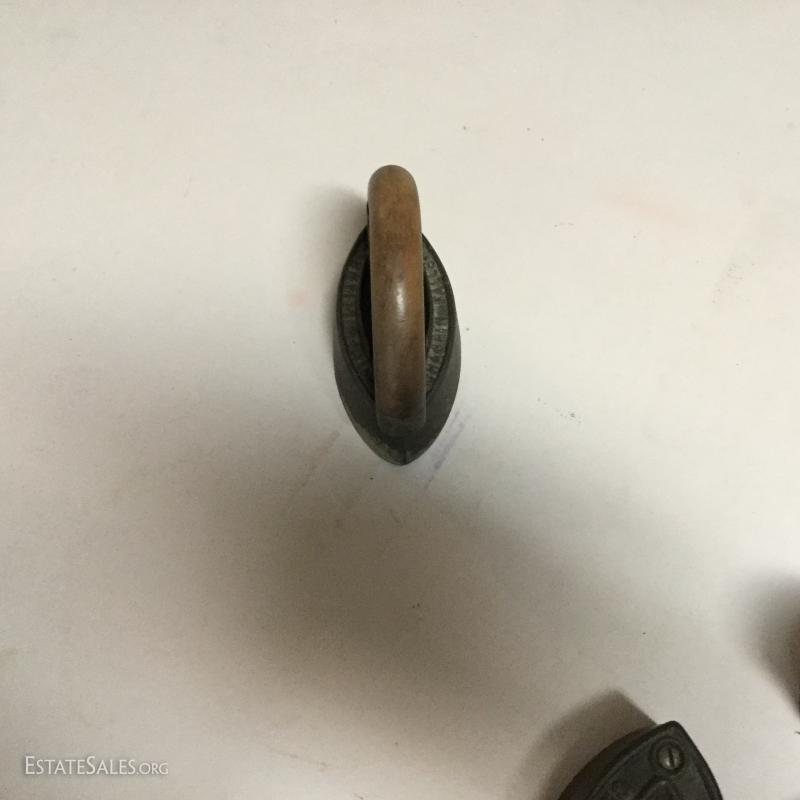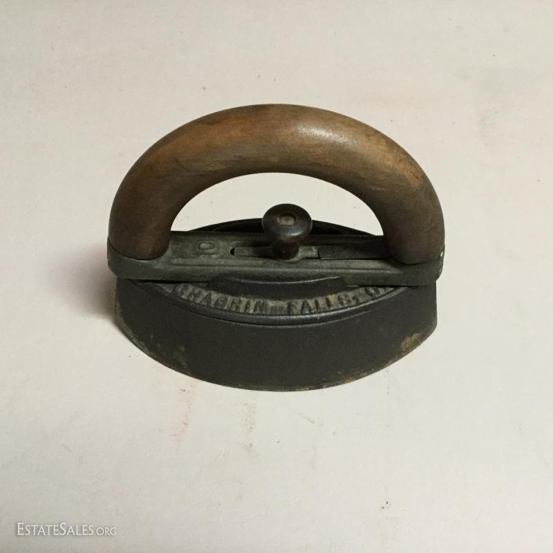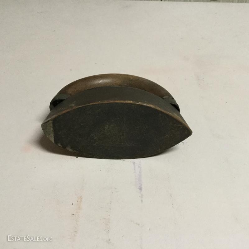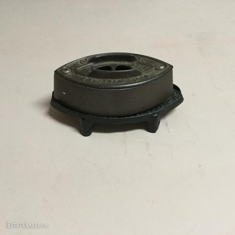 Two antique cold handle sad irons (AC Williams, Chagrin Falls, Ohio) with iron rest. One handle, two irons. The handle fits on both irons. Iron rest made by Strauss Cast Iron Co, Philadelphia, PA. Also includes 1870 Trading Card of Mrs. Florence Pitts (inventor of iron).