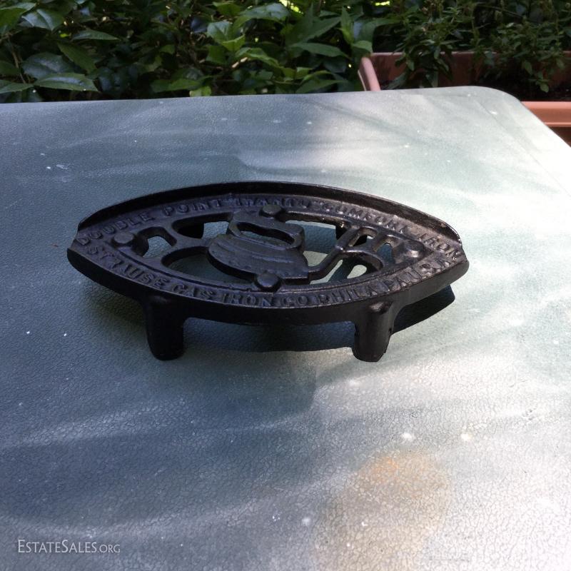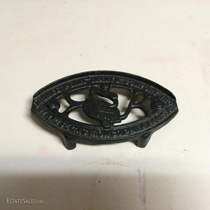Lot 121- Two Cast Irons, Iron Rest and Trading Card