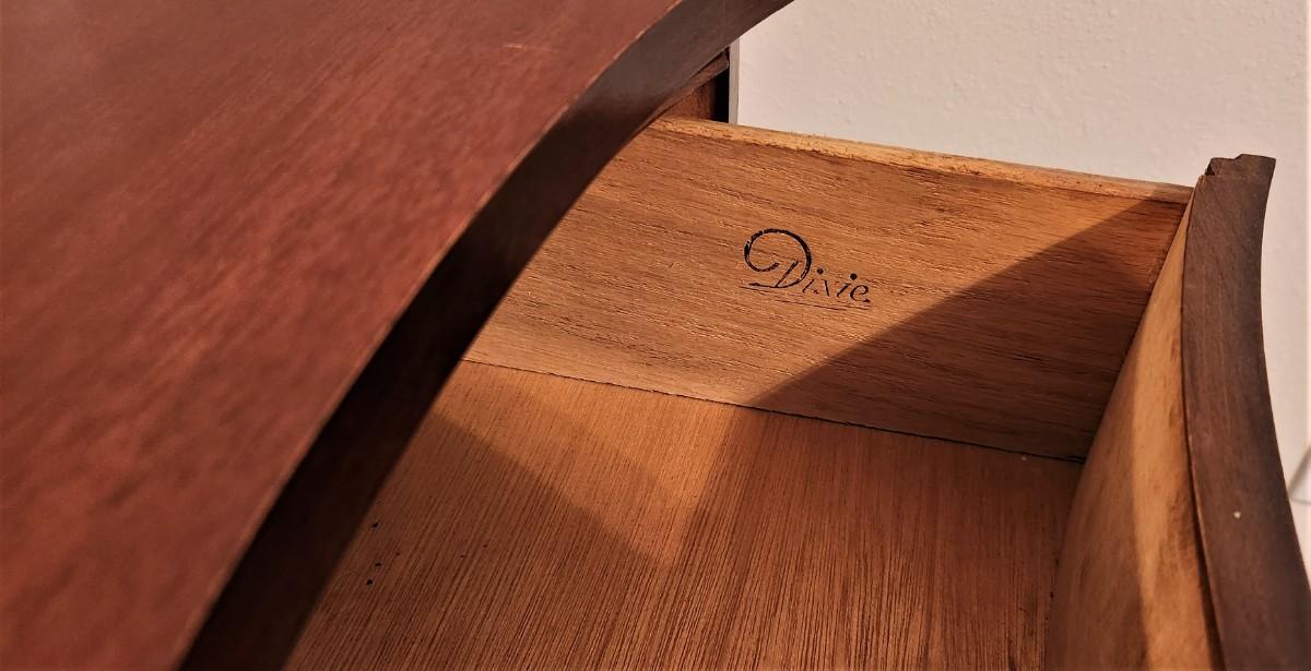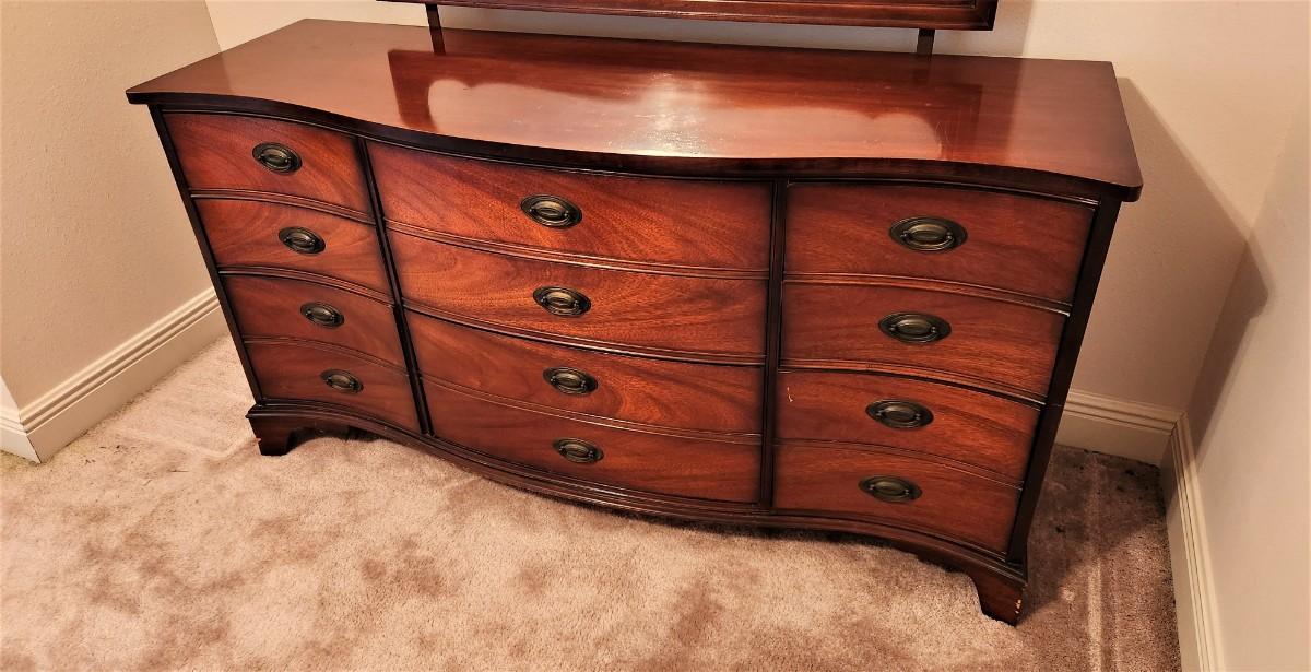 Handsome vintage DIXIE furniture company dresser - 12 drawers, clean. Mirror is removeable. 60.5" across, mirror 45.5" across, 19" deep, 31" tall. Piece is 64.5" with mirror. Overall great condition - couple of dings at the foot, as shown.