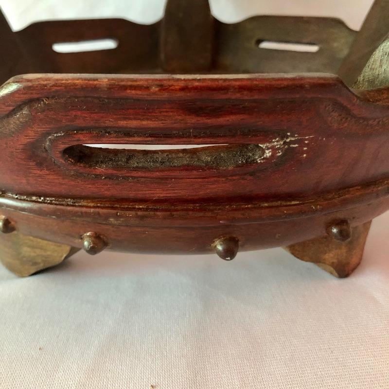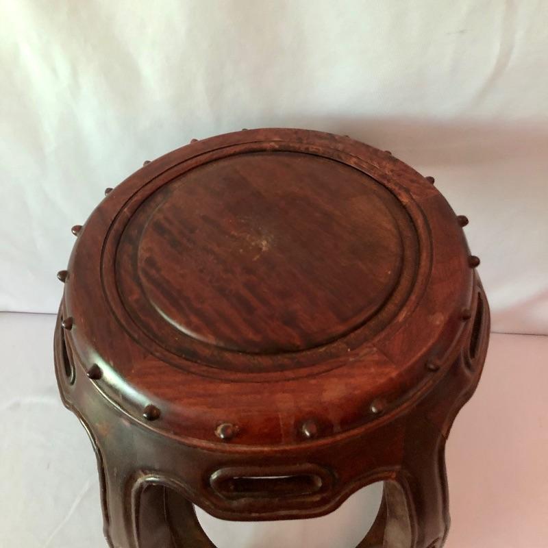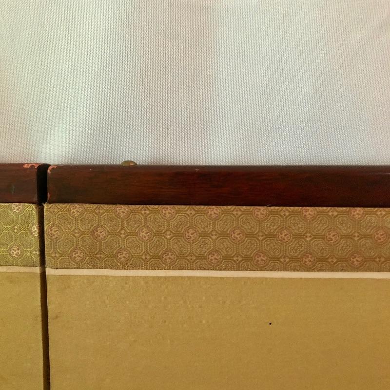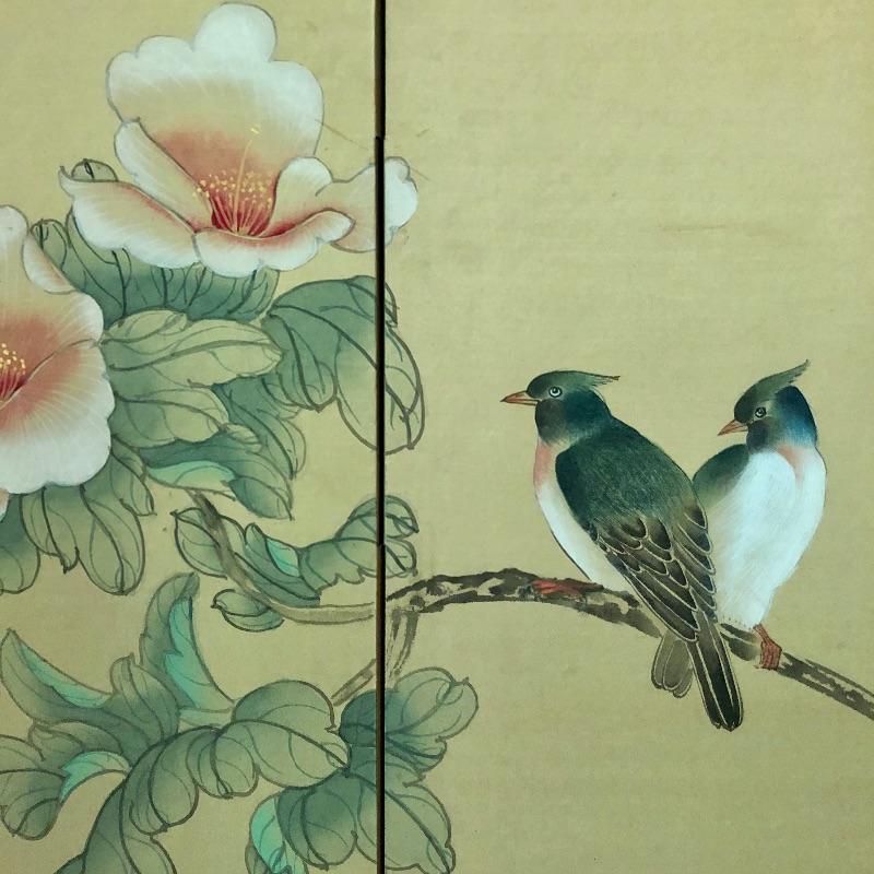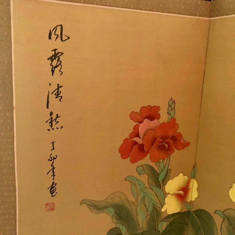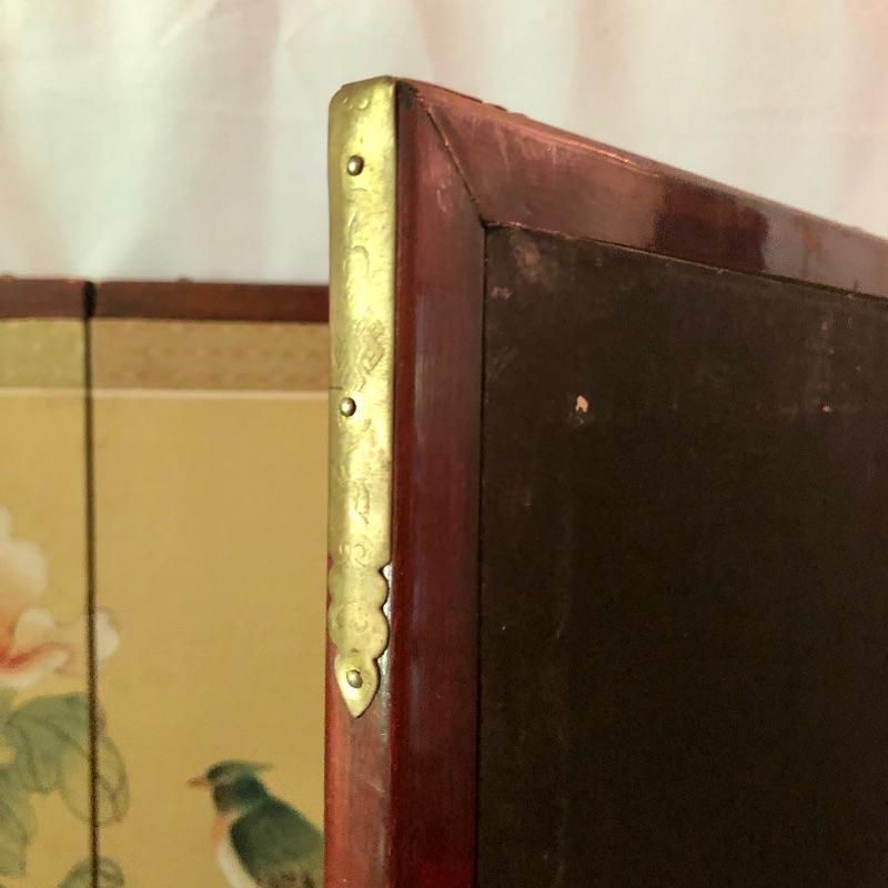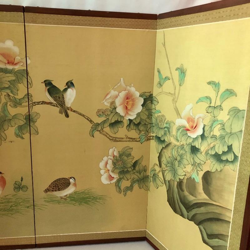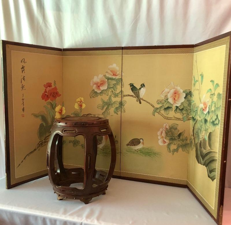 This exquisite Oriental silk screen is a delight to behold! Encased in a solid dark wood frame with brass accents, it has four panels with birds and flowers set upon a pale green background. It appears to be signed and measures 3/4” thick, 70” wide and 35” tall. We have paired this beauty with a carved wood stool that also has an Oriental flair. This could be a seat or with its flat top, a plant stand. It measures 19” W x 19”H with a 12” diameter top.
