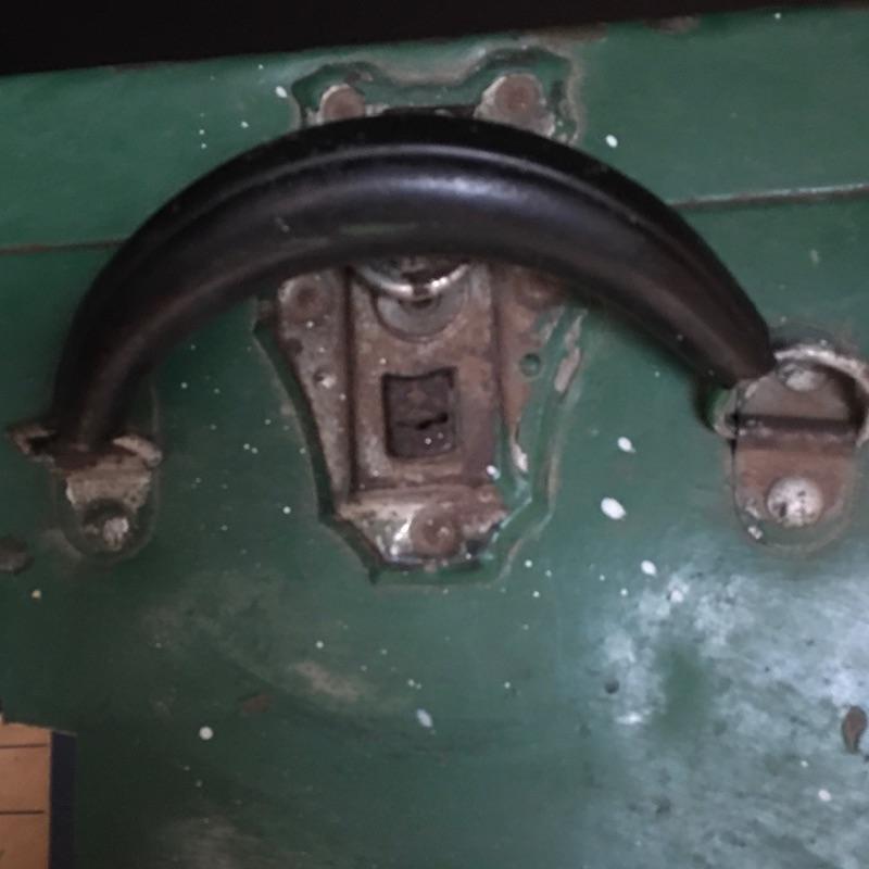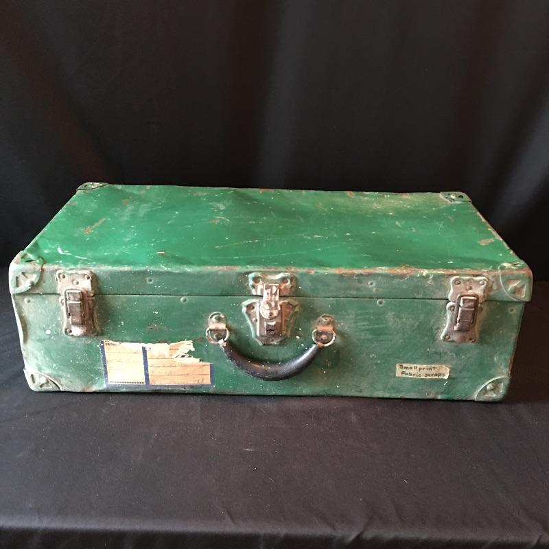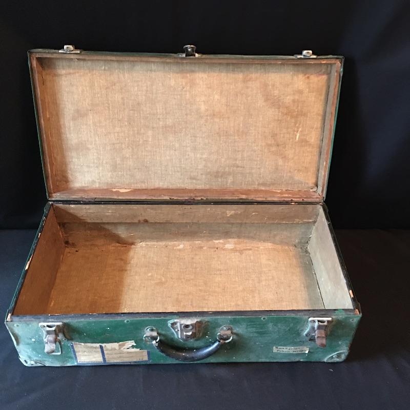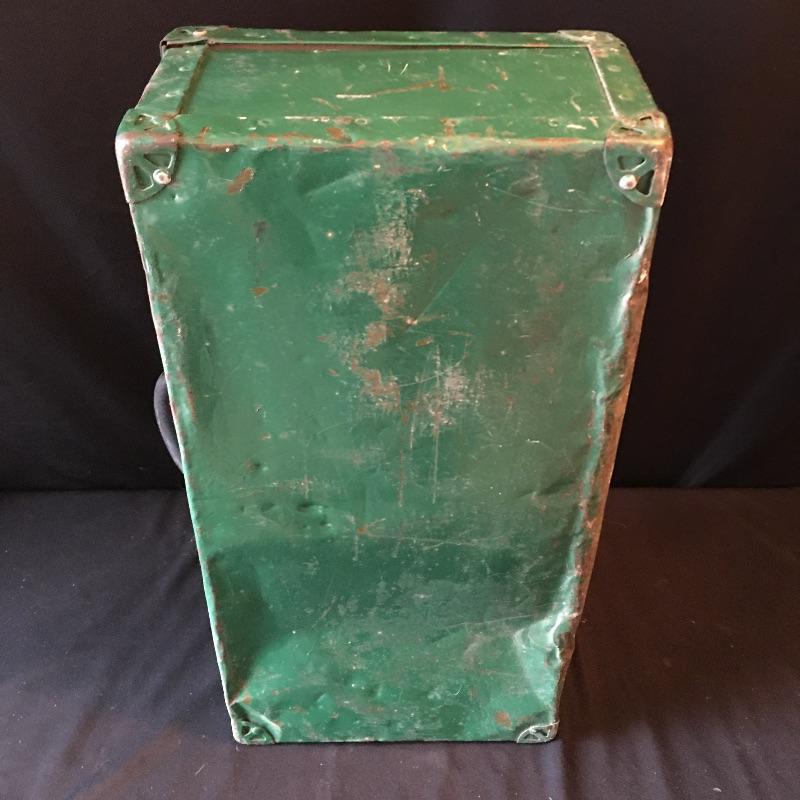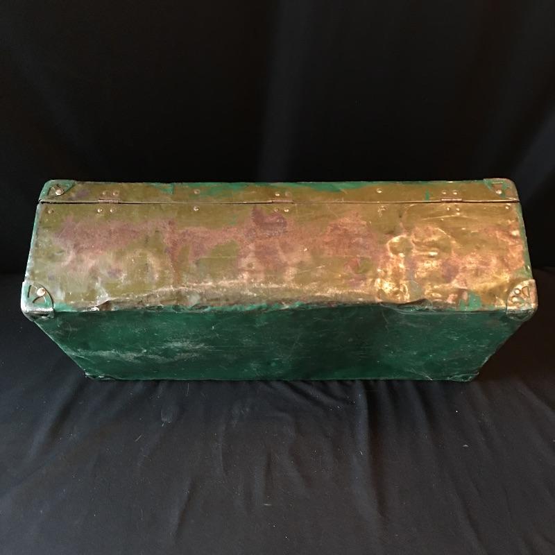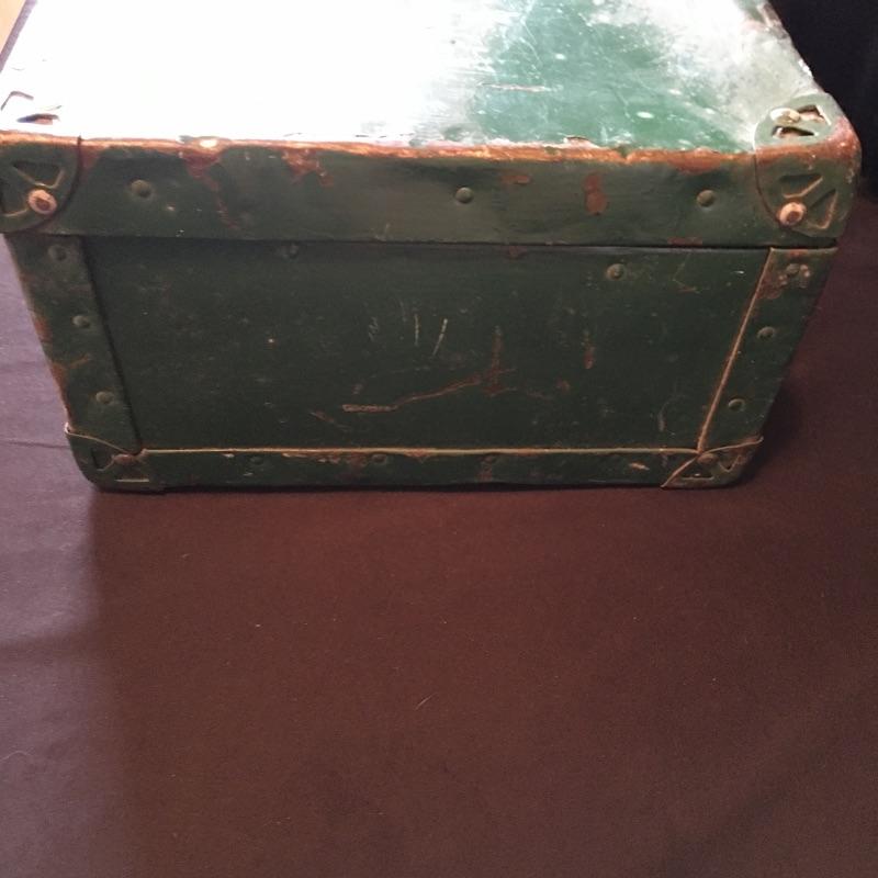 Vintage small green metal trunk. This trunk has dents and scratches that add to its allure. Great for your home for creative storage or on top of your vintage car or bus! Trunk measures 12.25” x 24.25” x 6.75”. Shipping available.