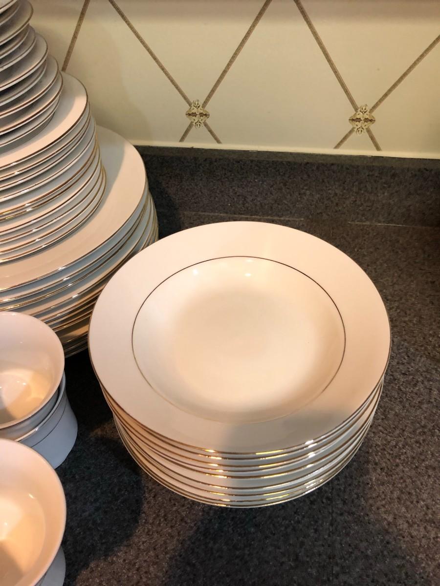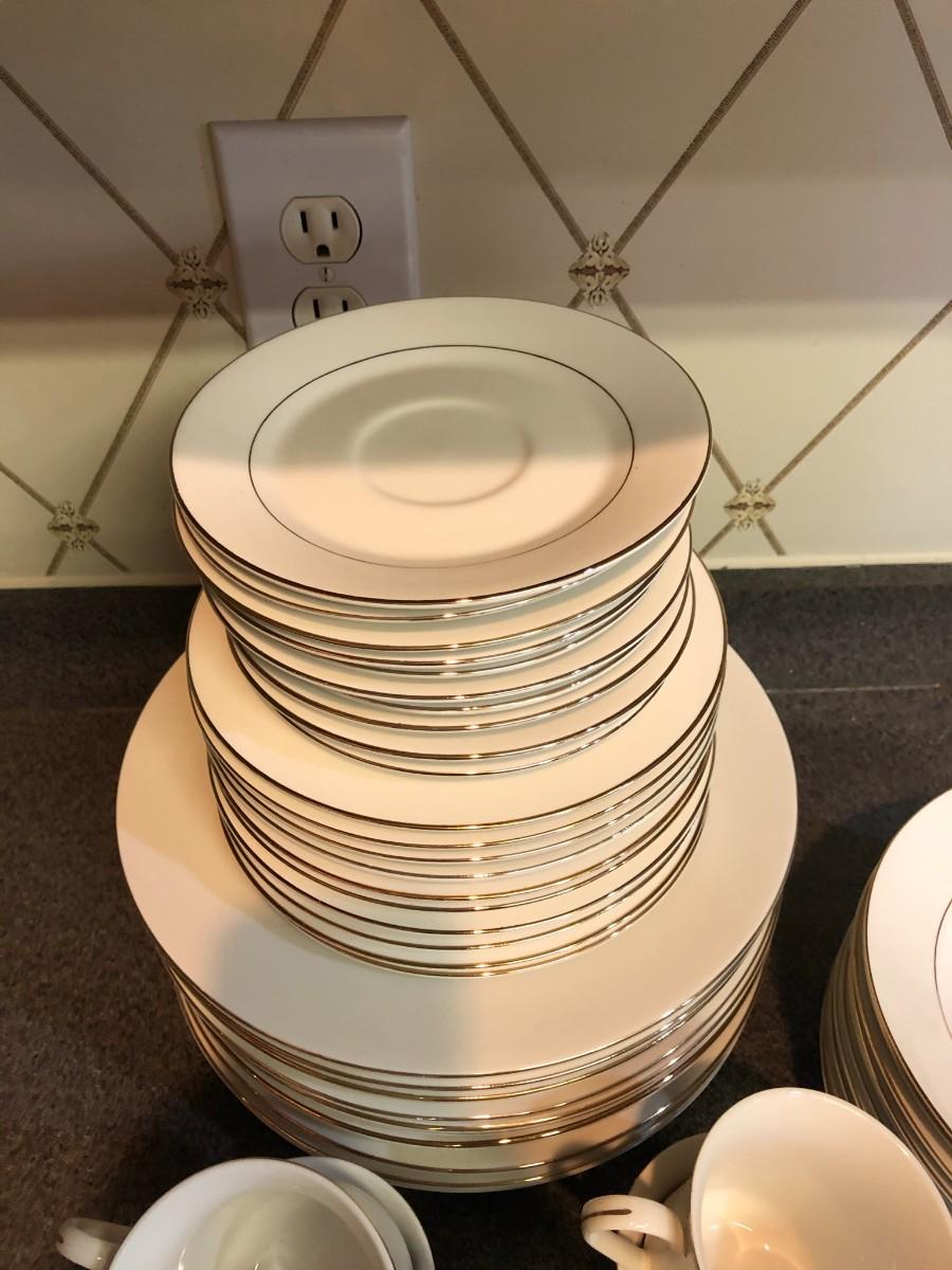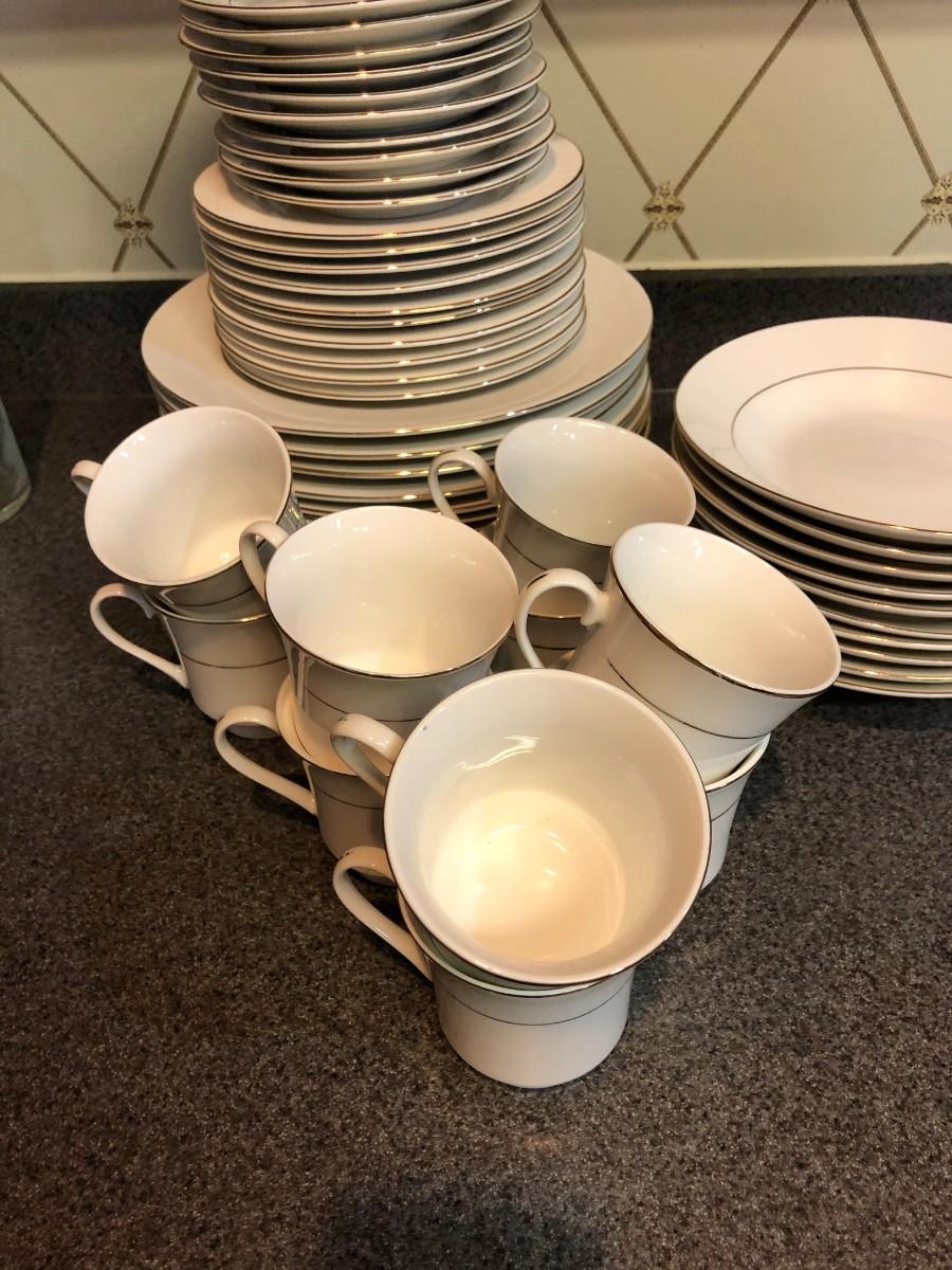 There are (10) each of dinner plates, cups, saucers, bowls, and salad plates.