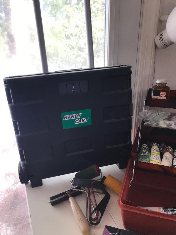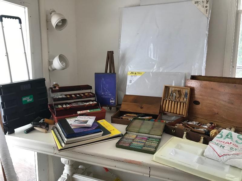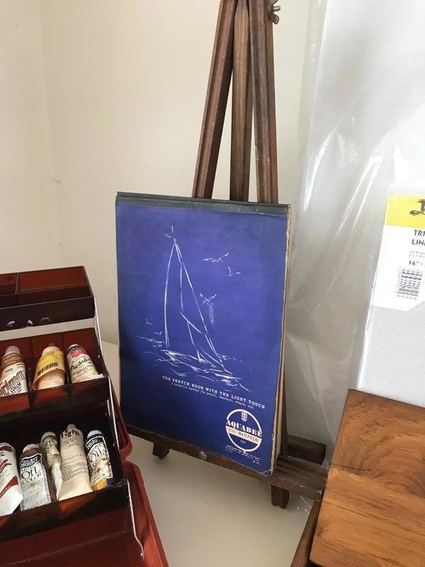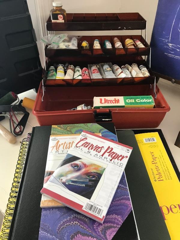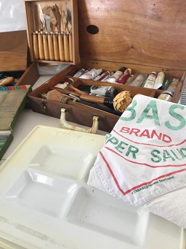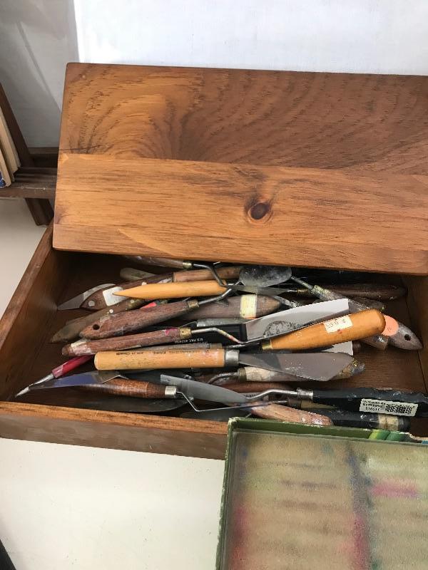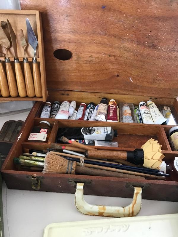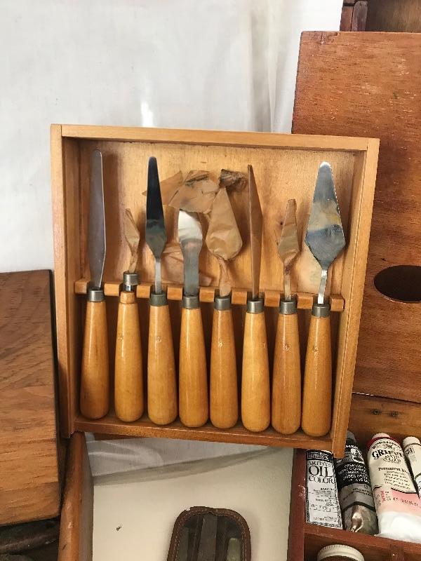 Three wood boxes, paper, paint, brushes, Palette tools pastels, apron, paint trays