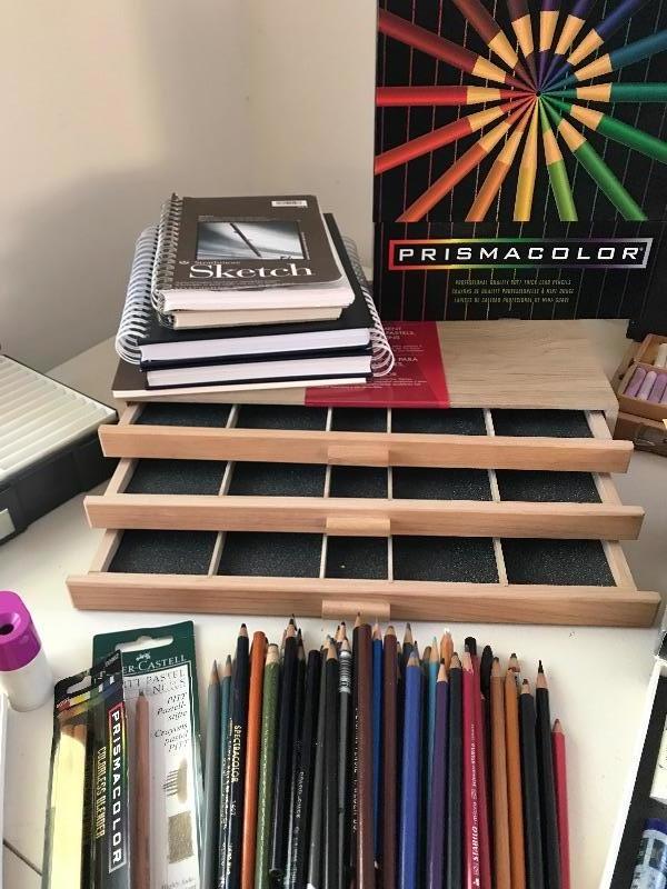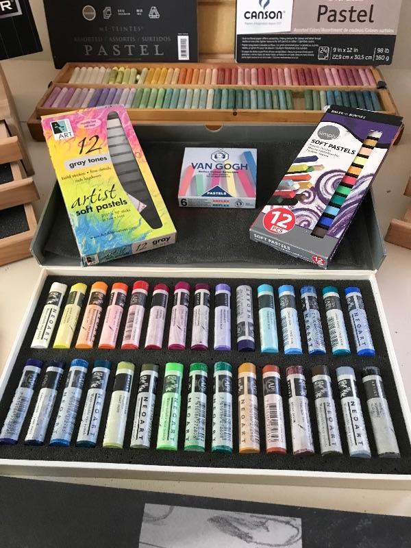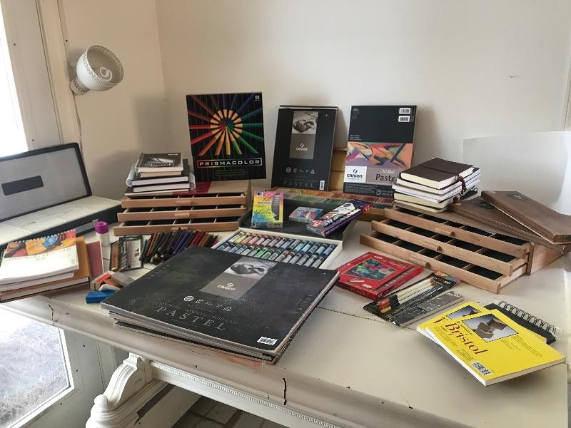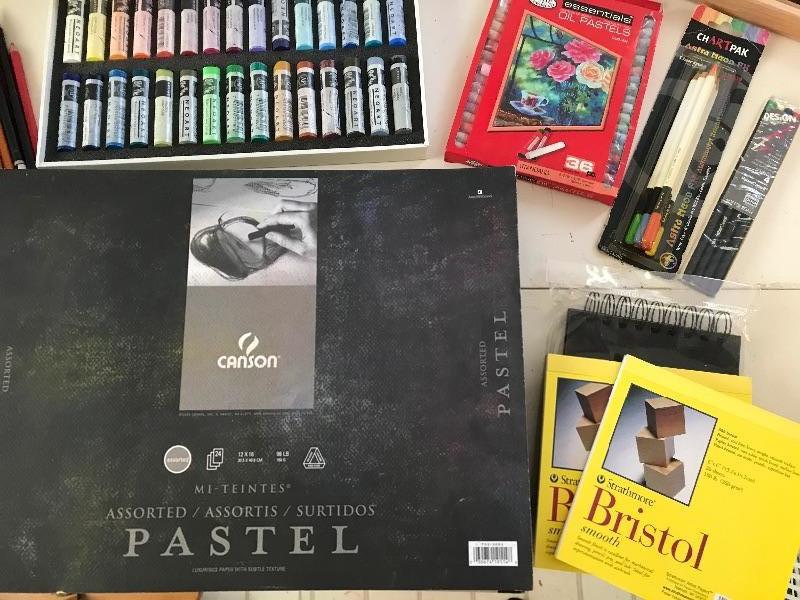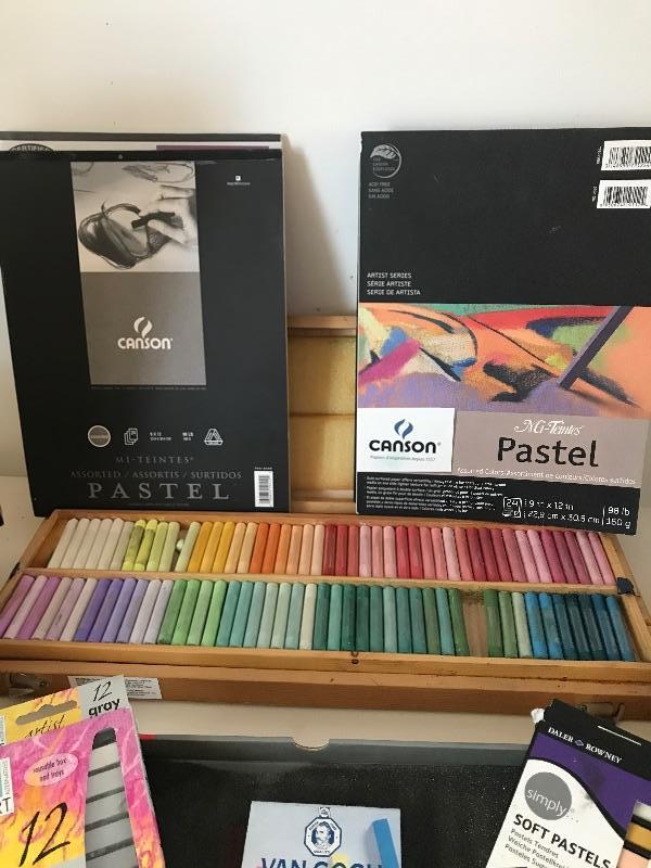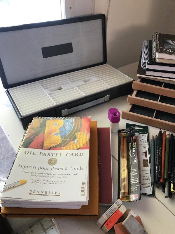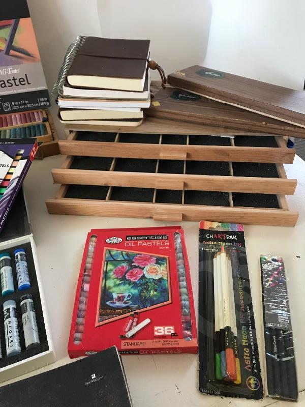 Many pastels , two 3 drawer wooden lined storage boxes, one plastic storage box, plenty pads of paper and pencils