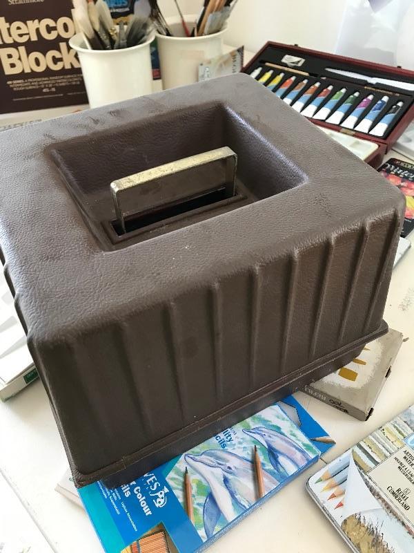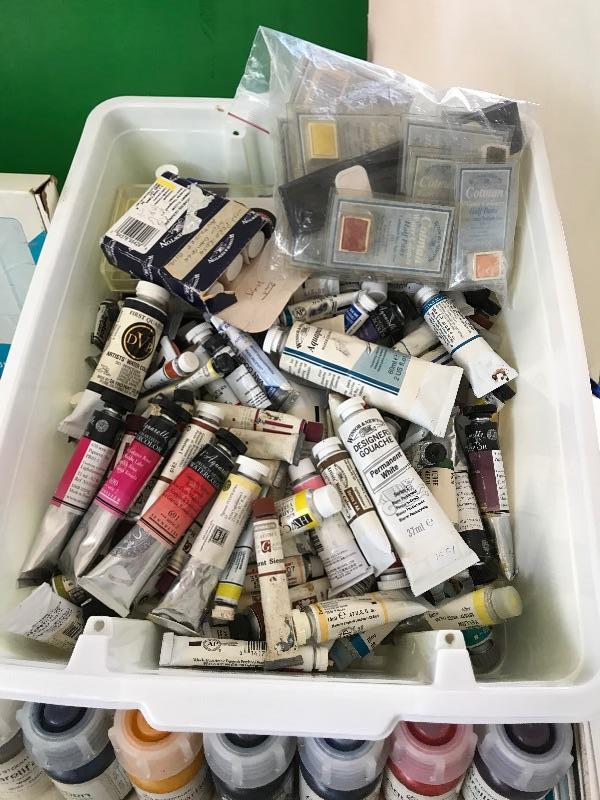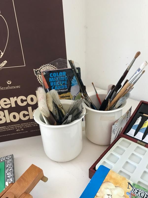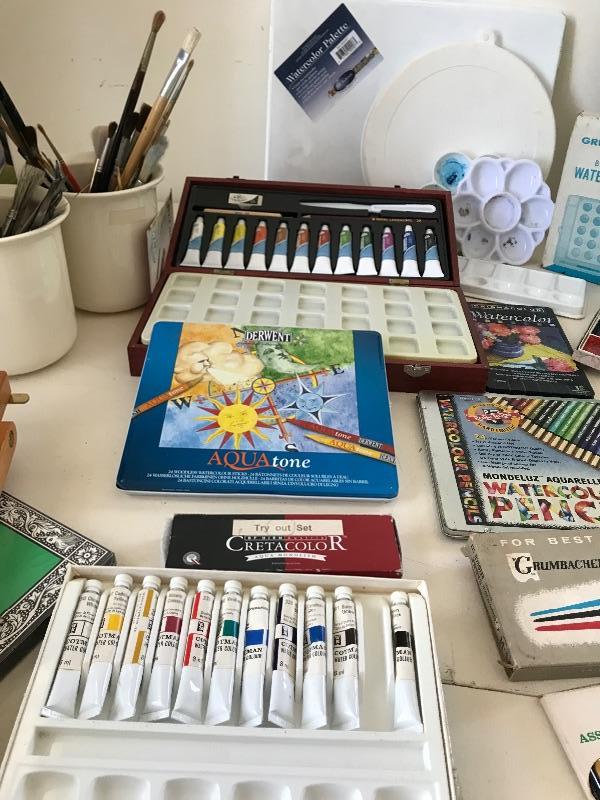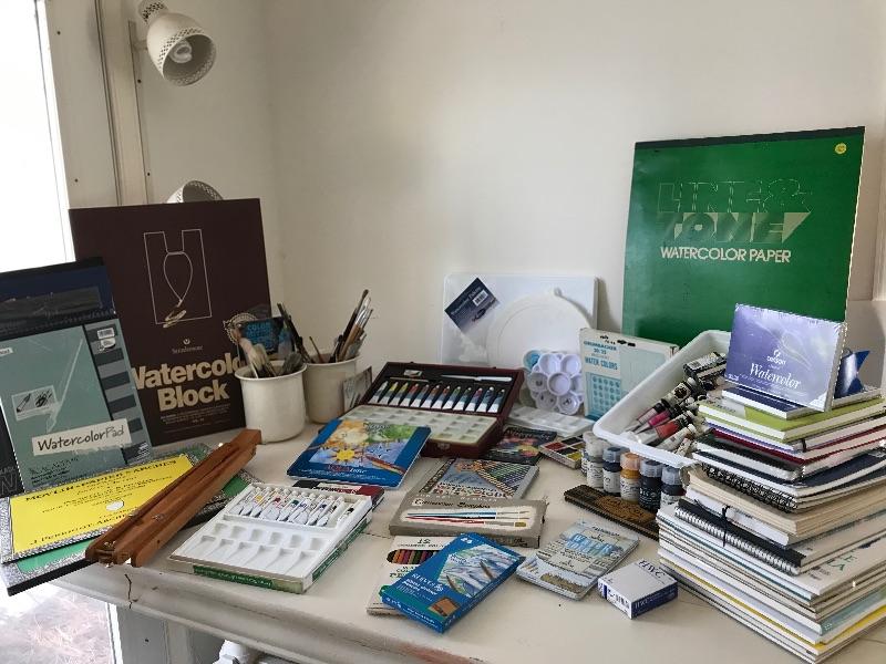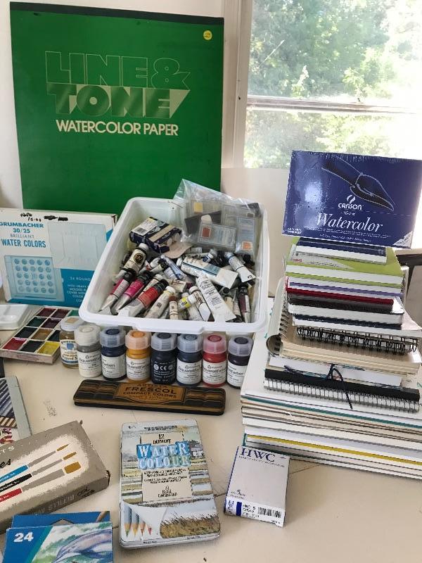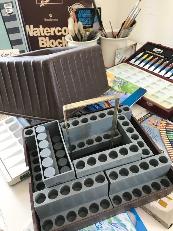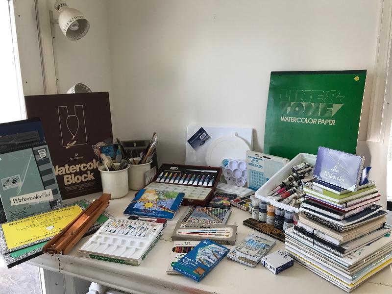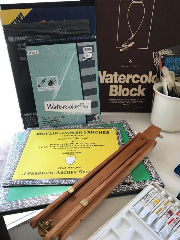 Watercolor paints, storage containers, pencils, paint mixing trays, paper, brushes, & small easel