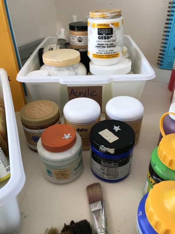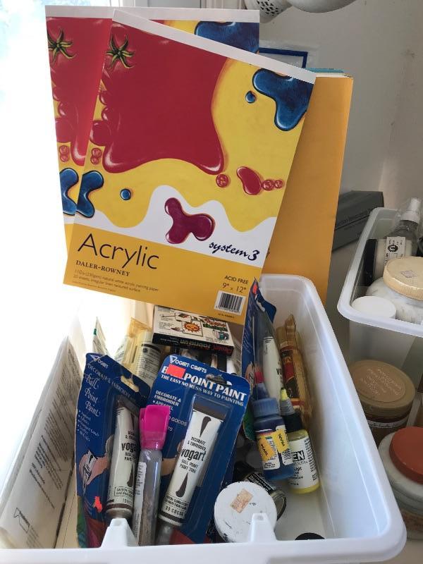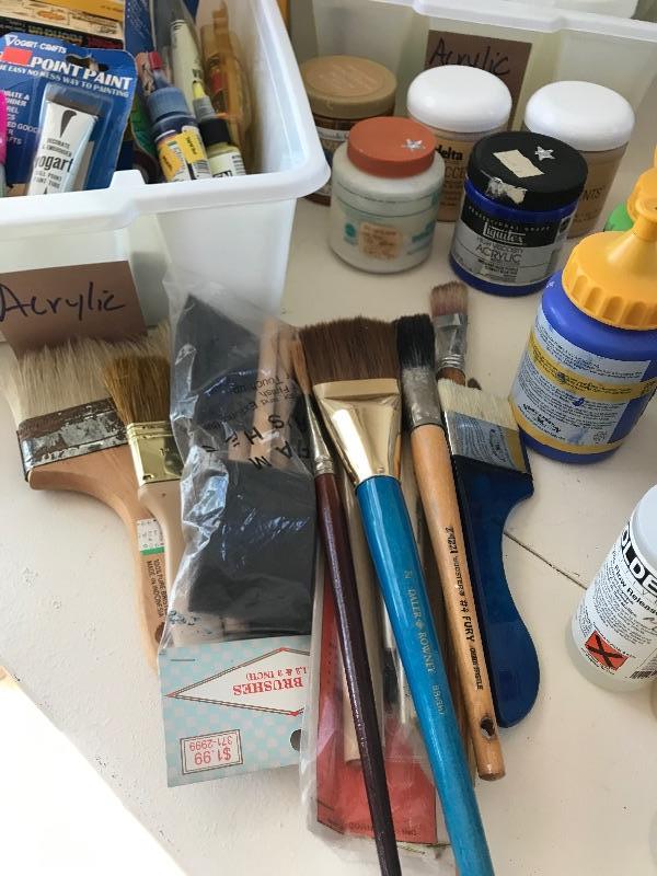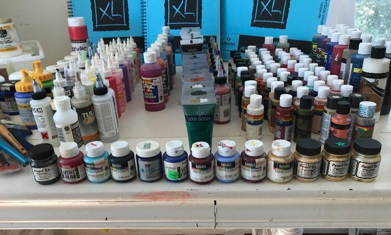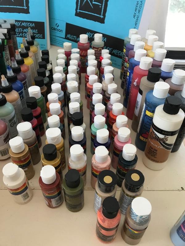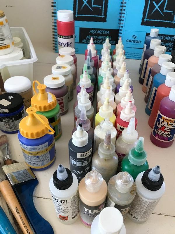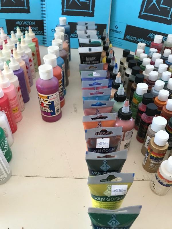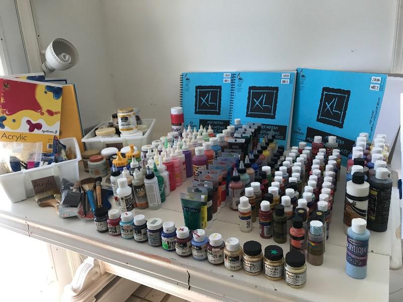 Many different types and brands of acrylic paint, mixed media multi pads of paper, brushes, acid free acrylic pads