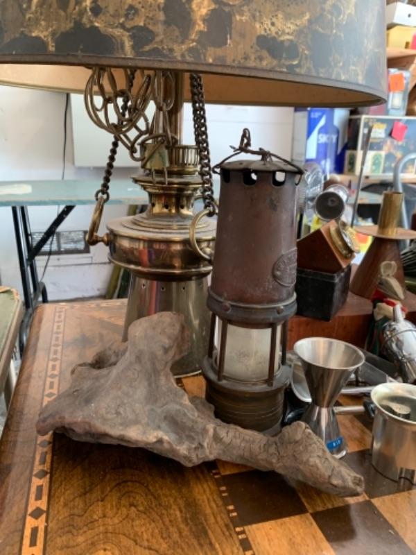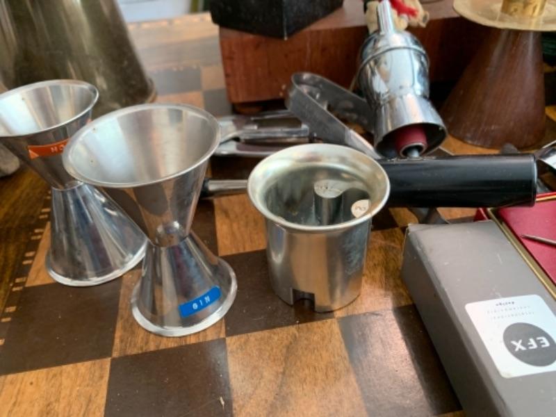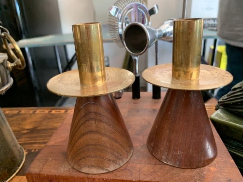 Lot 121D. Lamp with Aramis-style shade, barware, ice bucket, cheese board, slide viewer, copper lantern,  very collectible mid-century candlesticks and more--$200