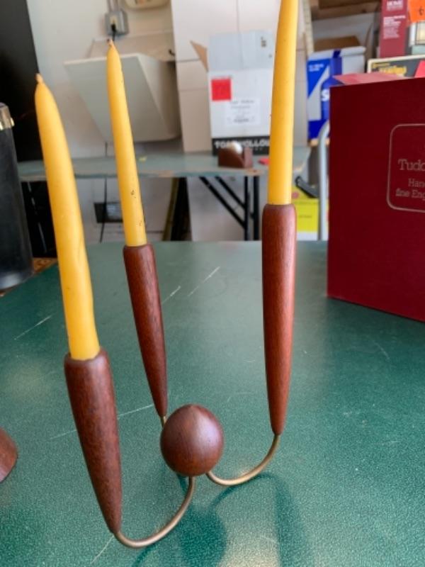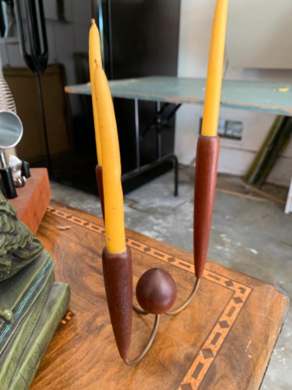 Lot 121D. Lamp with Aramis-style shade, barware, vintage owl bookends, ice bucket, Scrabble game, cheese board, slide viewer, ashtrays, small propane copper lantern, bank money bags and very collectible mid-century candlesticks--Was $395 - $200