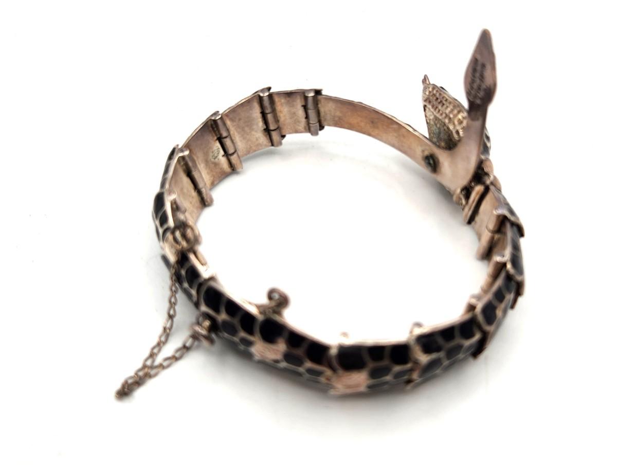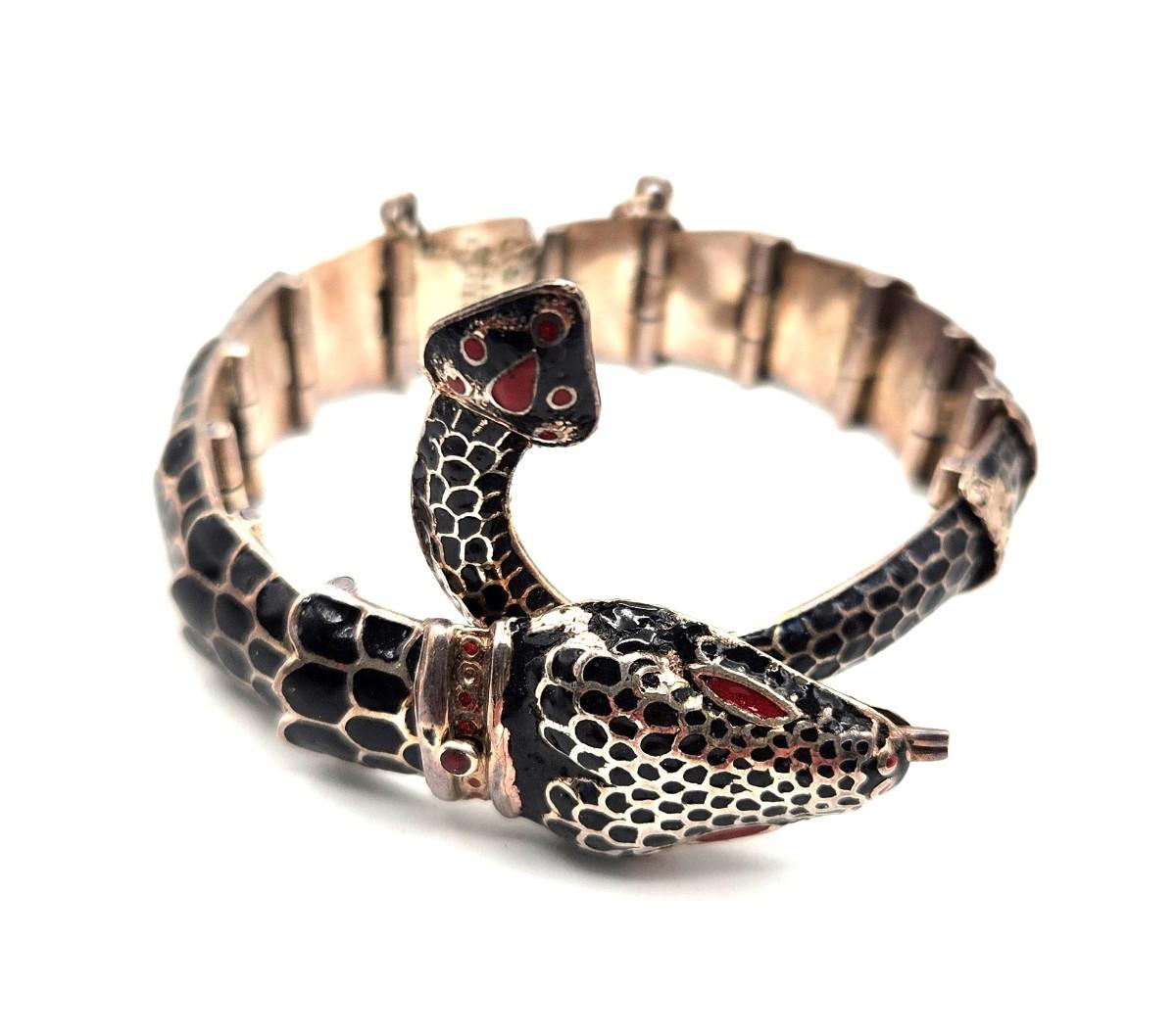 Vintage Reticulated Snake/Serpent bracelet, marked 950 silver - safety chain - red enamel decoration, some small losses. Clasp works fine - generous size, fits most. 1.5 ounces.
