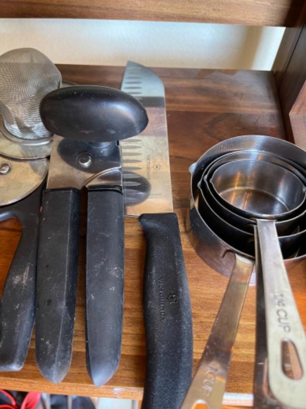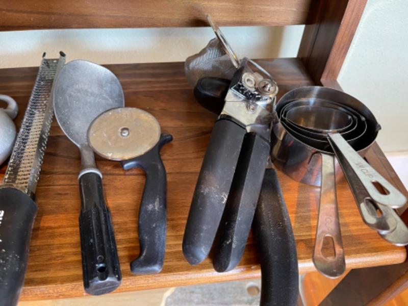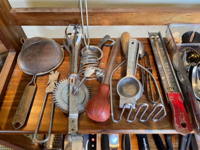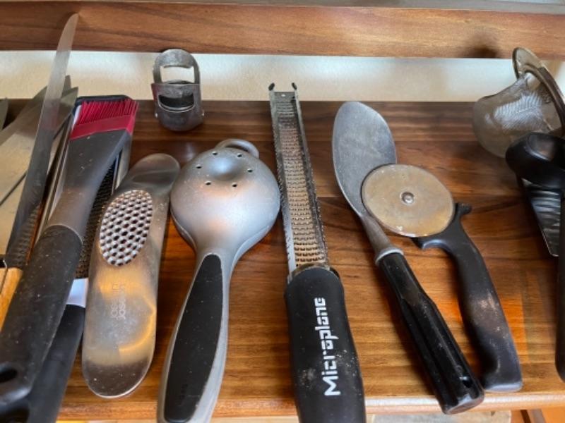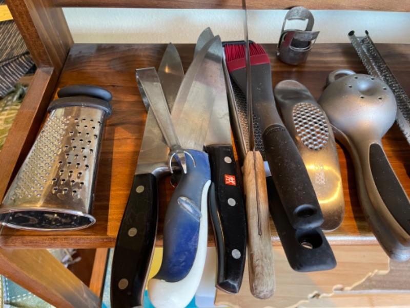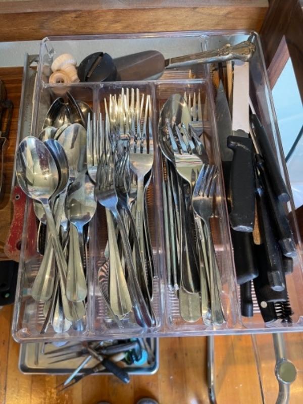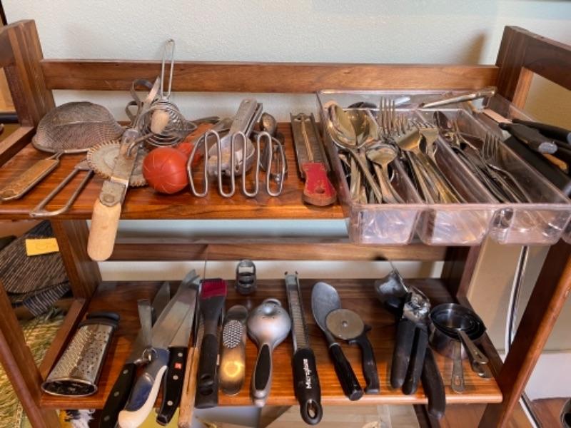 Lot 121K. Assortment of flatware, knives, grates, utensils, etc.--$45