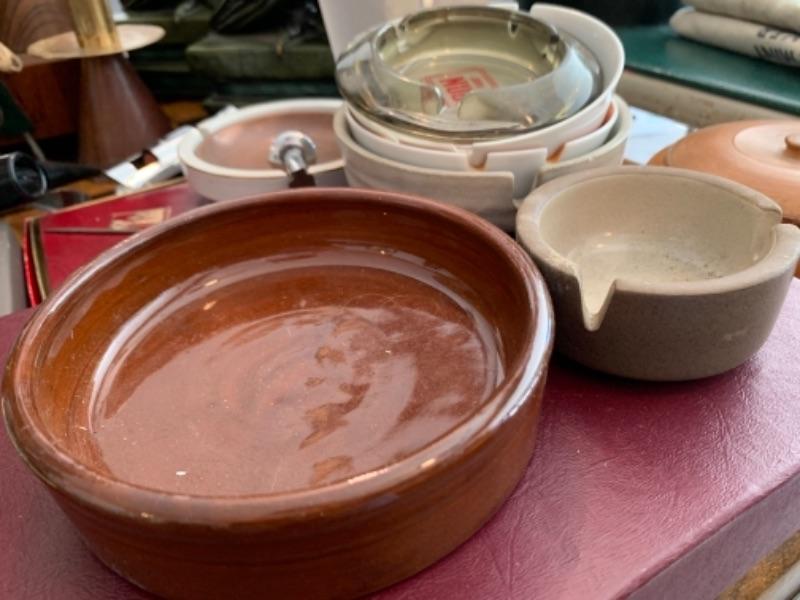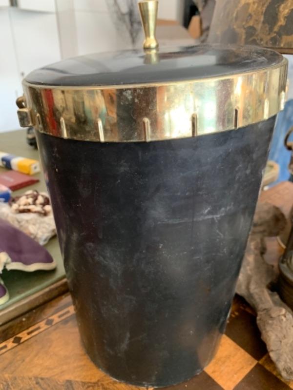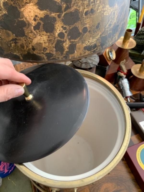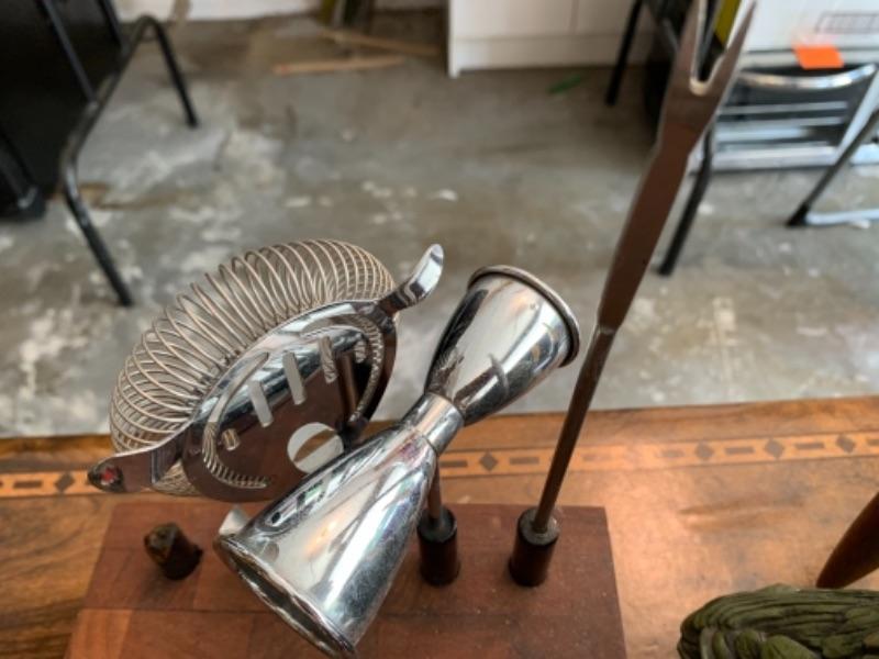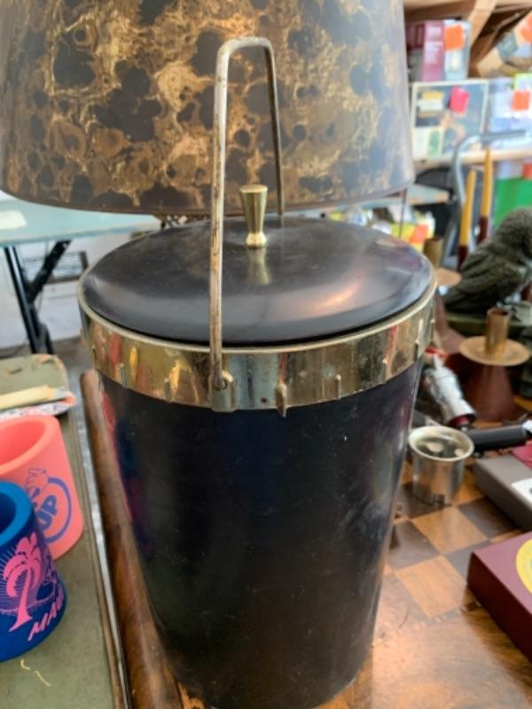 Lot 121.Mid Century home decor: Lamp with Aramis-style shade, barware, vintage bookends, ice bucket, cheese board, slide viewer, ashtrays, copper lantern, and very collectible candlesticks--$395