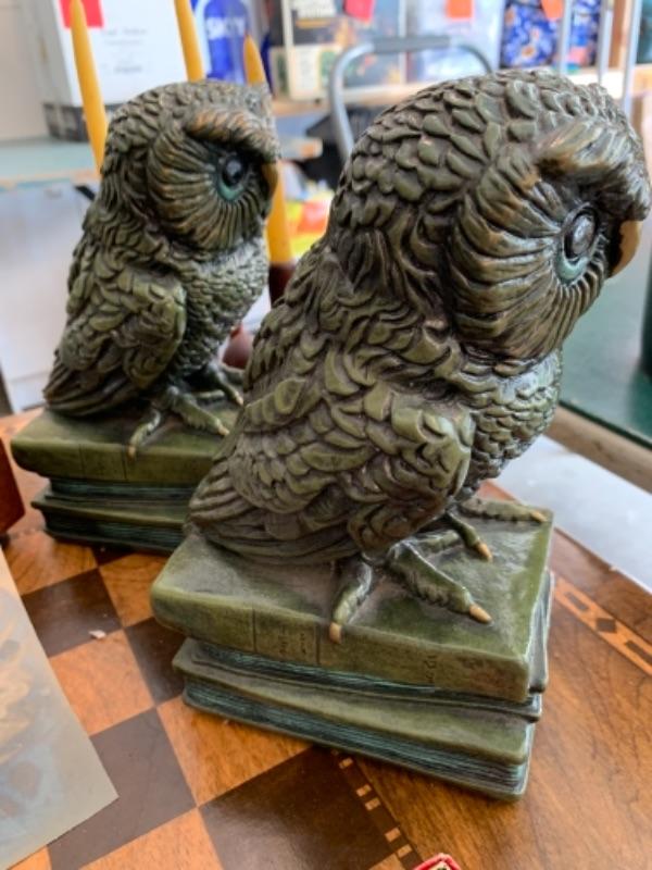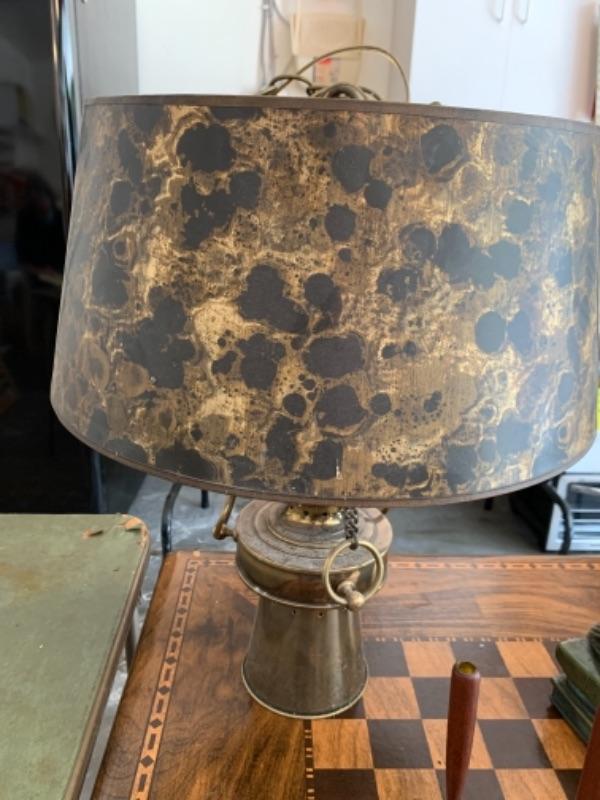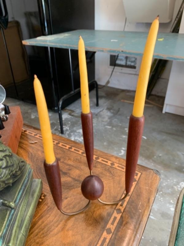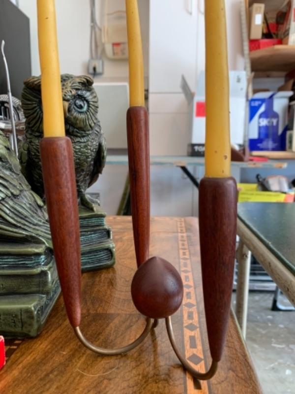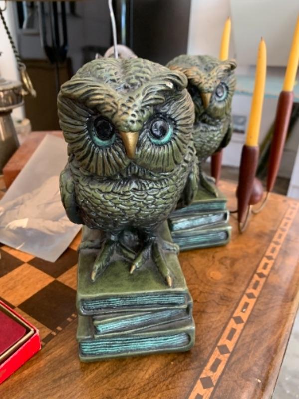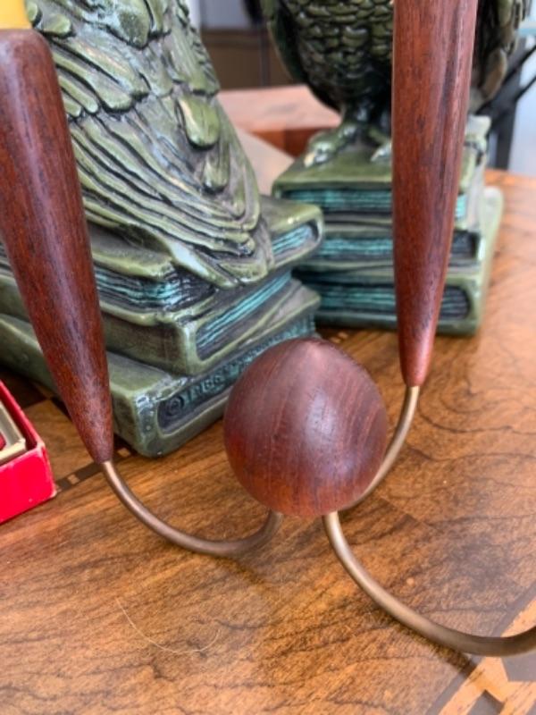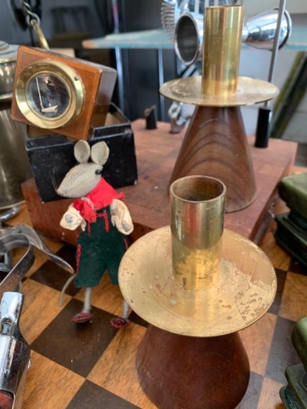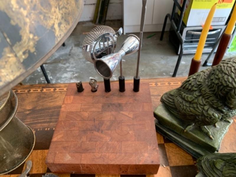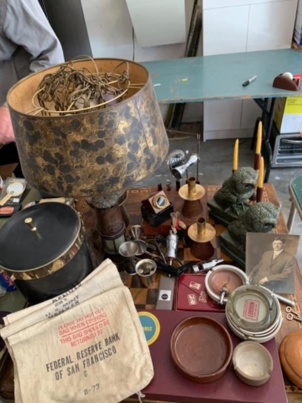 Lot 121. Lamp with Aramis-style shade, barware, vintage owl bookends, ice bucket, Scrabble game, cheese board, slide viewer, ashtrays, small propane copper lantern, bank money bags and very collectible mid-century candlesticks--$395